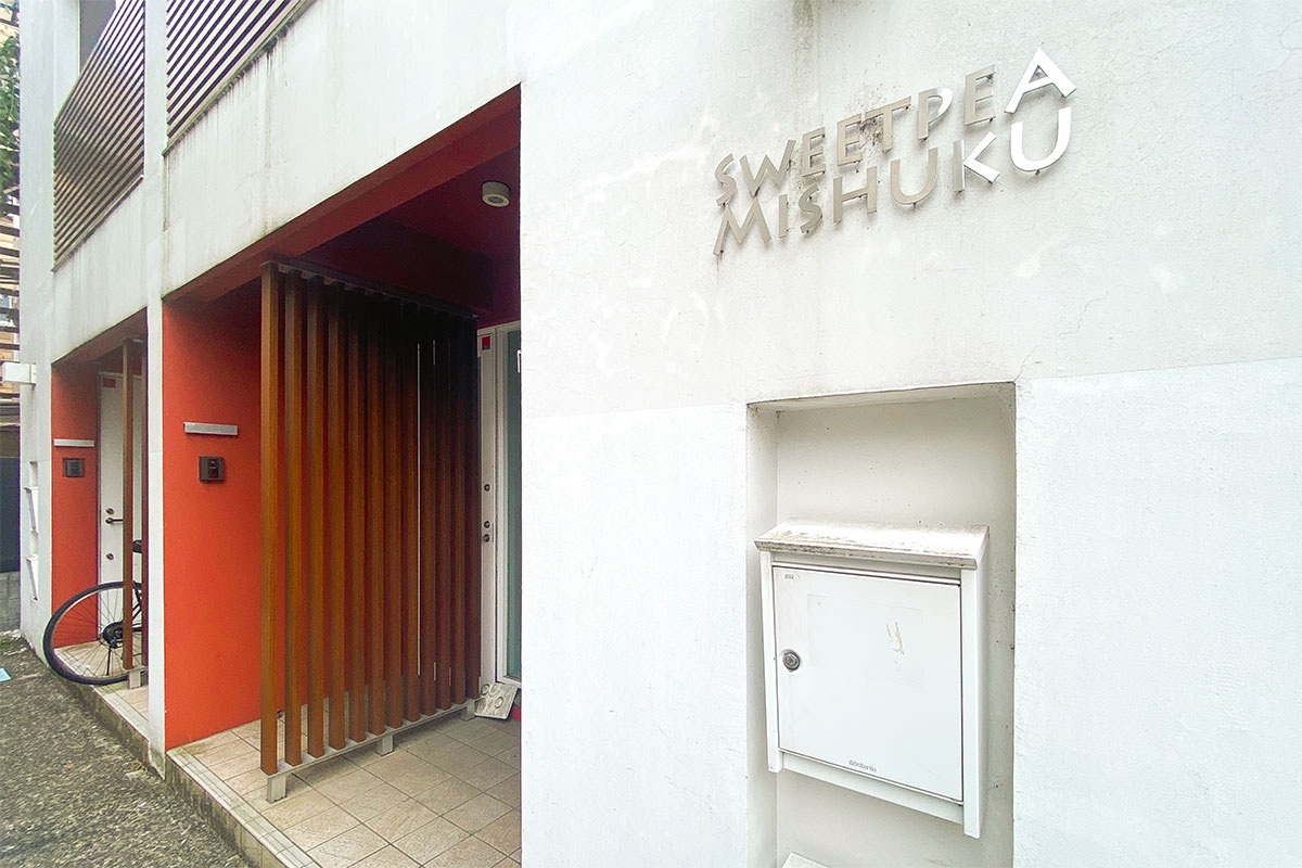 路地を入ってすぐの所にある、コンクリートと赤い玄関が特徴的な建物が当物件です。