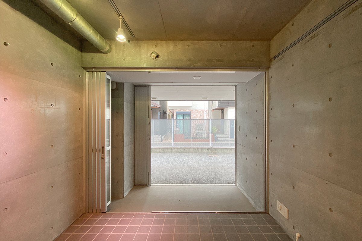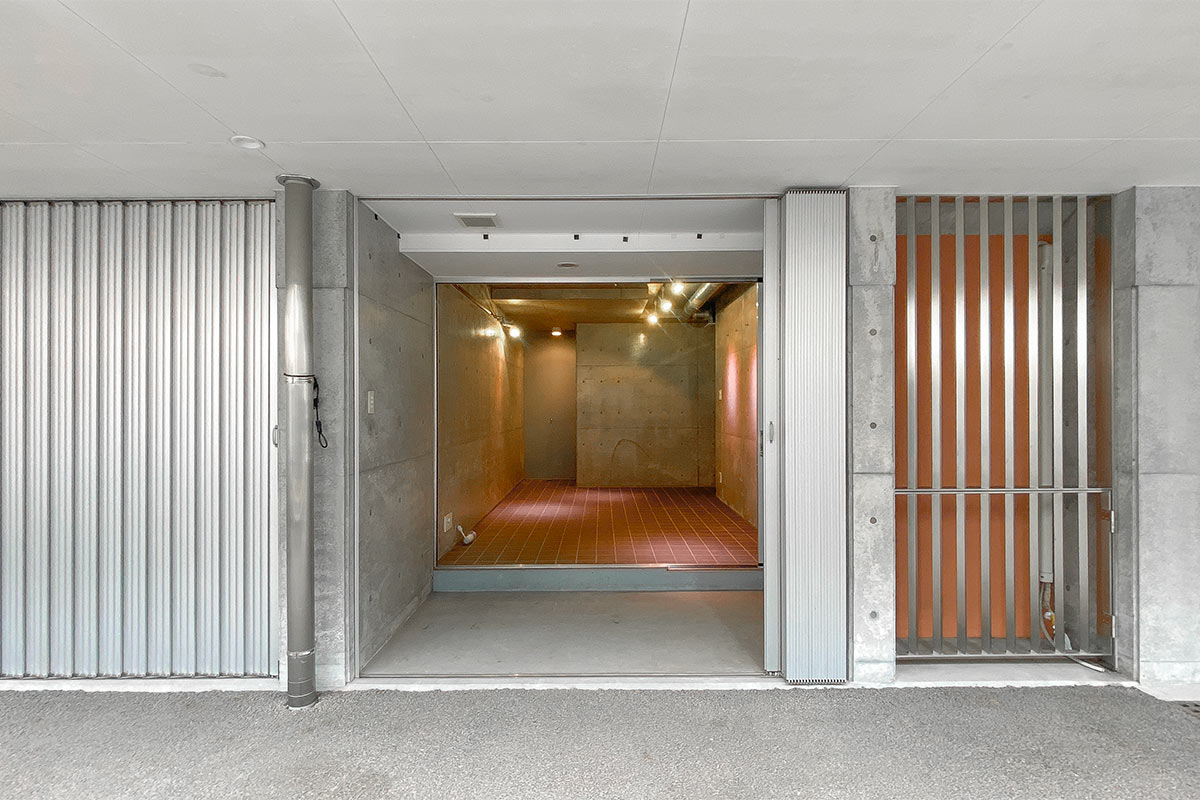 ガラスの扉、さらにシャッターを開けると、駐輪場のある共用部分へと繋がっています。