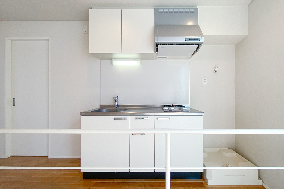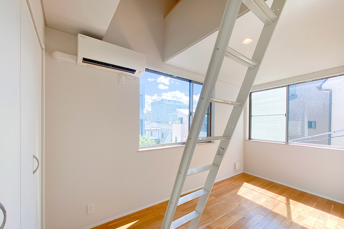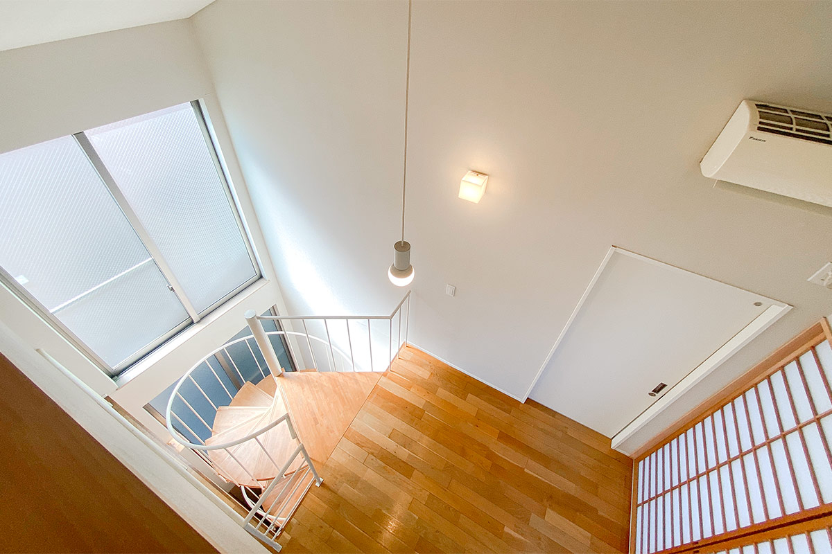 3階建ての2DK+ロフトの付いたお部屋で、螺旋階段をぐるぐると上って3階の居室部分へ。