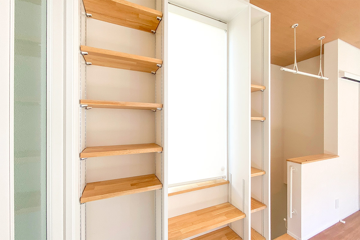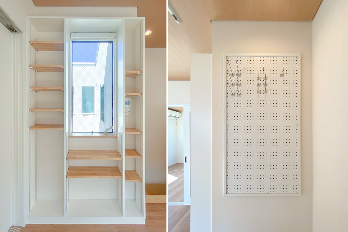リビングには高さ調整が自由自在な木製棚があり、階段を上った先にはフックが備え付けられた有孔ボードも。