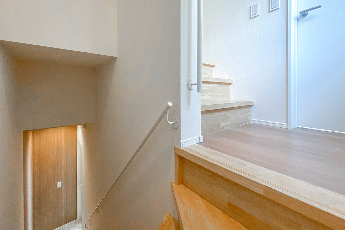 3階建てで1階が玄関、2階がバスルームと洗面所、3階が居室というつくり。