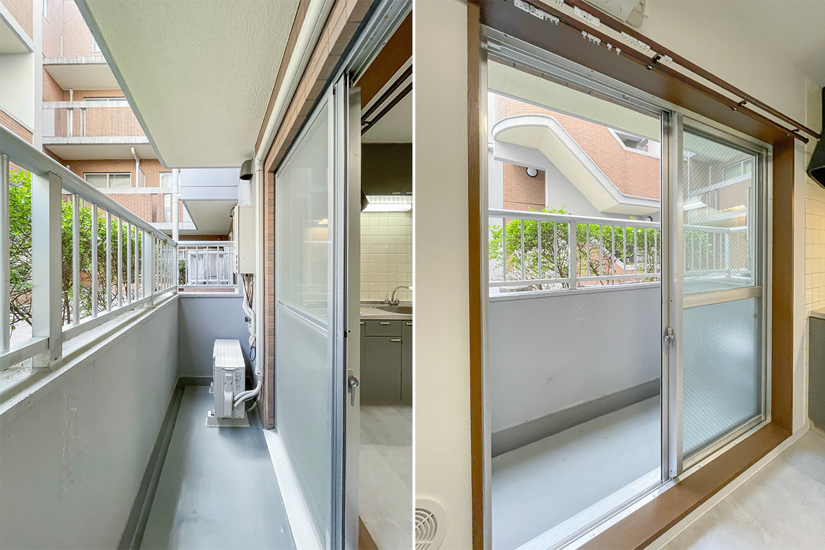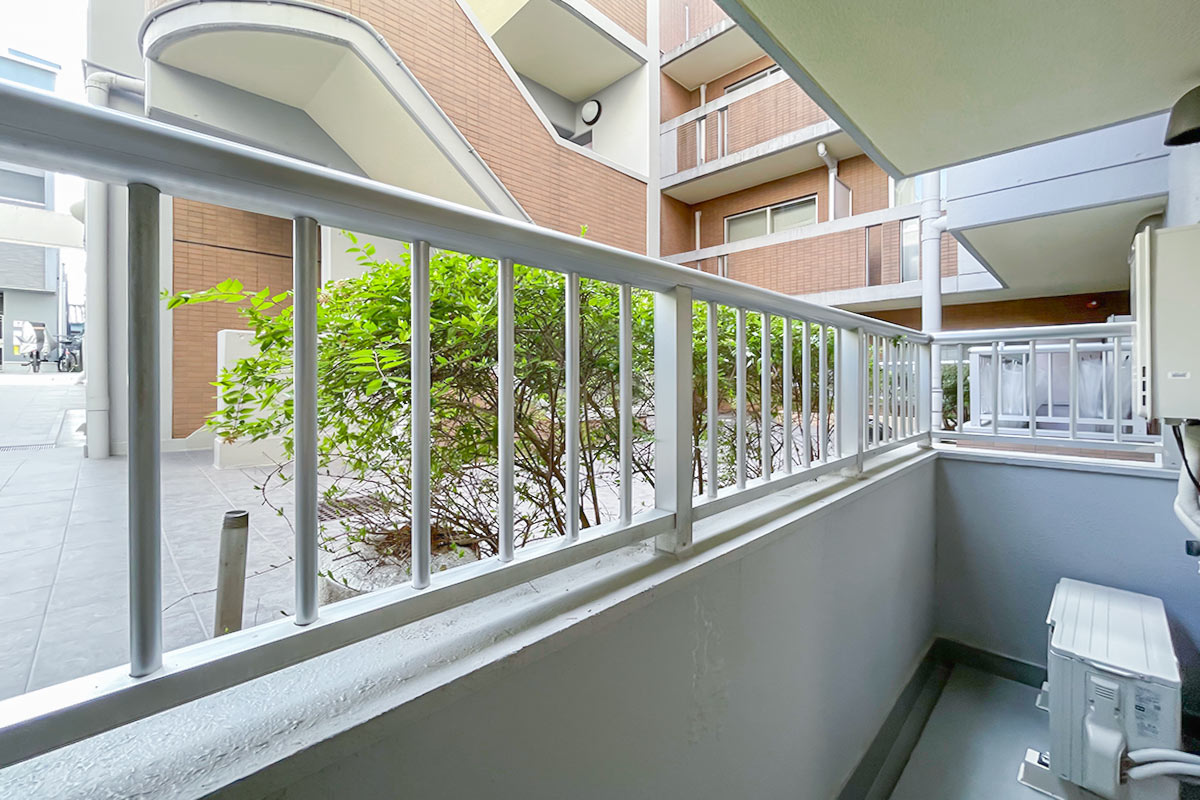エントランス方向に向いたバルコニーで、植栽はあるものの人目が気になる場合は光は通して視線は通さないレースカーテンやブラインド等をおすすめします。