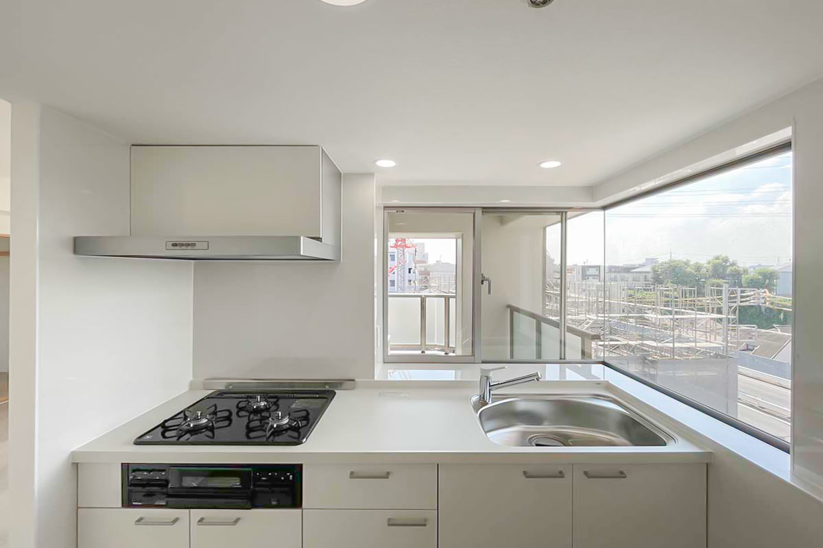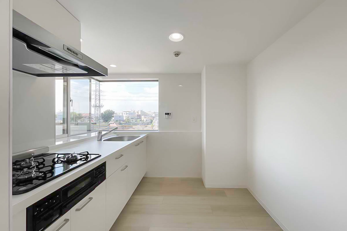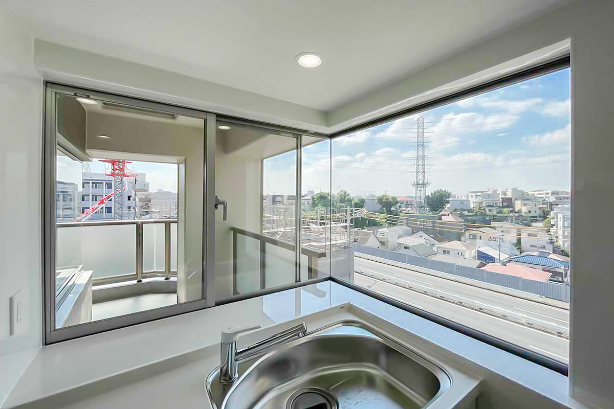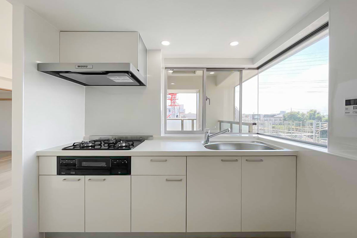 このお部屋にはリビング・キッチンそれぞれにL字の窓。キッチンも明るくて気持ちよく料理ができそうです!