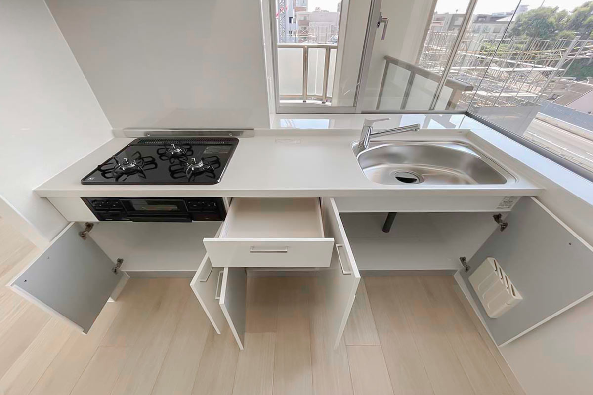キッチンは3口コンロ、グリル付き。キッチン背面スペースにも余裕があるので、冷蔵庫+食器棚+家電ラックと並べて配置できそう。