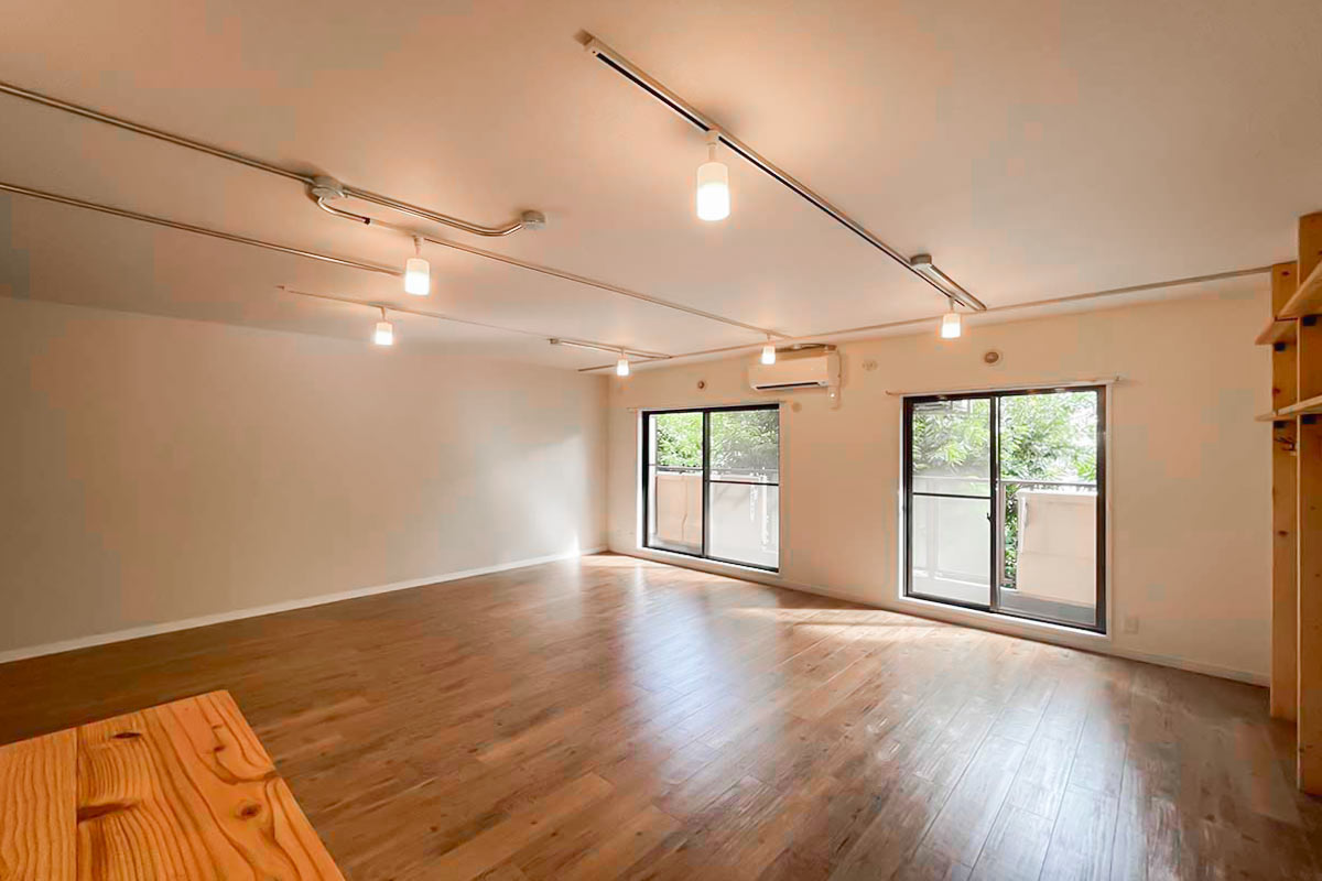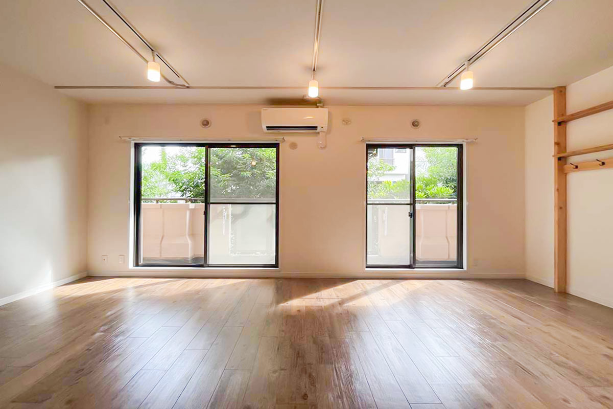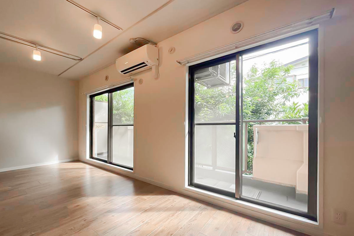 南向きの窓からは優しく日が降り注ぎ、部屋を囲うように緑が植っているのもポイント。