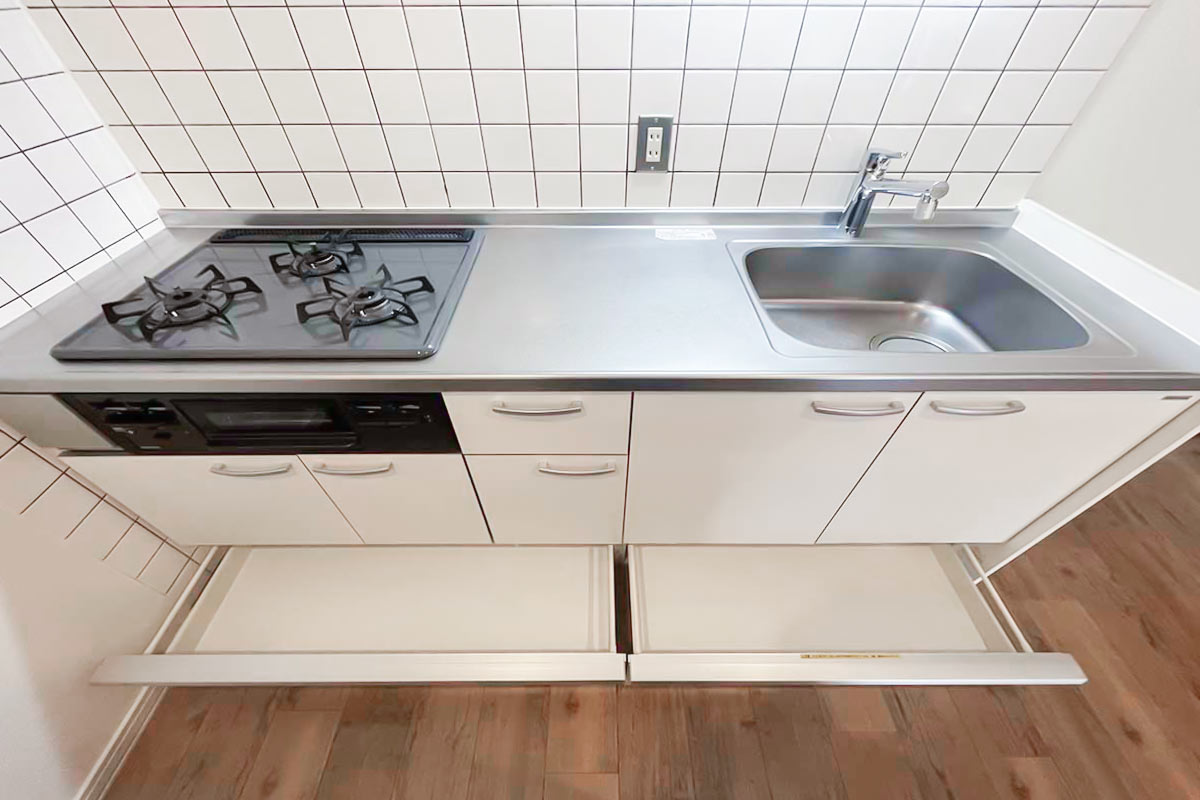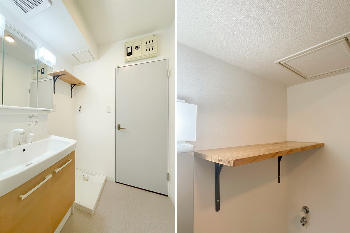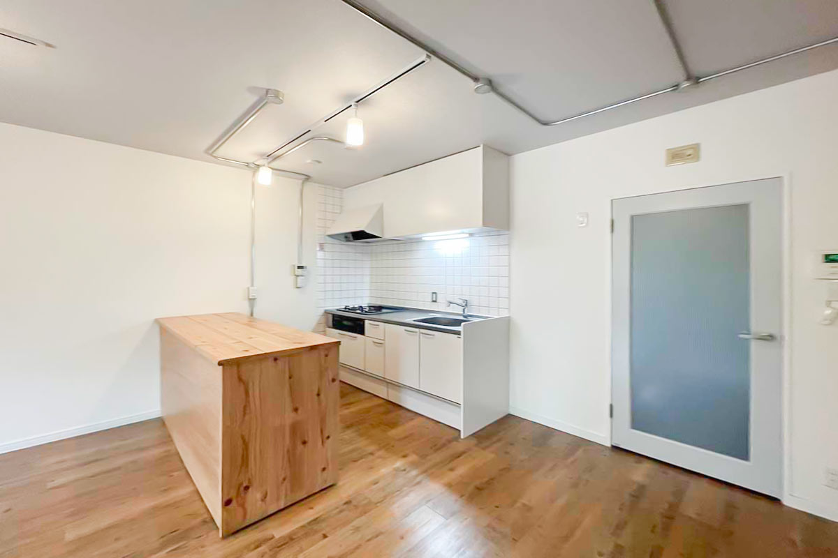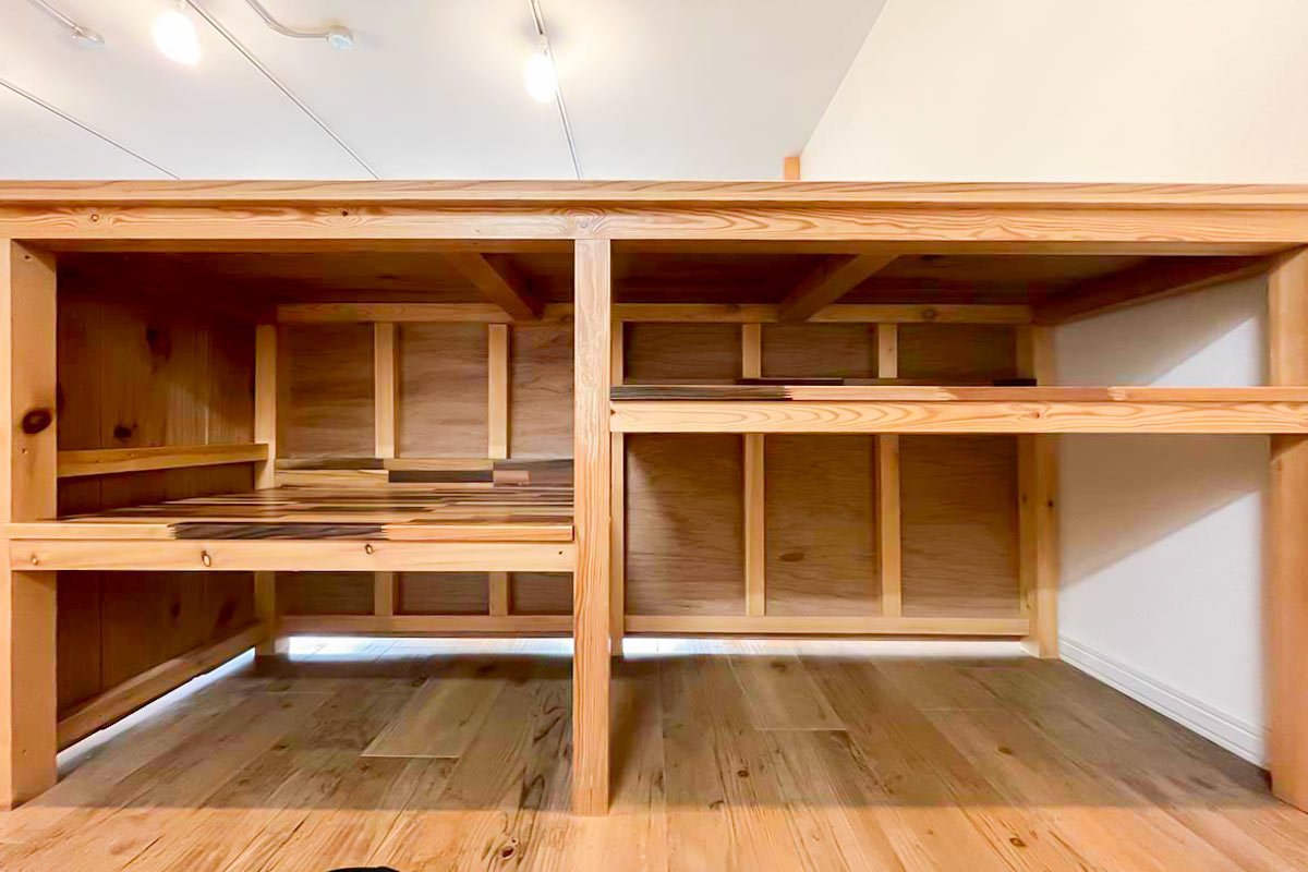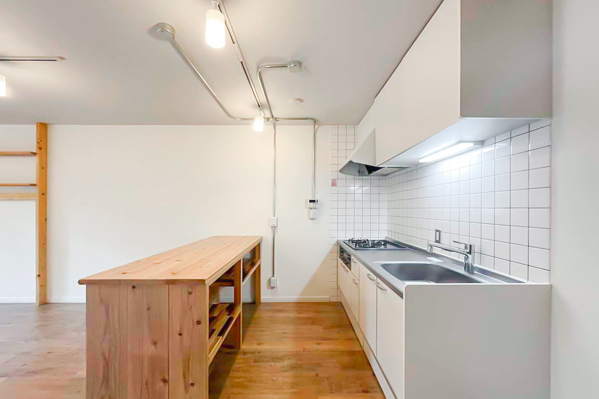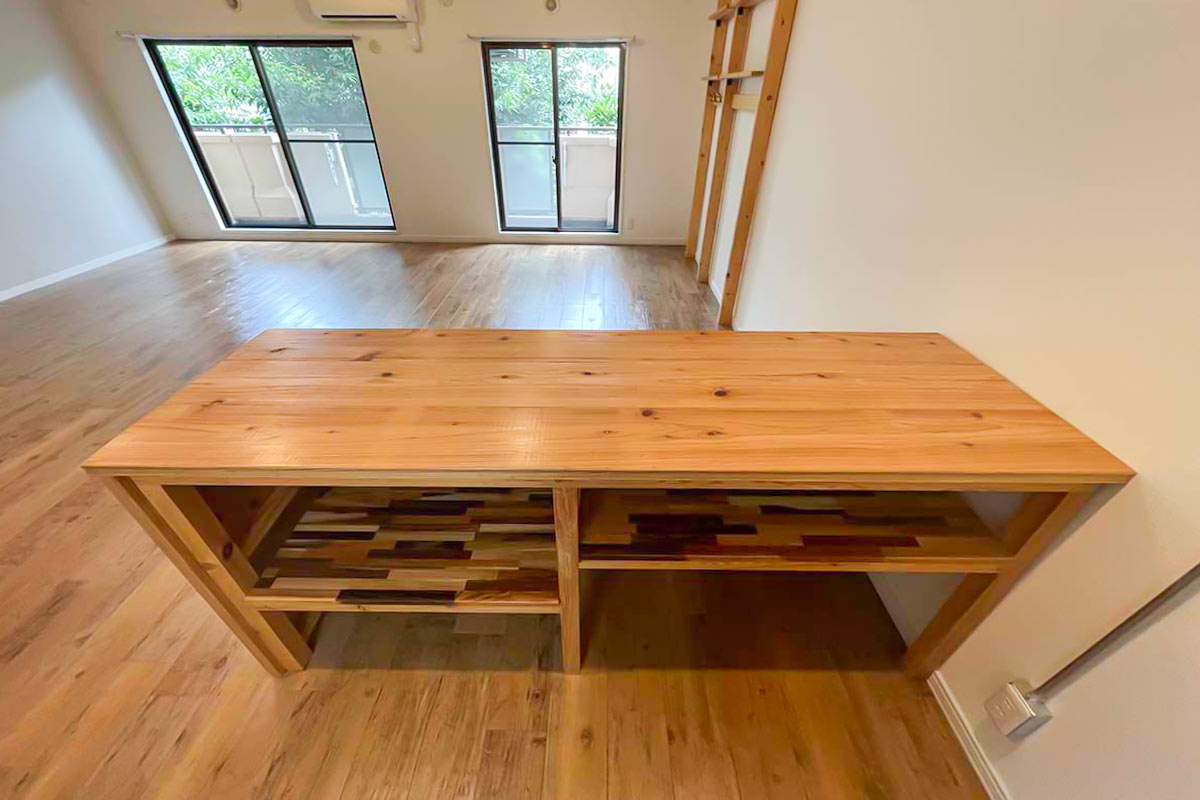 写真のように対面カウンターとして利用しても良いですし、壁に沿って配置して家電ラックにしても◎