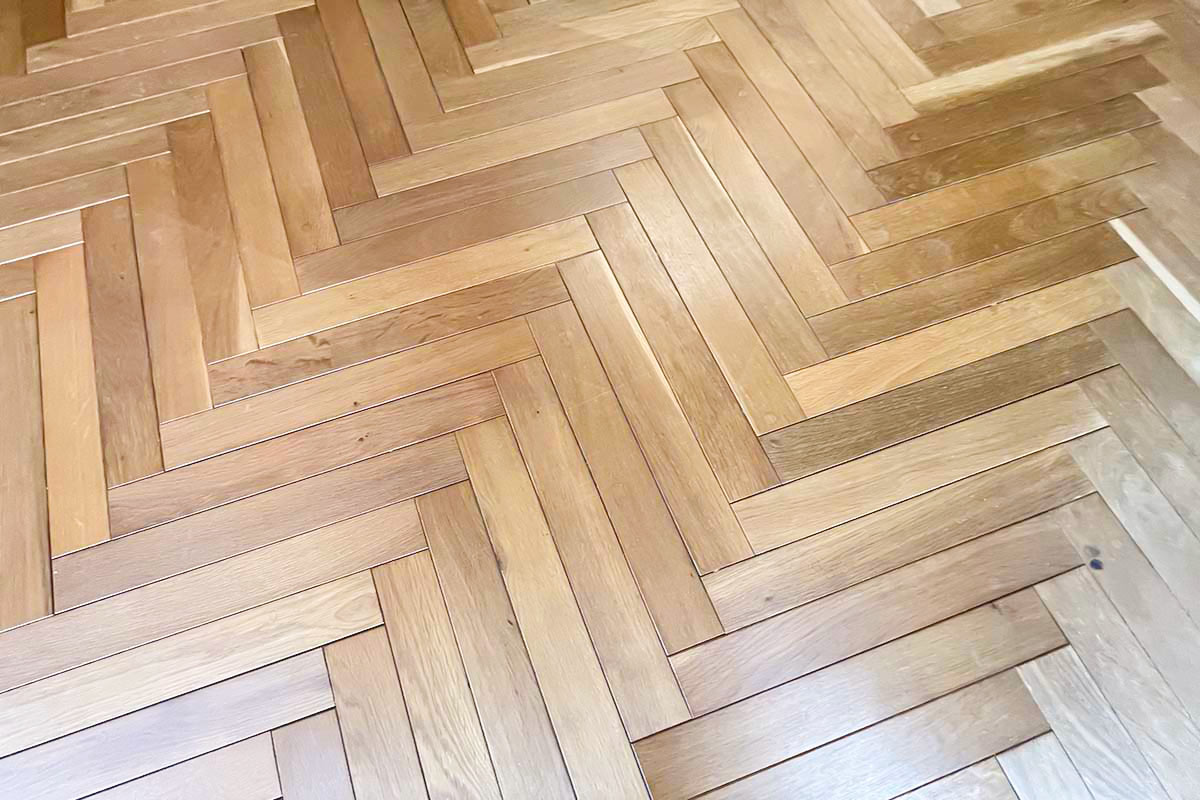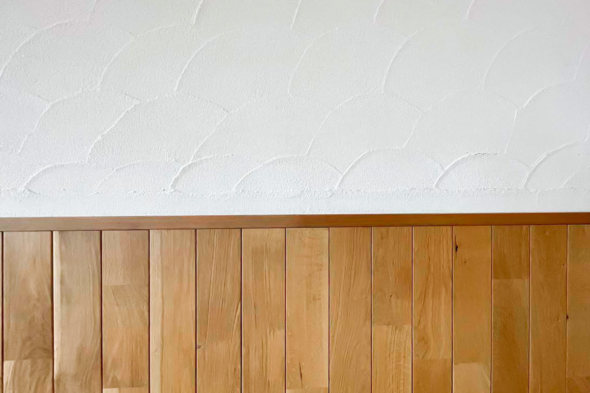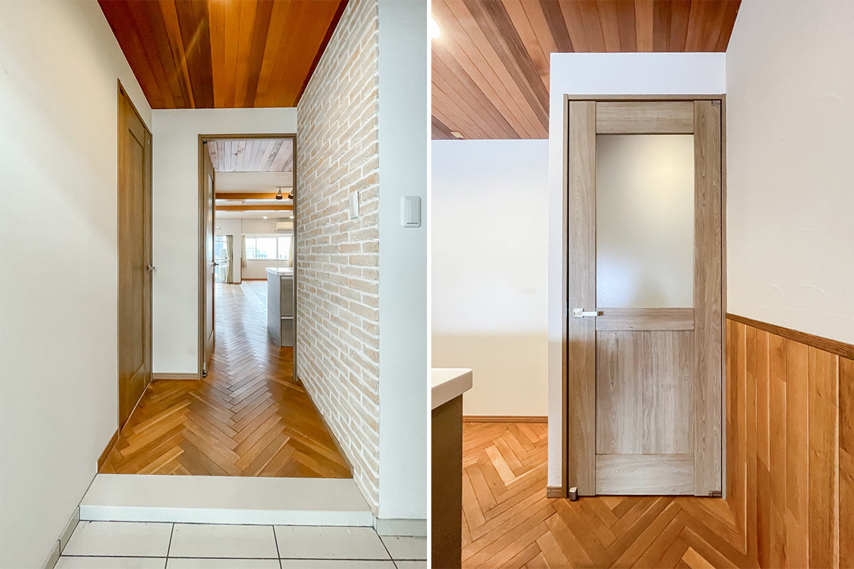 内装はヘリンボーン柄の無垢床が印象的。壁も漆喰壁のようなデザインと腰高までの羽目板と木の温もりをたっぷり感じられます。