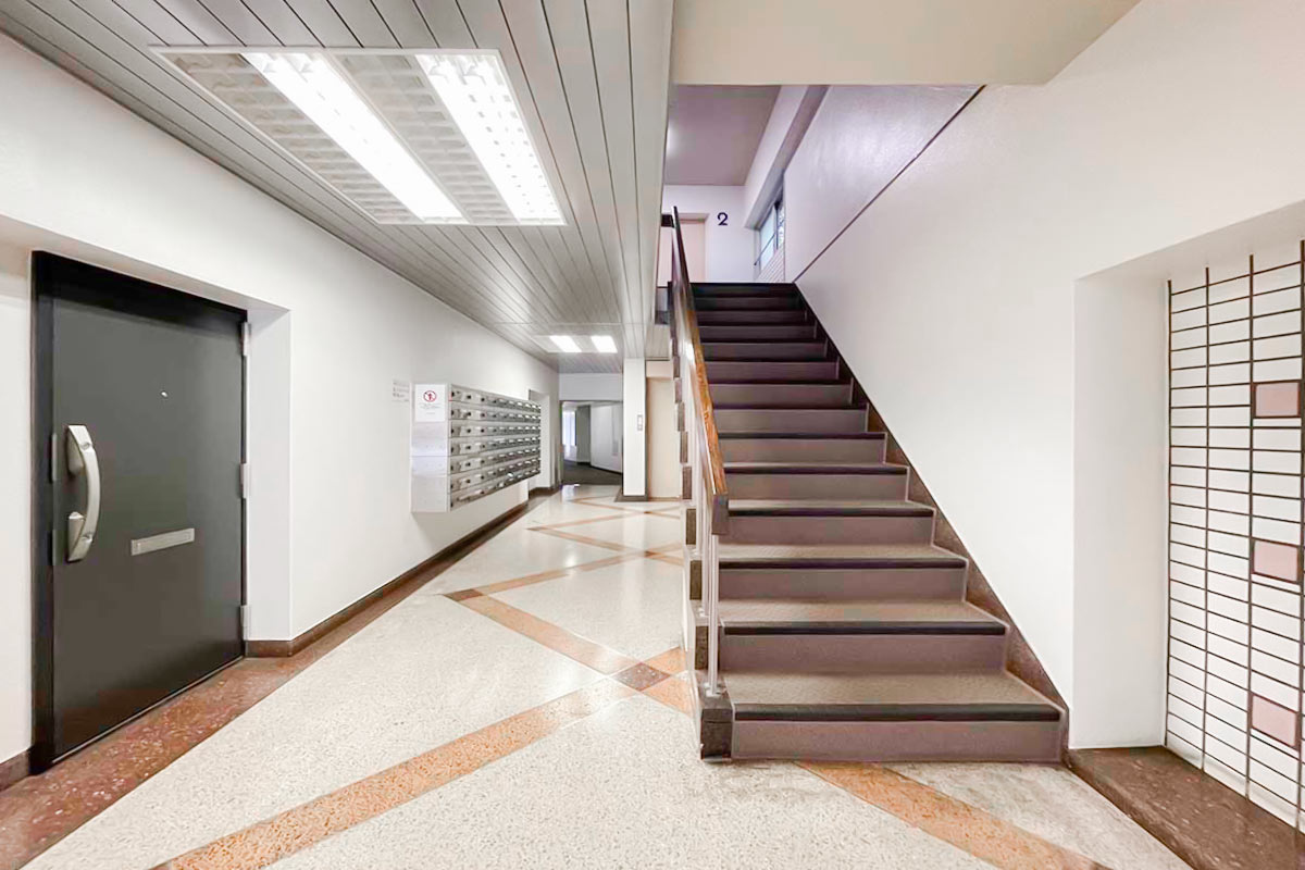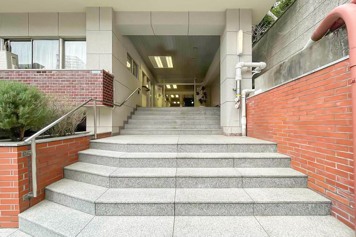 エントランスの階段や少し坂を登った場所にあるため、小さなお子様がいてベビーカーを使っている方には少し大変かもしれませんが、この辺りで長く住みたい方におすすめしたい物件です。