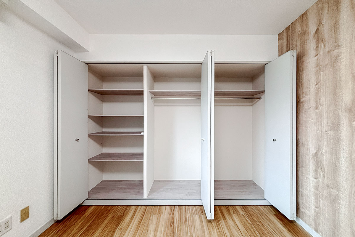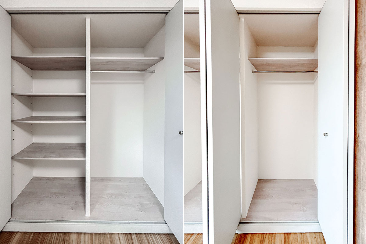 壁面クローゼットはラックと可動棚に分かれていてアイテムごとの収納がしやすそう。