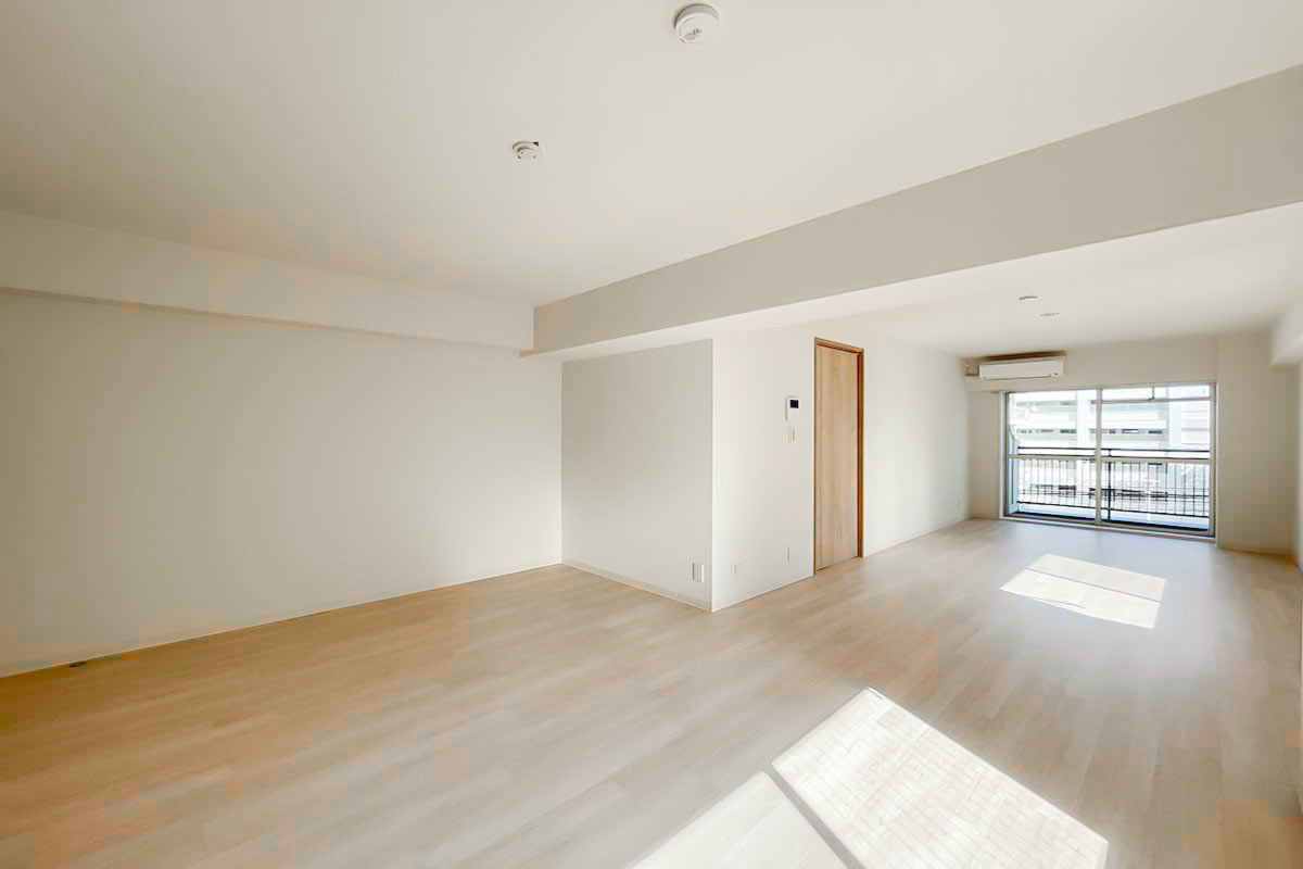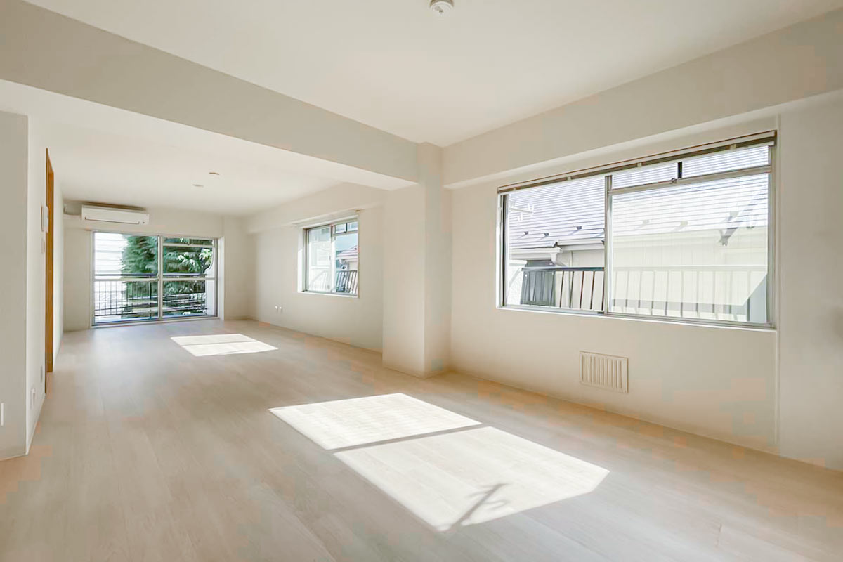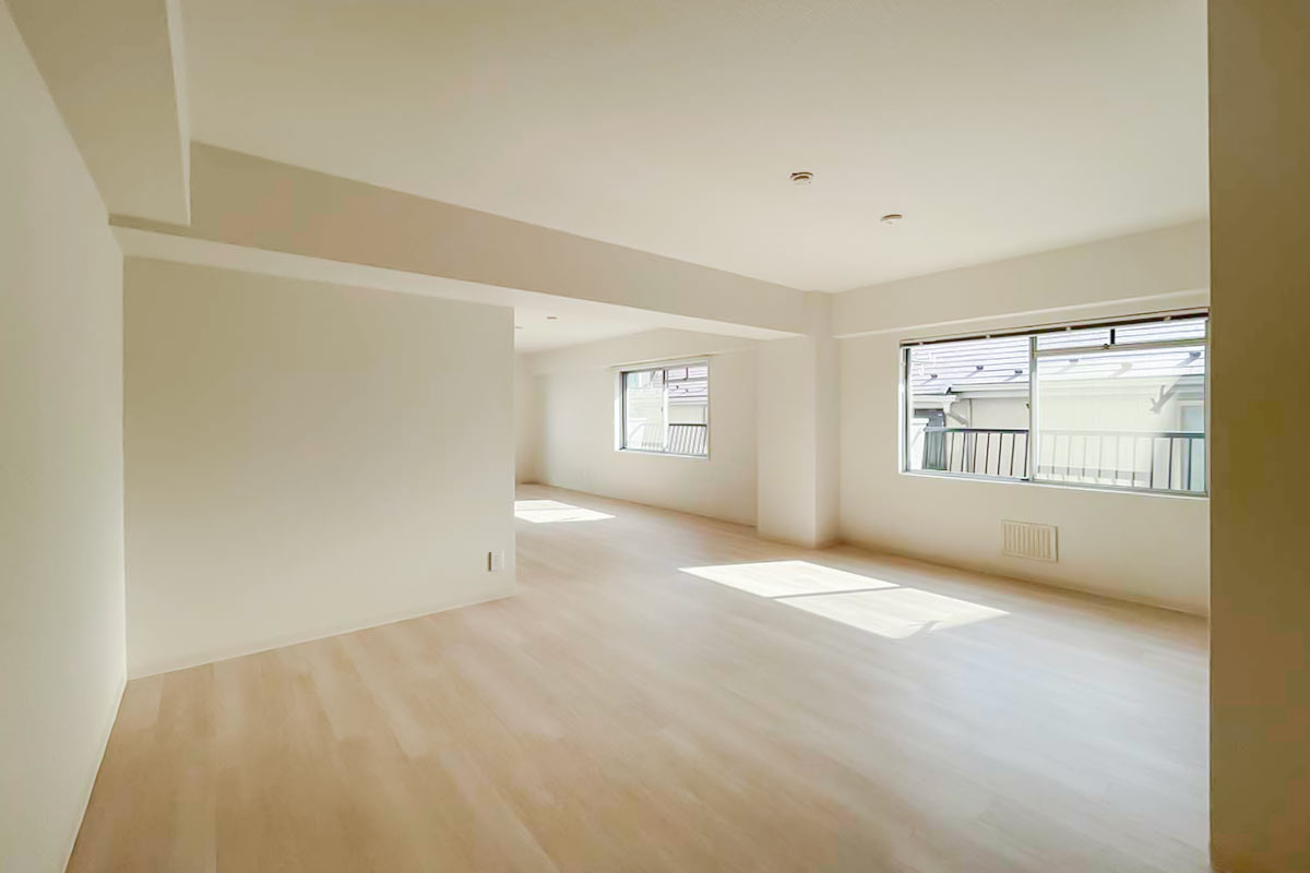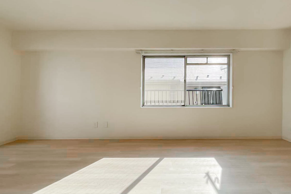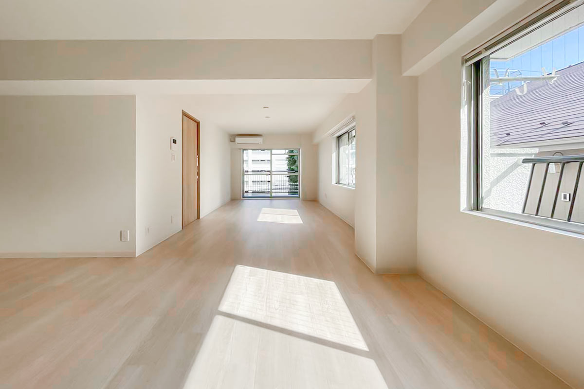 LDKは18.23帖もあるので、お向かいのマンションの植栽を借景に、奥行き深い形を生かした家具配置がおすすめ。陽当たり良好なので、窓辺で植物を育ててもいいかもしれませんね。