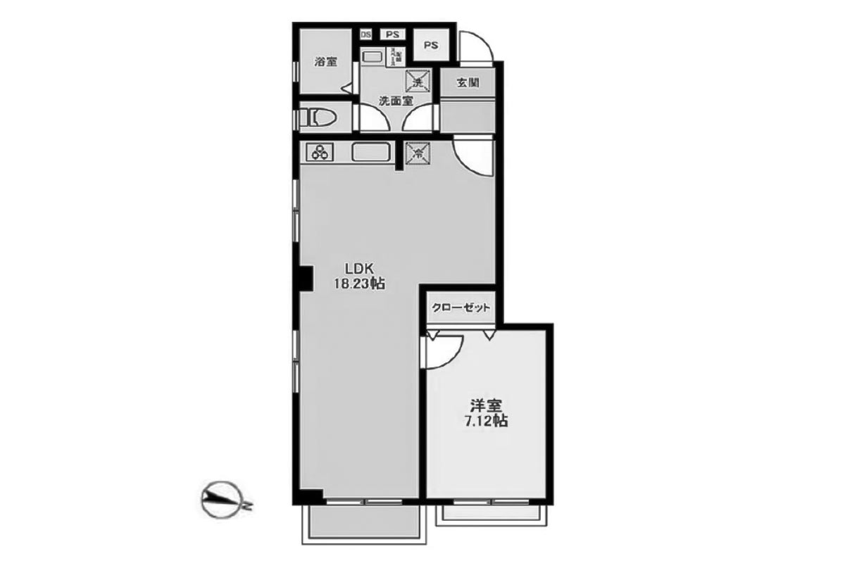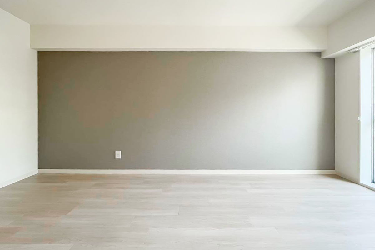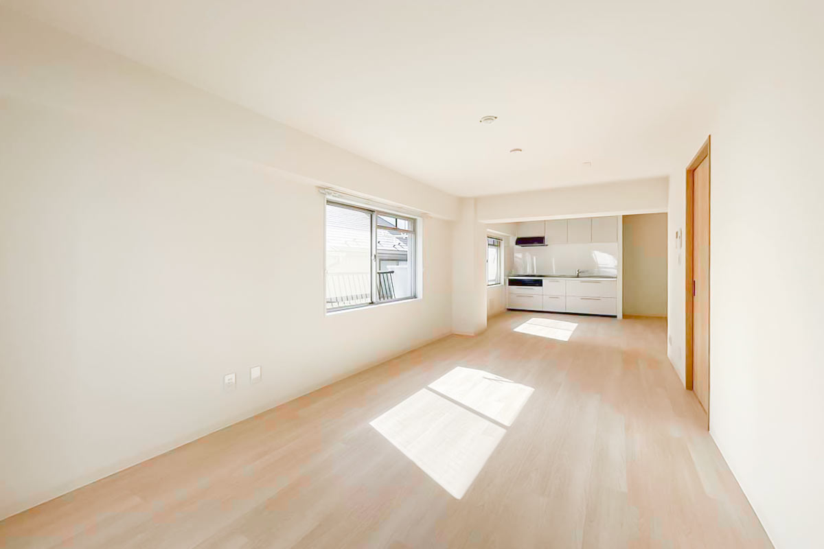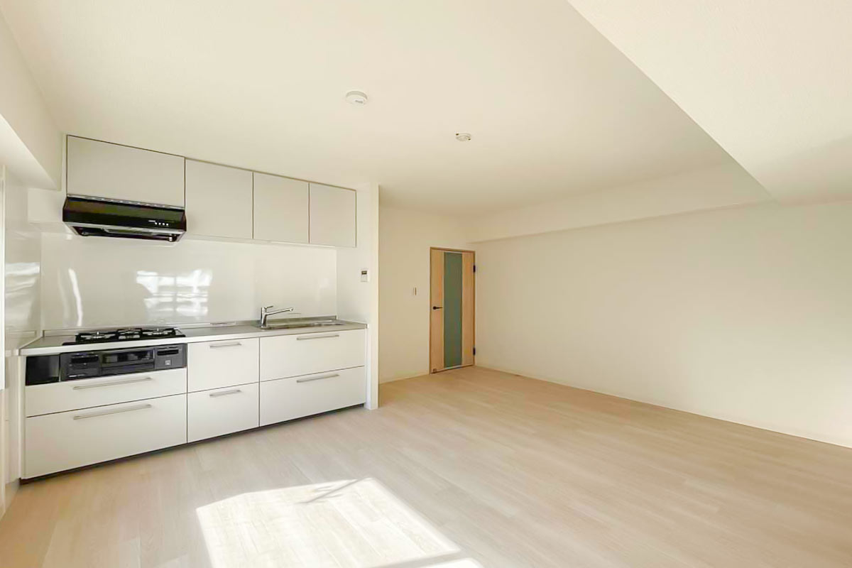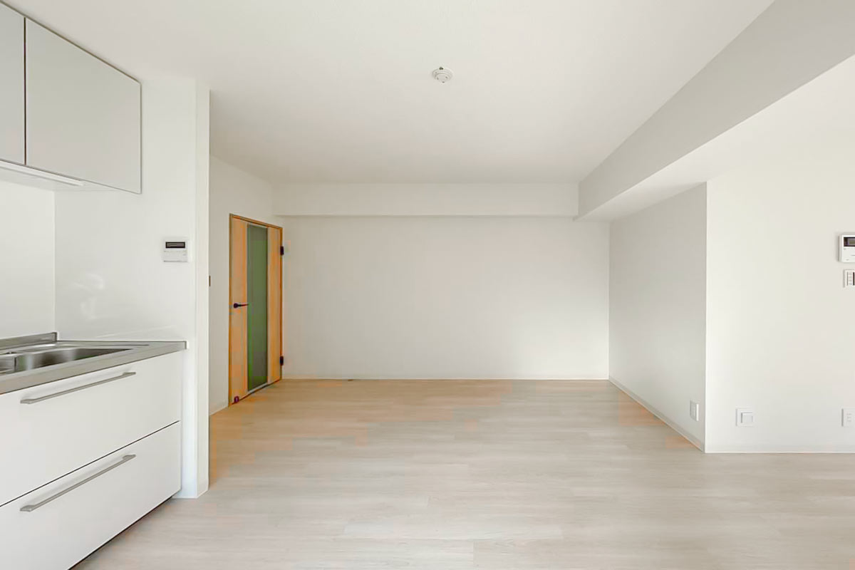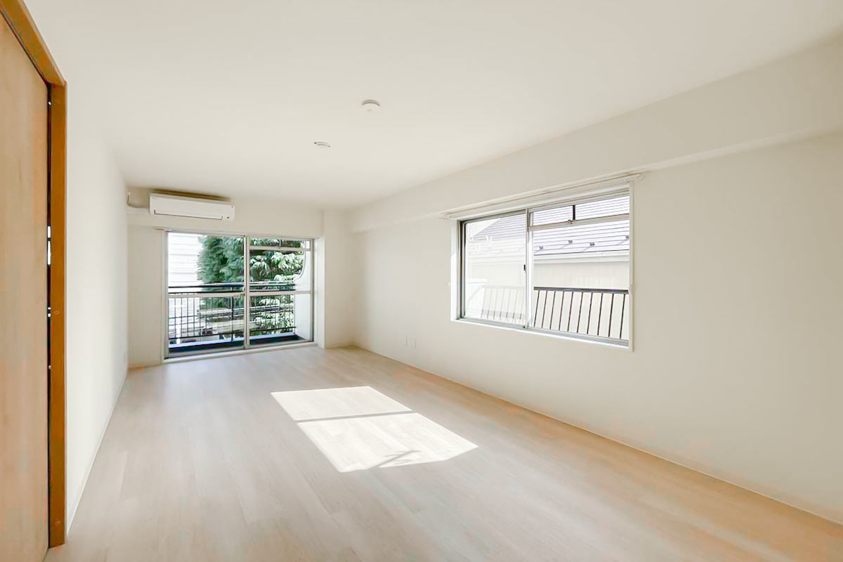 LDKは18.23帖もあるので、お向かいのマンションの植栽を借景に、奥行き深い形を生かした家具配置がおすすめ。陽当たり良好なので、窓辺で植物を育ててもいいかもしれませんね。