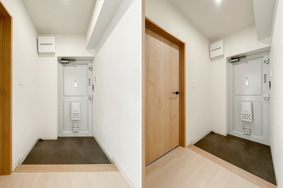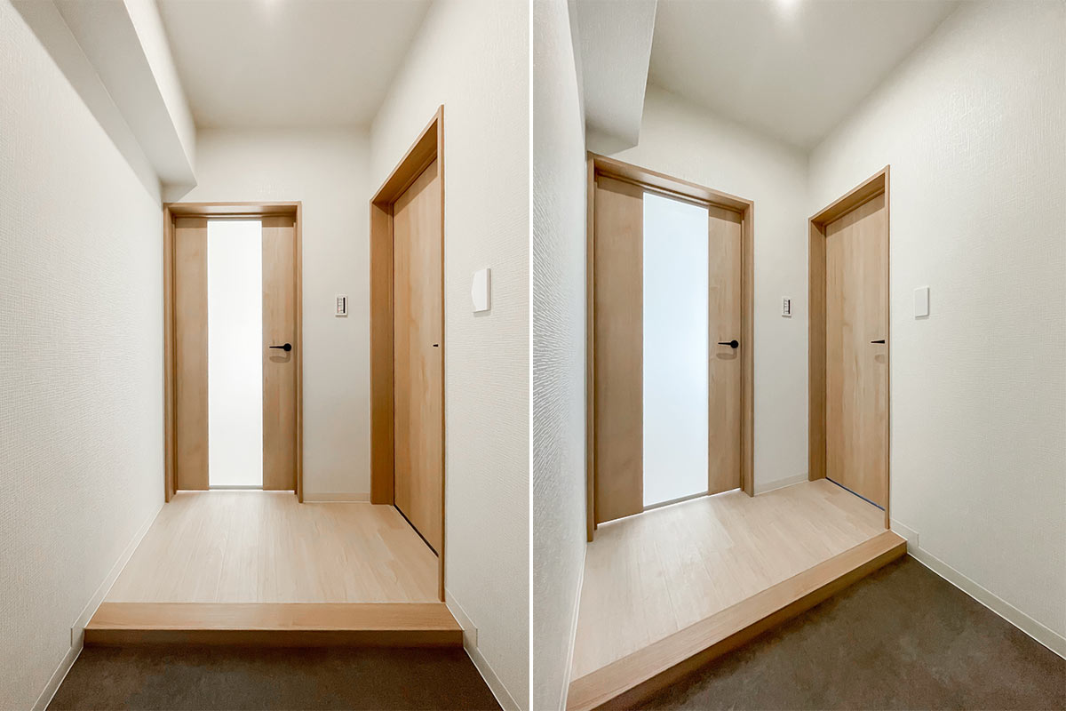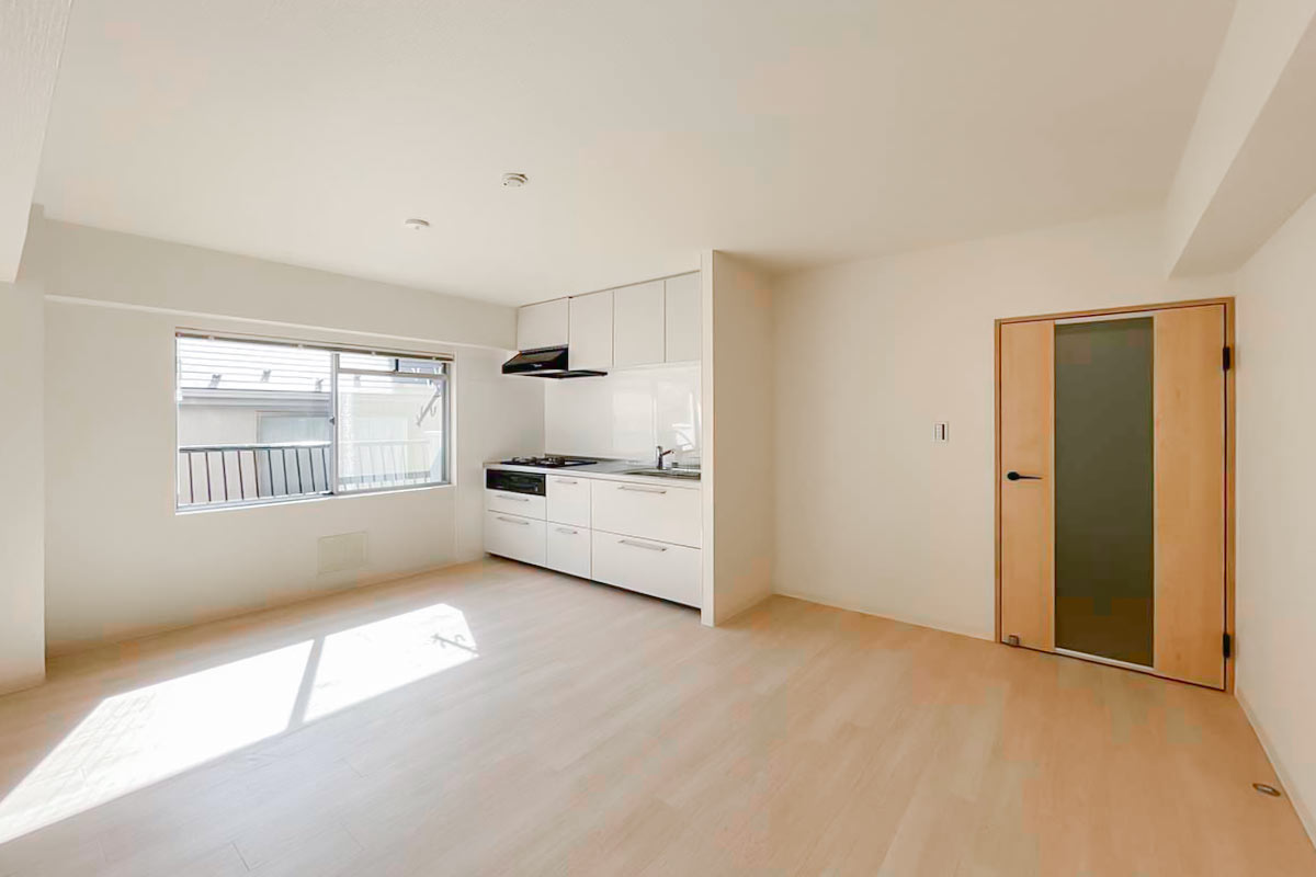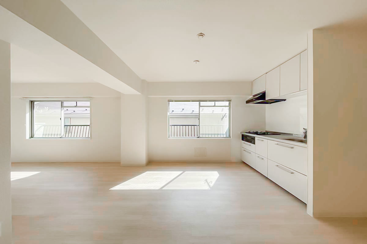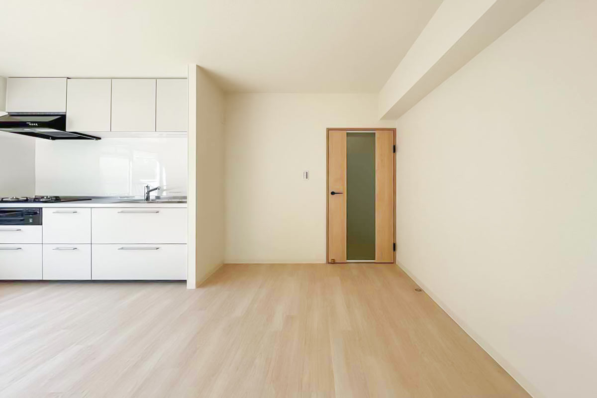 玄関からすぐ扉を開けると、南・東の2面採光の明るいLDKです。
