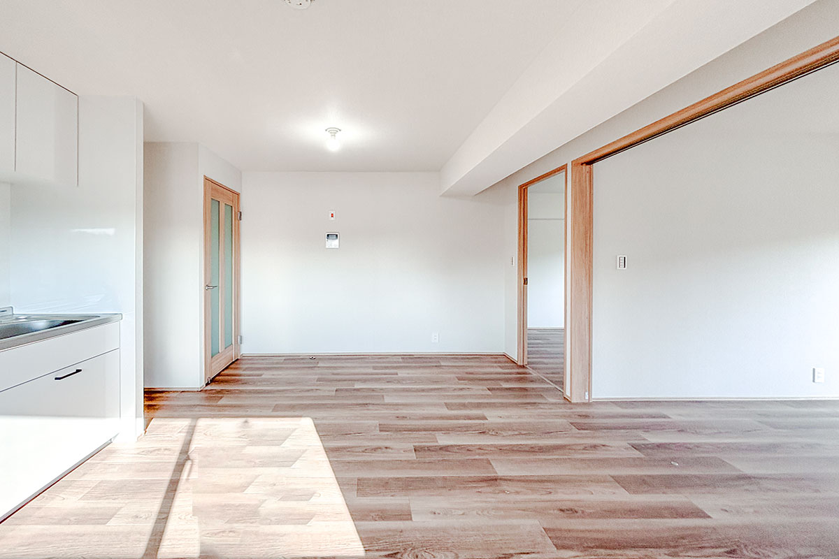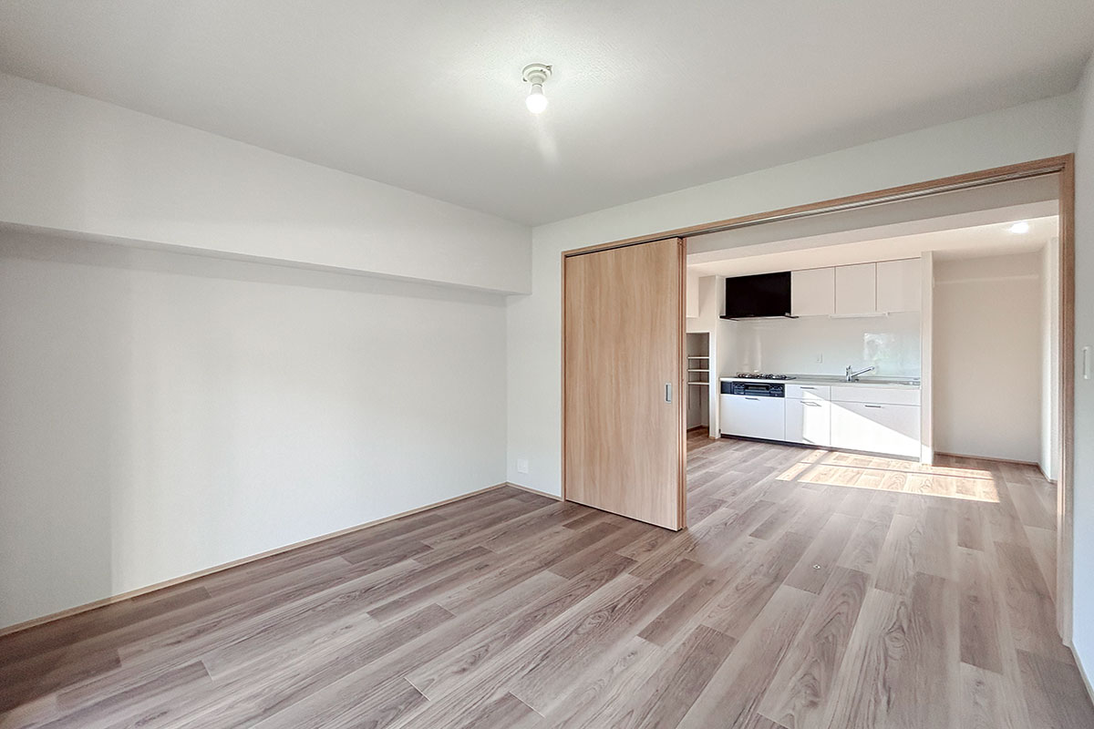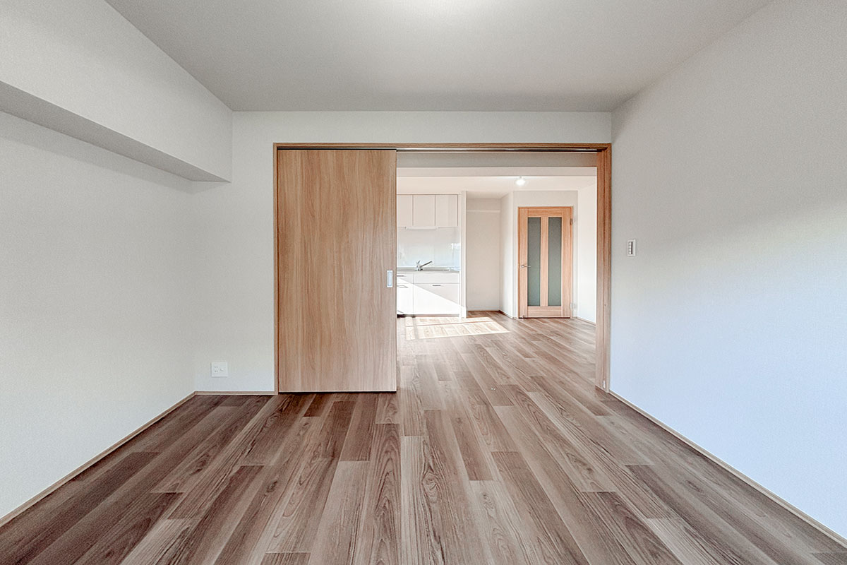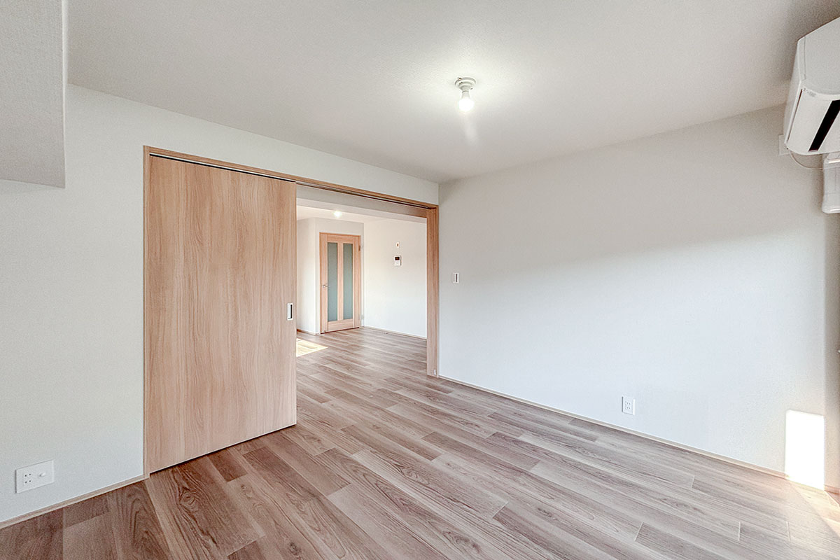 8帖のダイニングキッチンから洋室2部屋は、スライドドアを挟んだ振り分けタイプ。