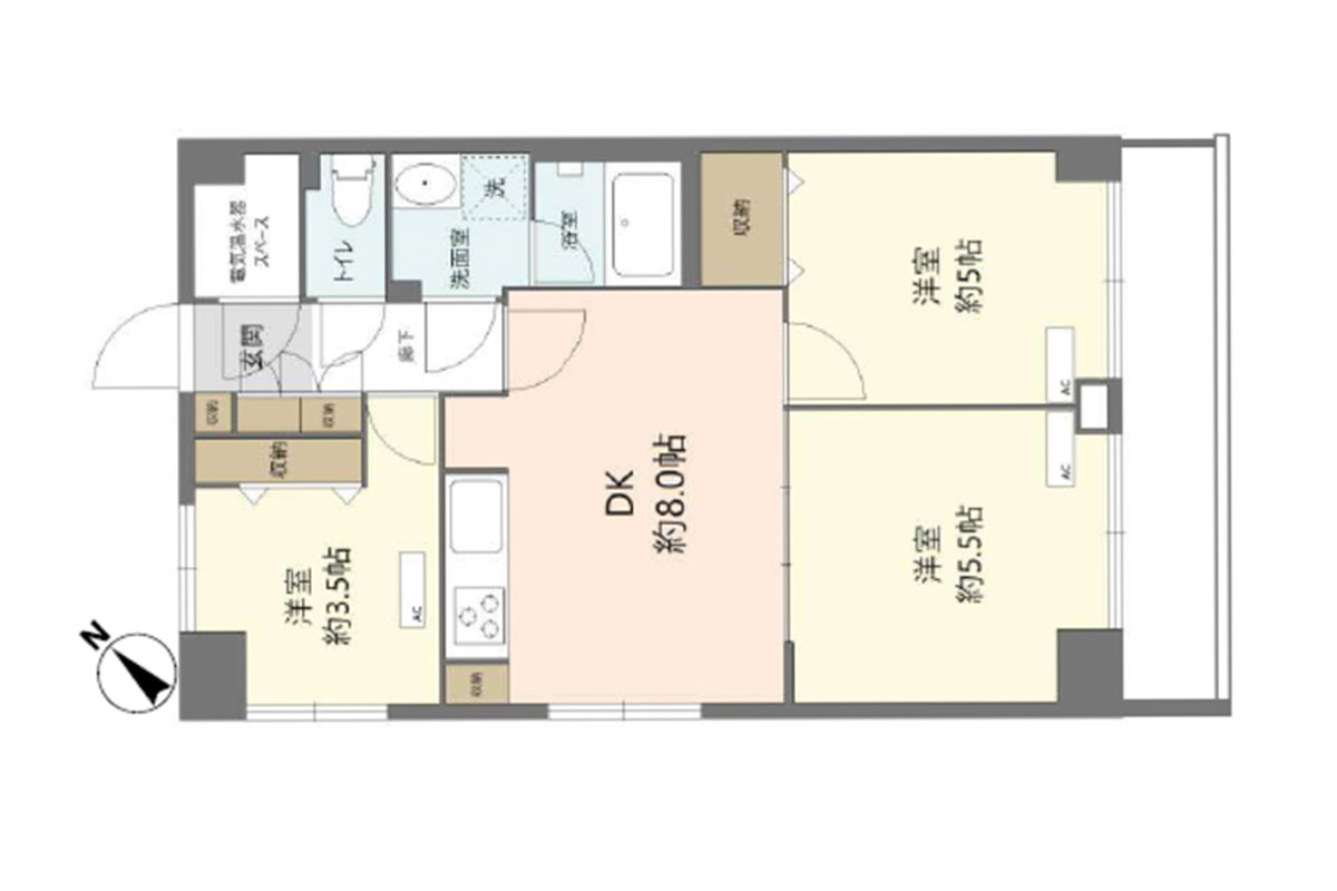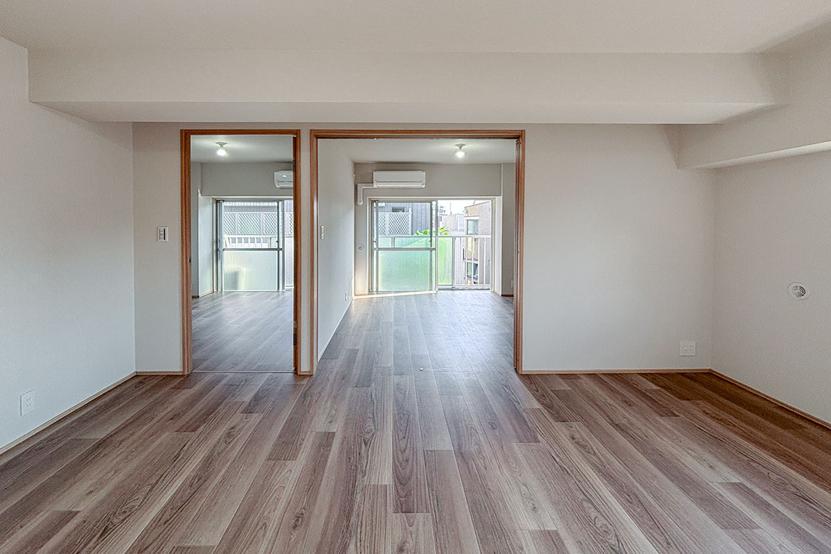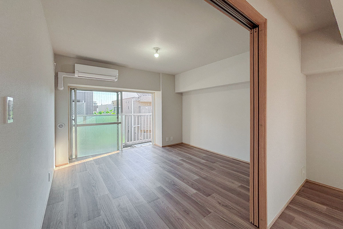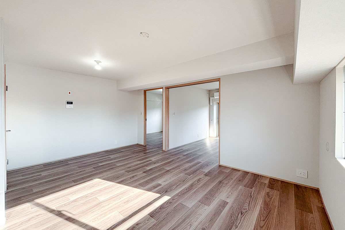 8帖のダイニングキッチンから洋室2部屋は、スライドドアを挟んだ振り分けタイプ。