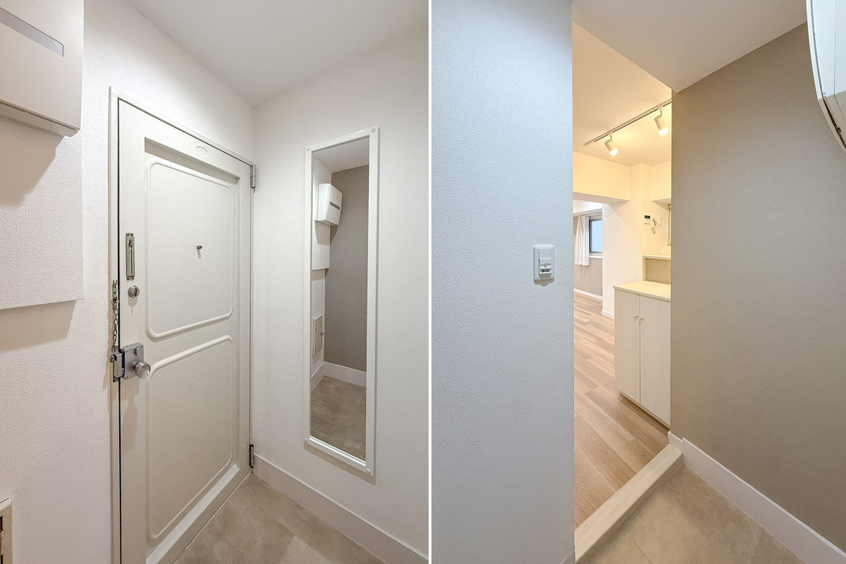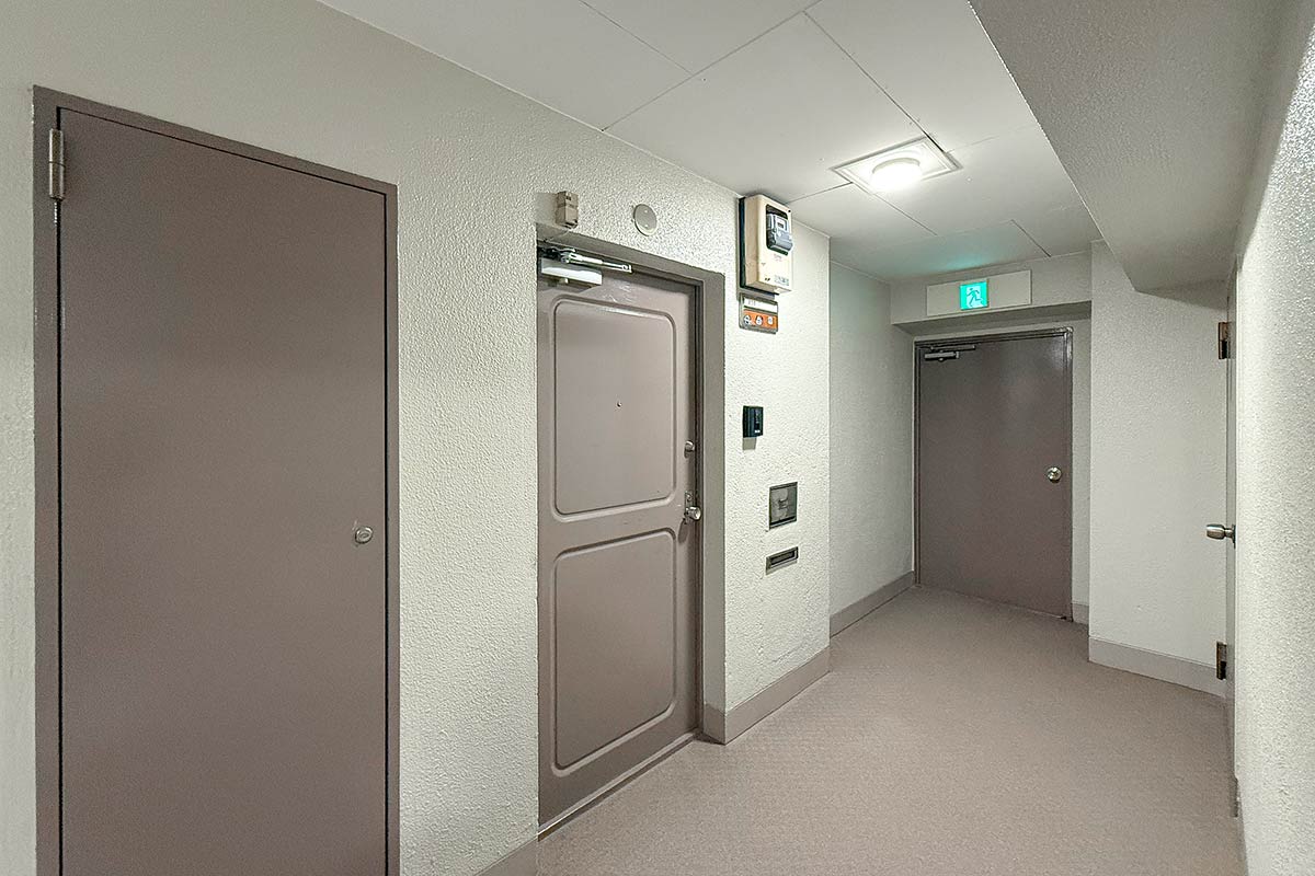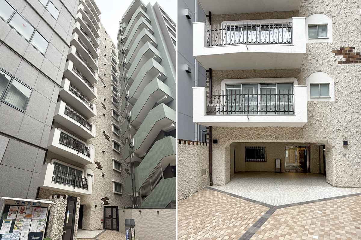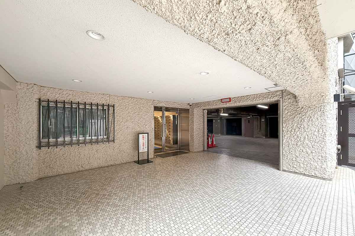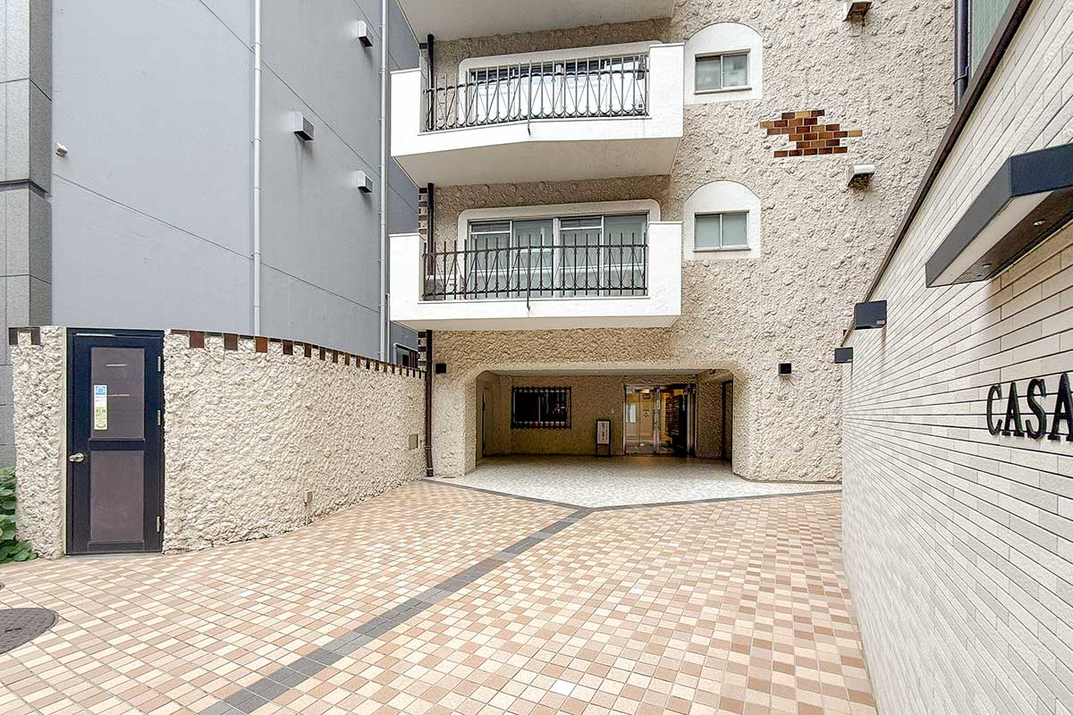 白い塗り壁にゆとりのあるエントランスは、この時代に多く建設されたマンションの特徴のひとつかもしれません。