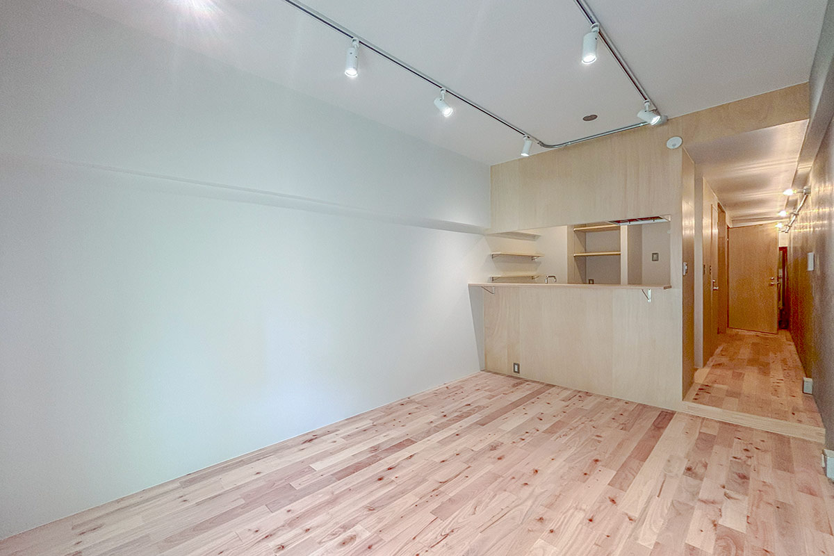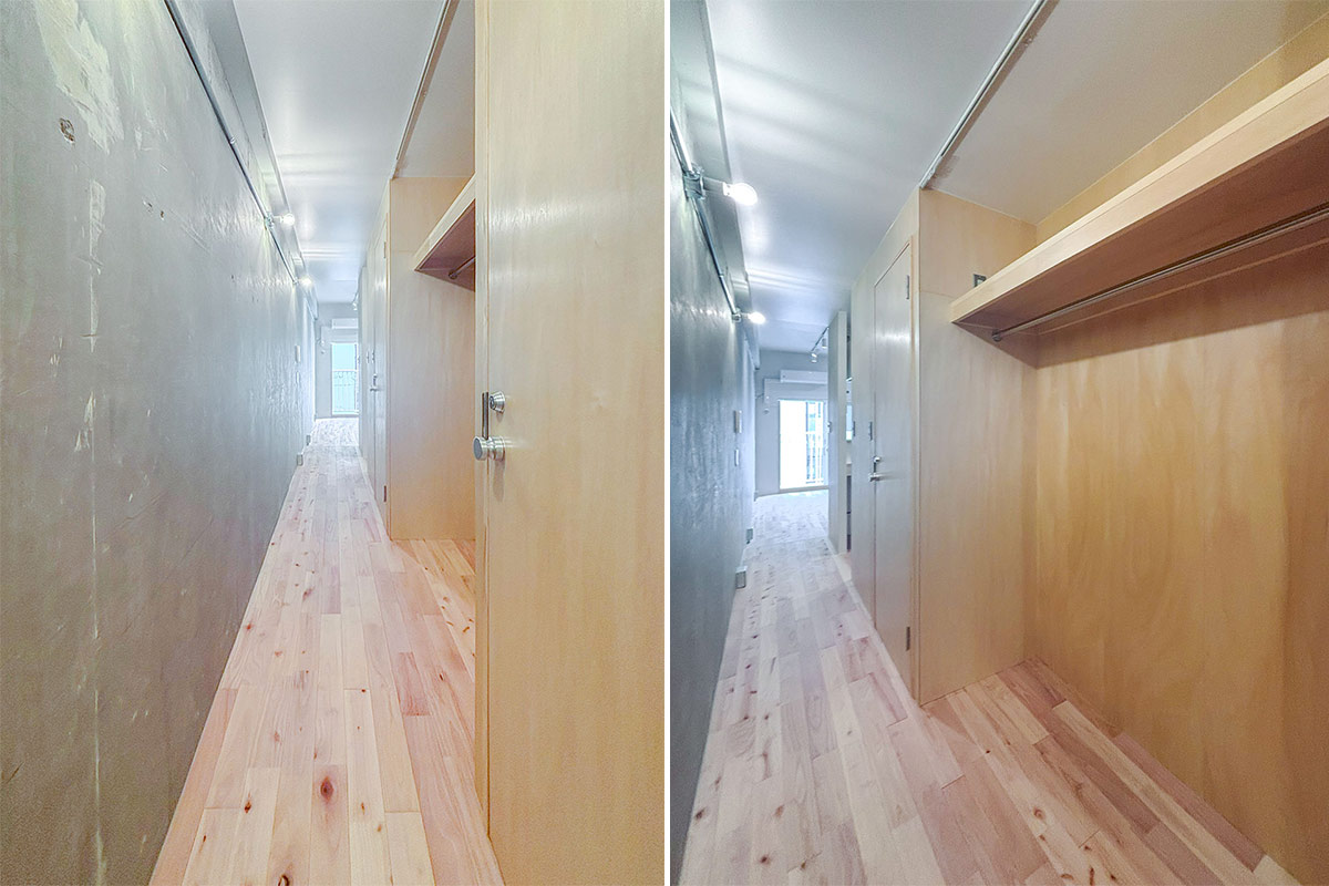 収納は廊下沿いにカーテンで目隠しできるオープンラックがありました。