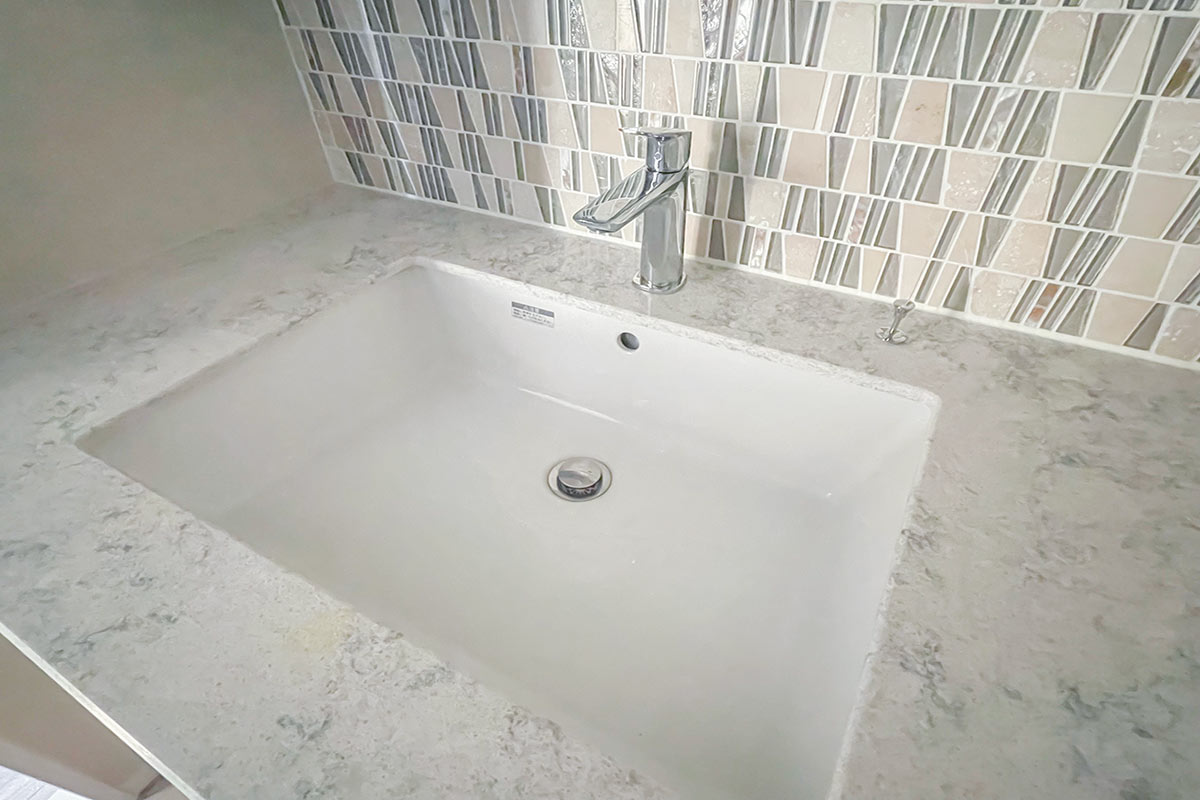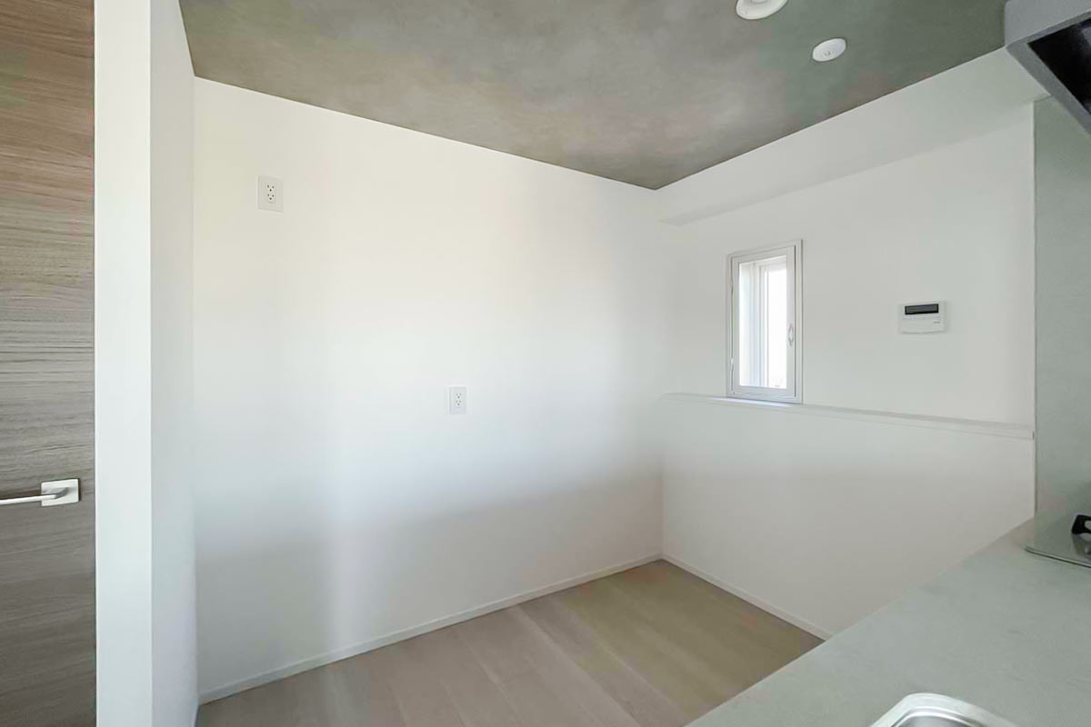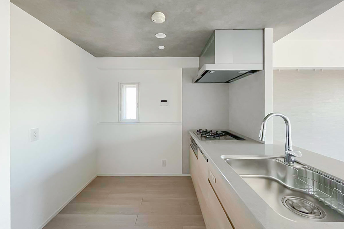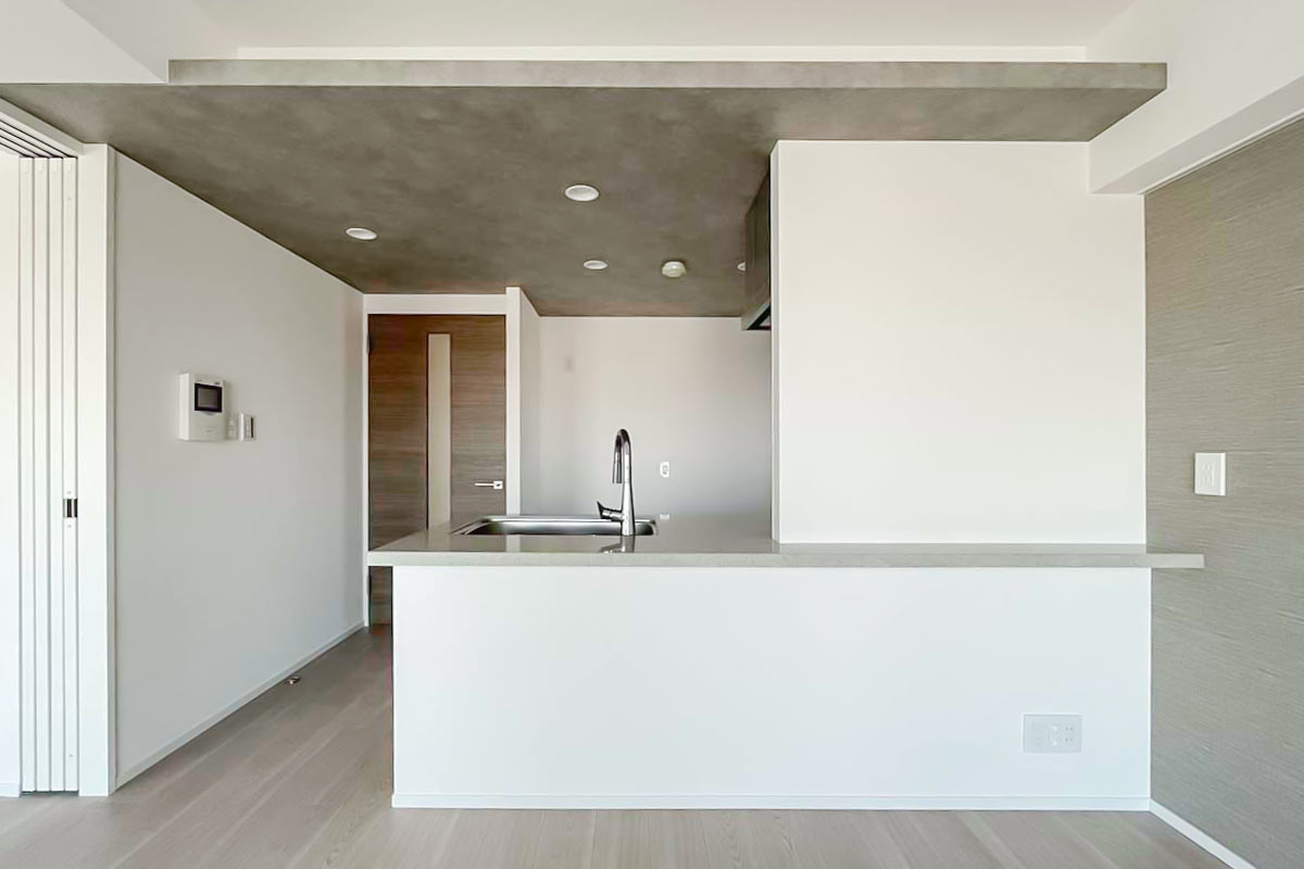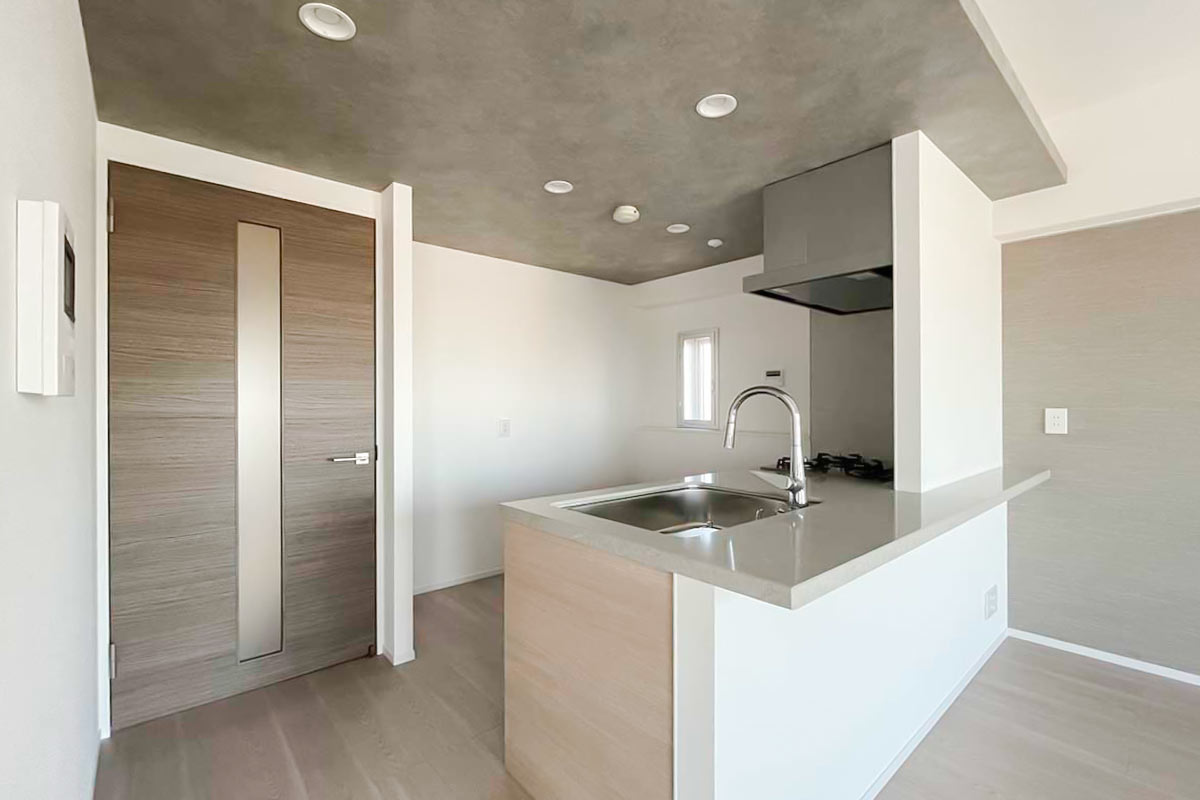 キッチンの天井はグレーのアクセントクロスで、モダンでスタイリッシュな印象に。