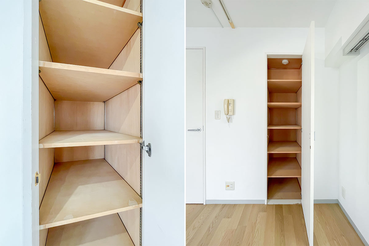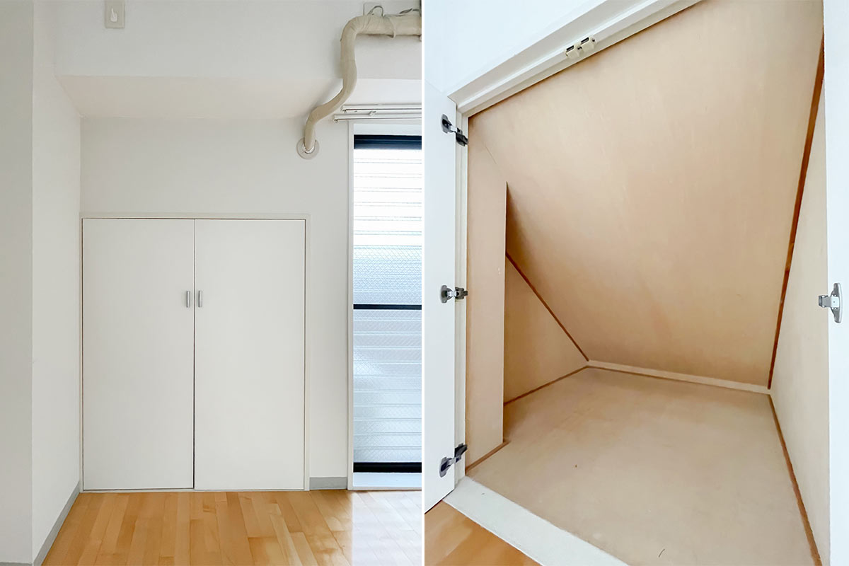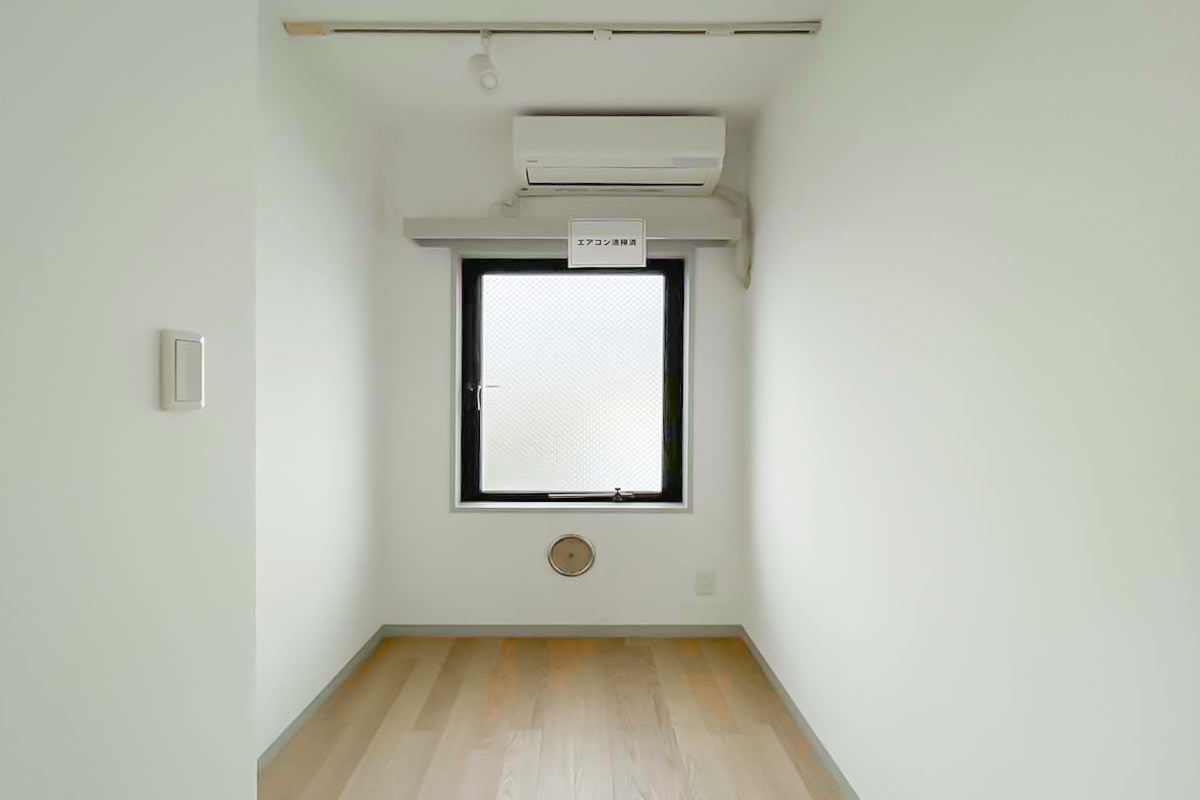 収納はいわゆるクローゼットではないため、ベッド下収納やハンガーラックが必要です。