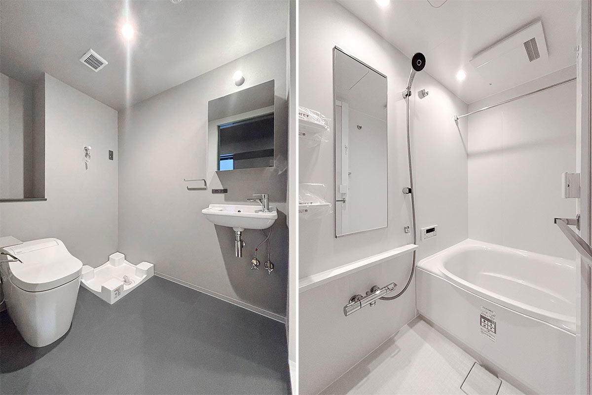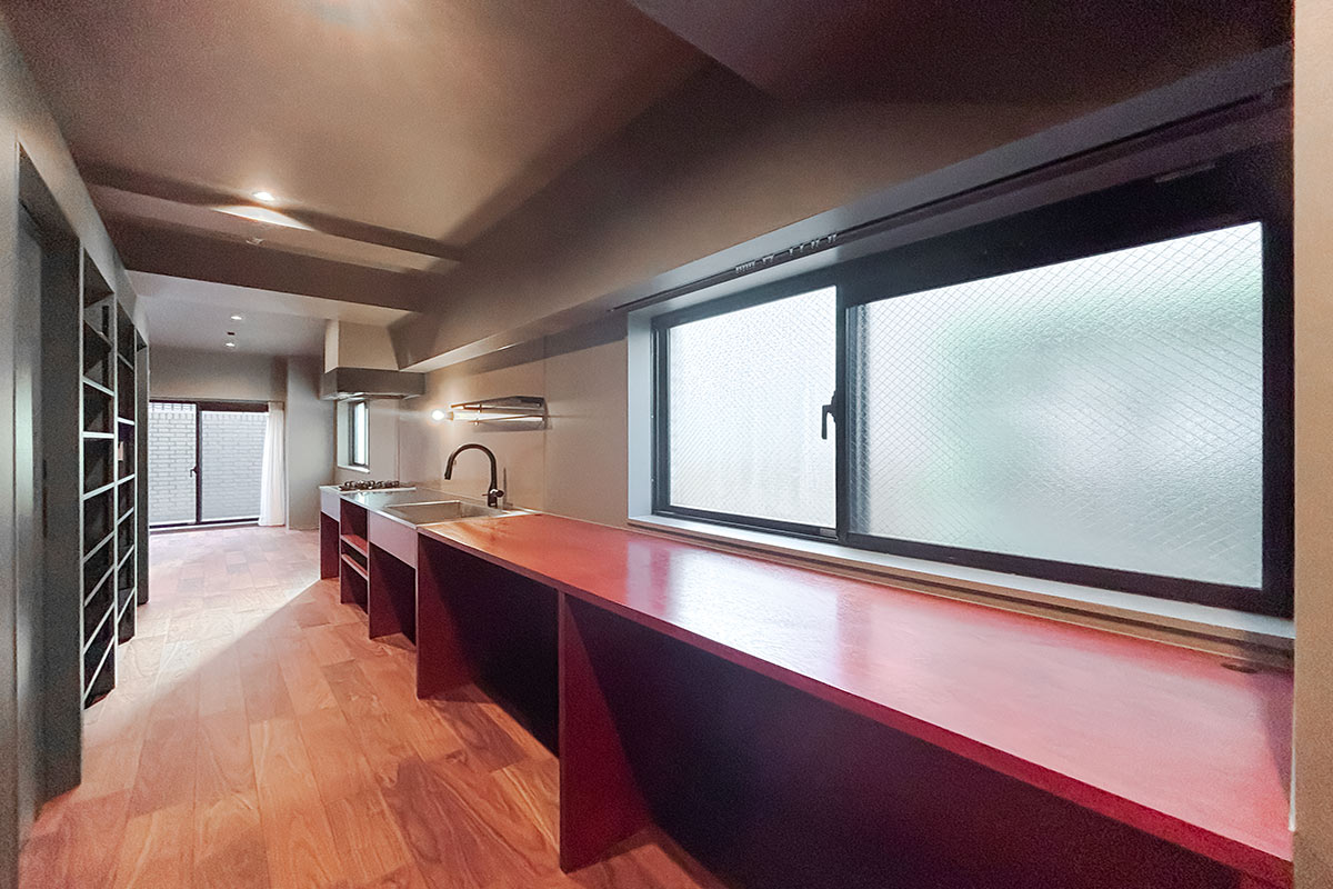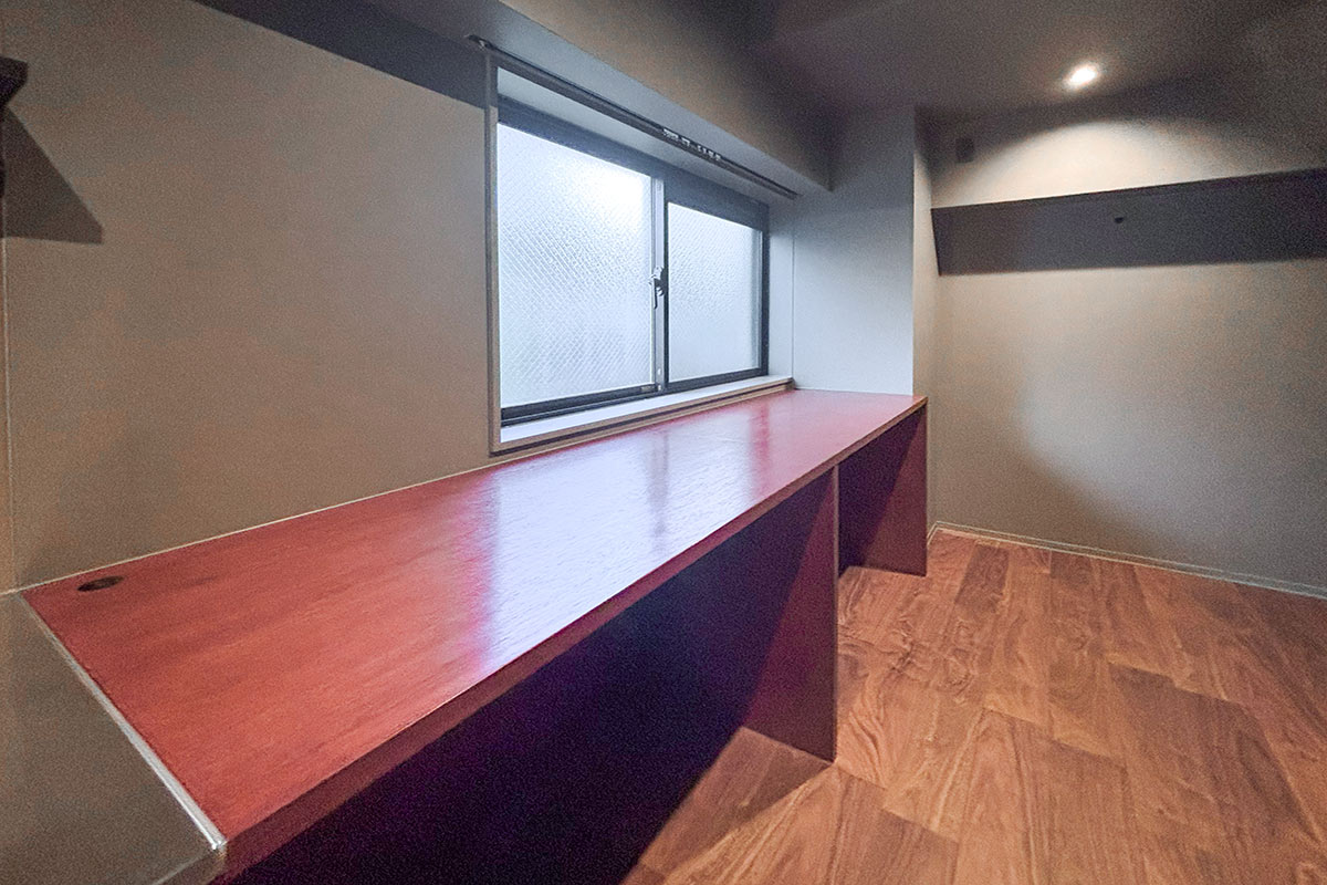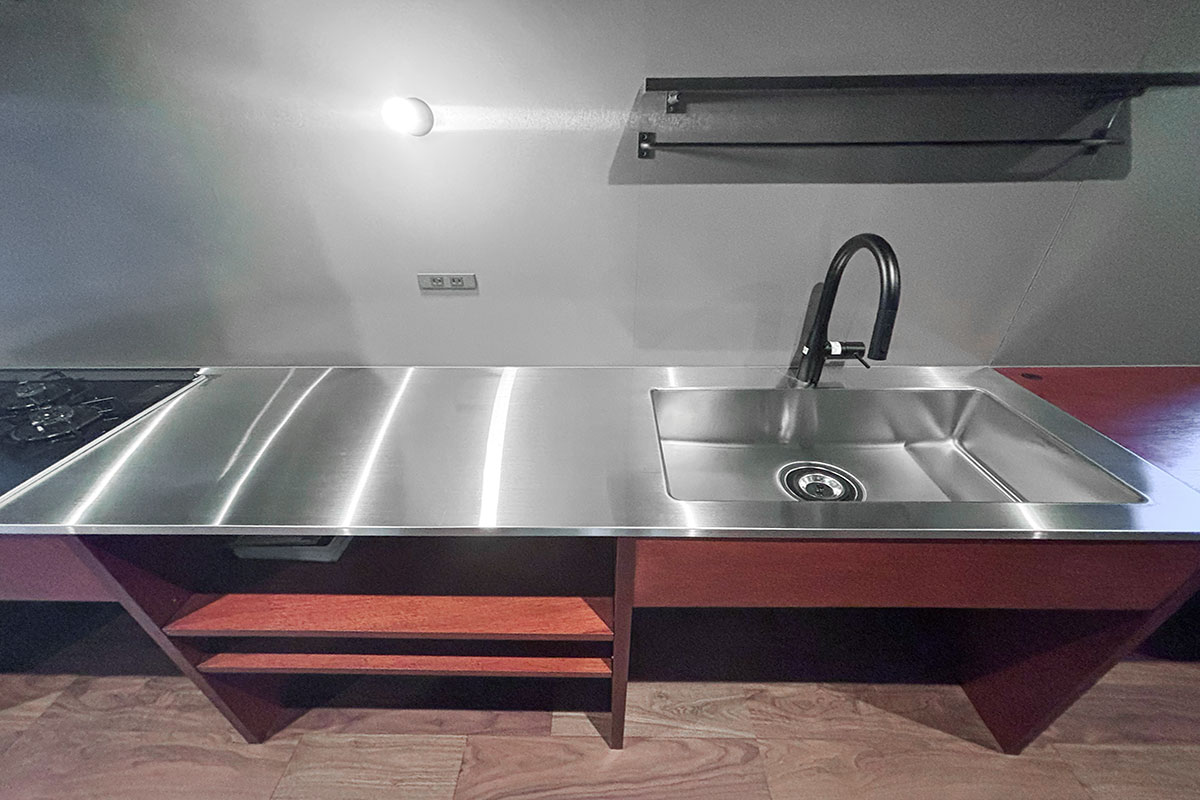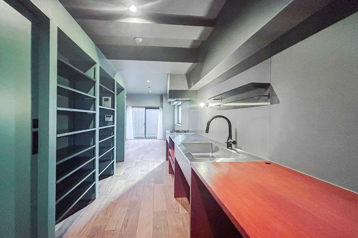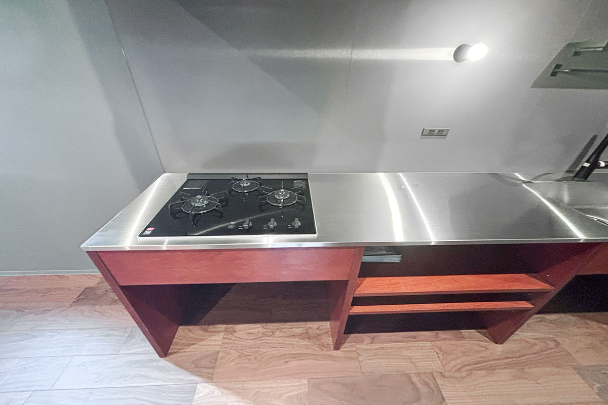 シンクとコンロだけでも十分なスペースですが、さらに広々としたカウンターも設けられ、ささっと食事をとったり、お仕事用にも重宝しそう。