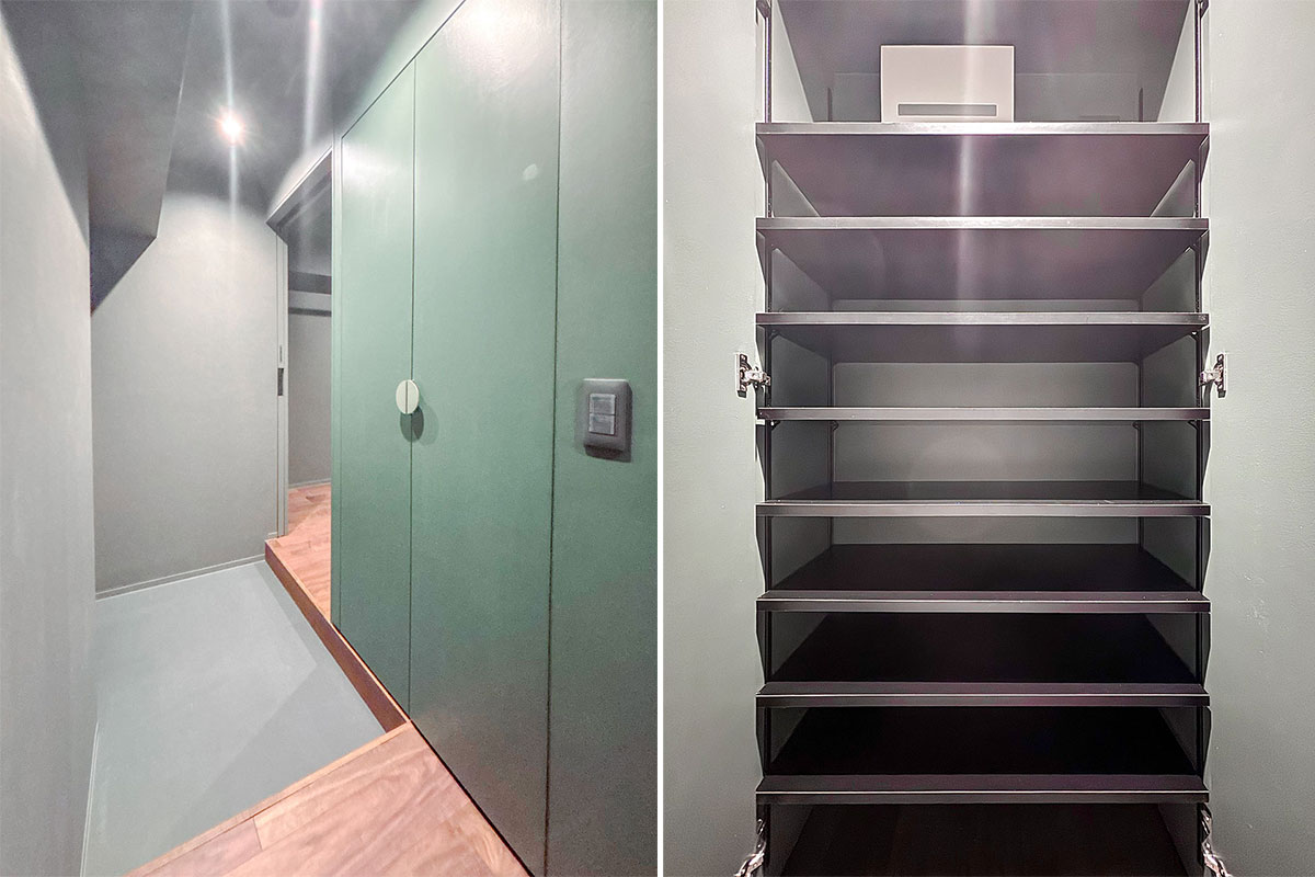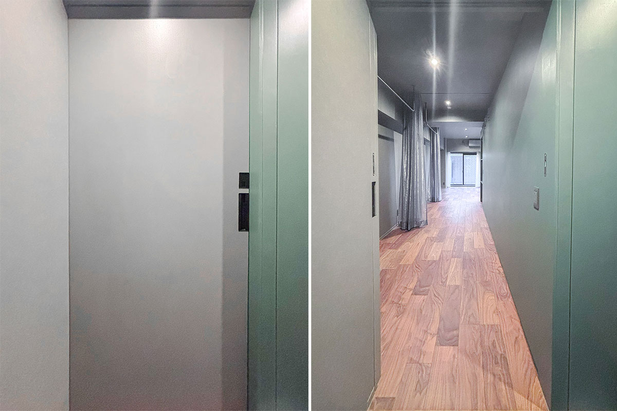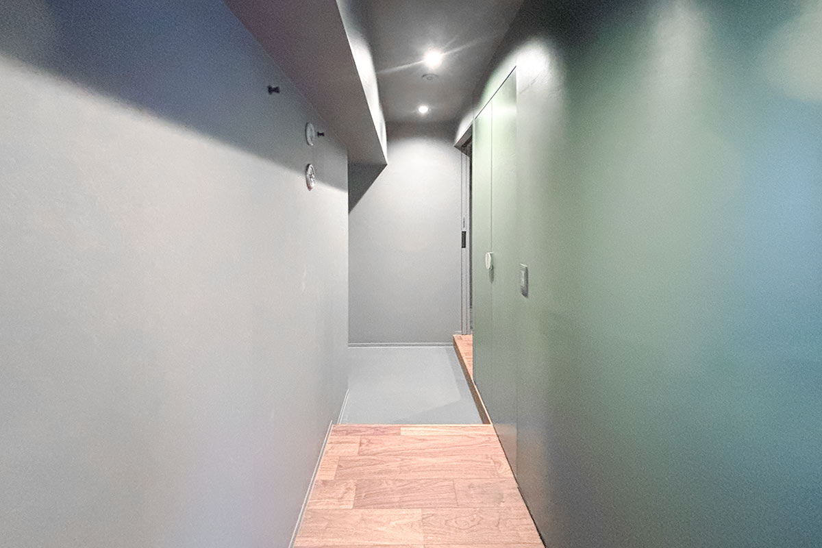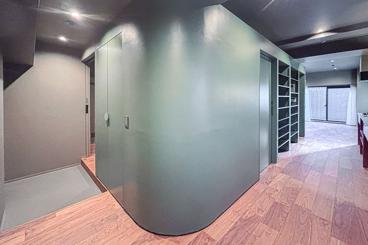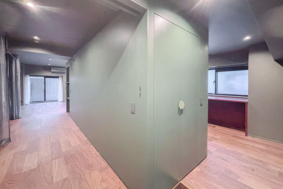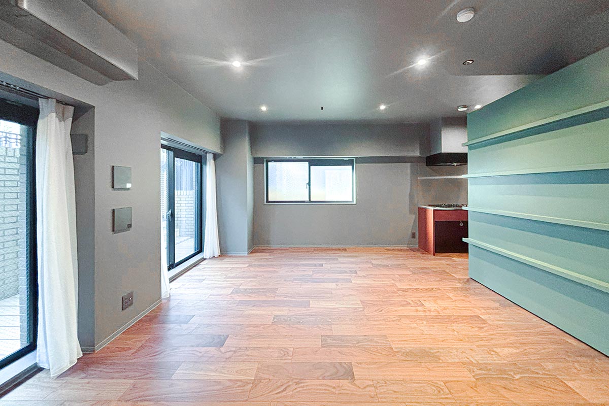 グリーンの壁面にウッディな床材やキッチンがモダンな雰囲気。