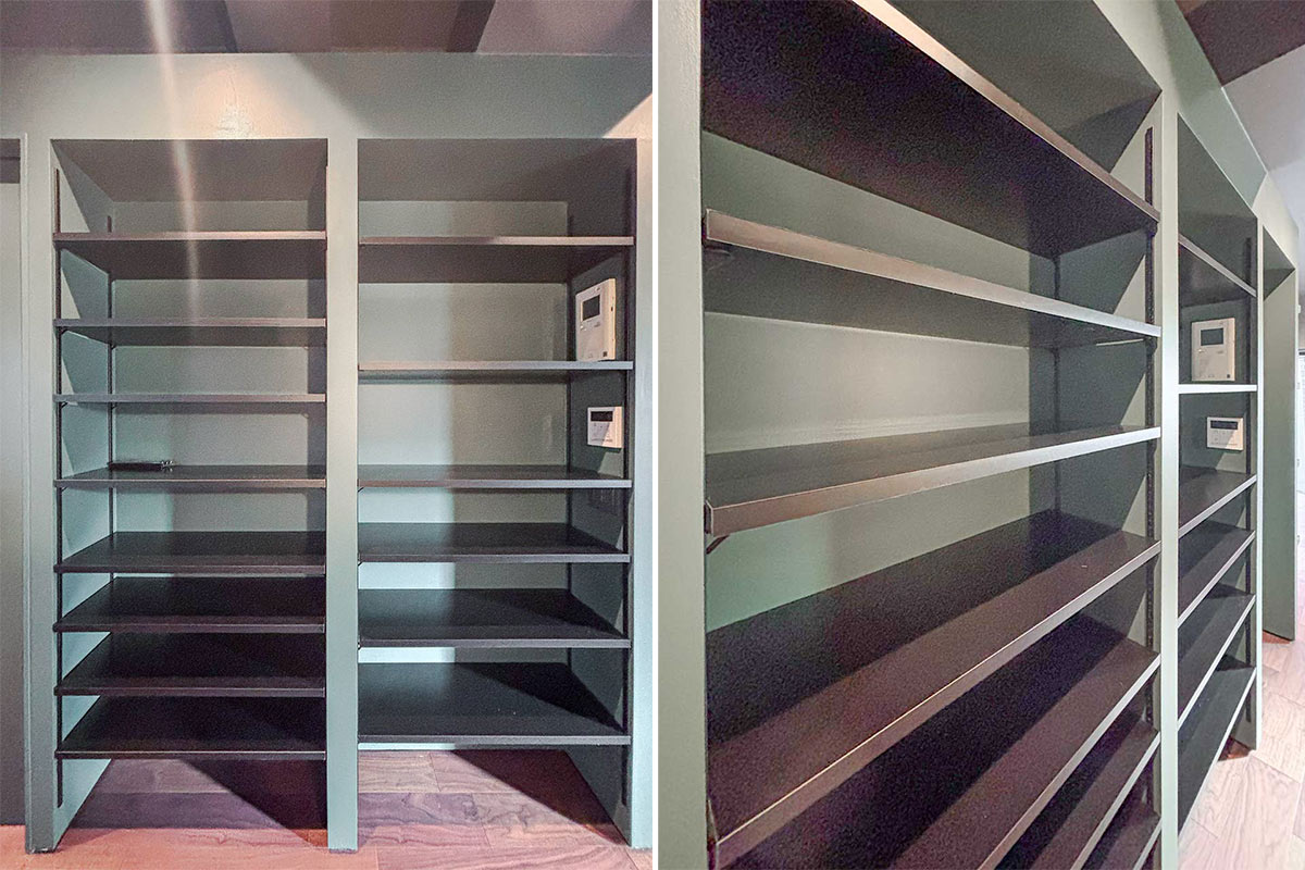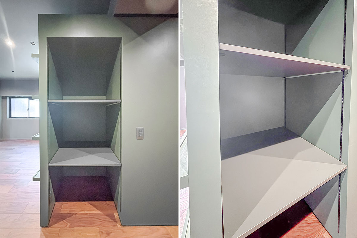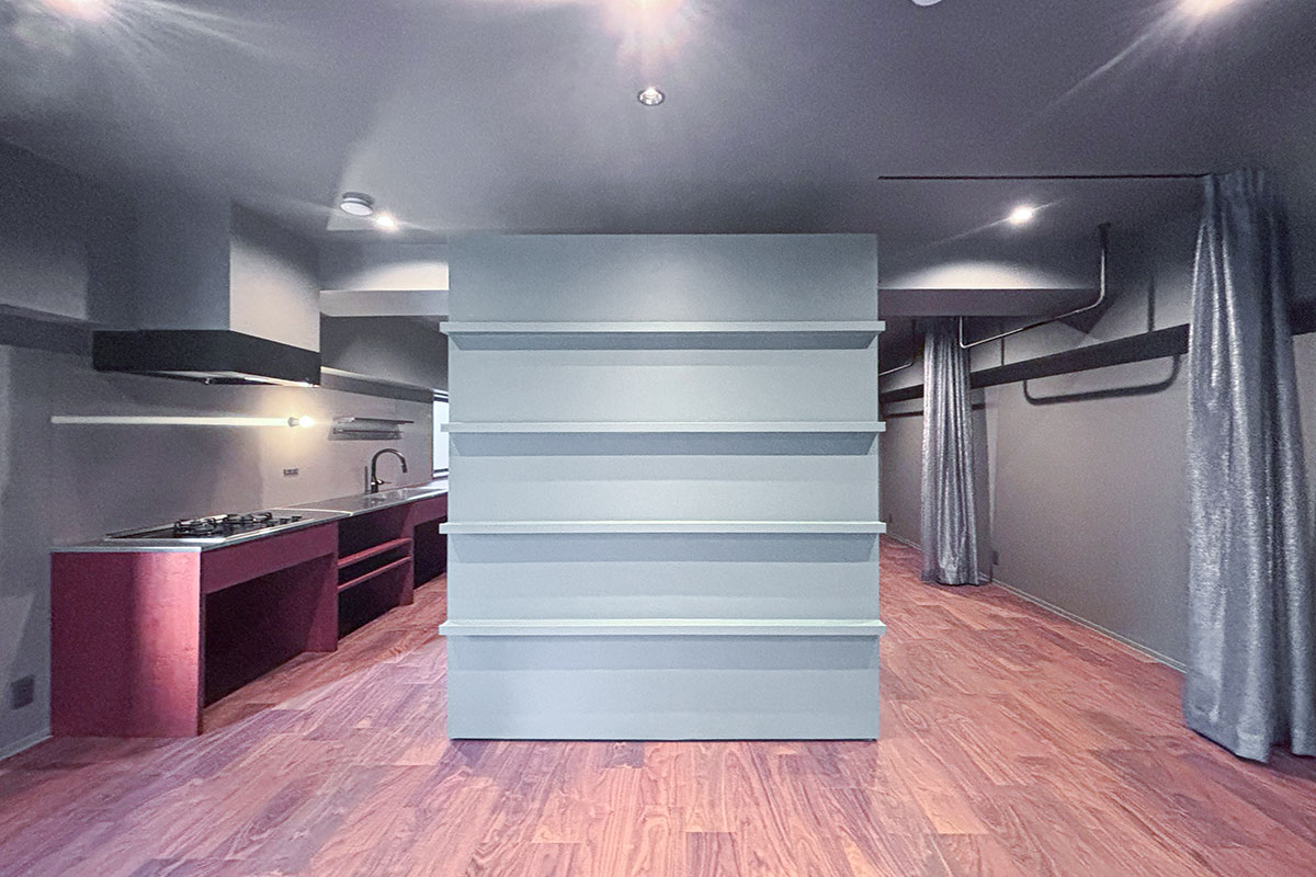 収納はオープンシェルフ+天井付きのハンガーパイプでまるでショップのディスプレイのよう!
