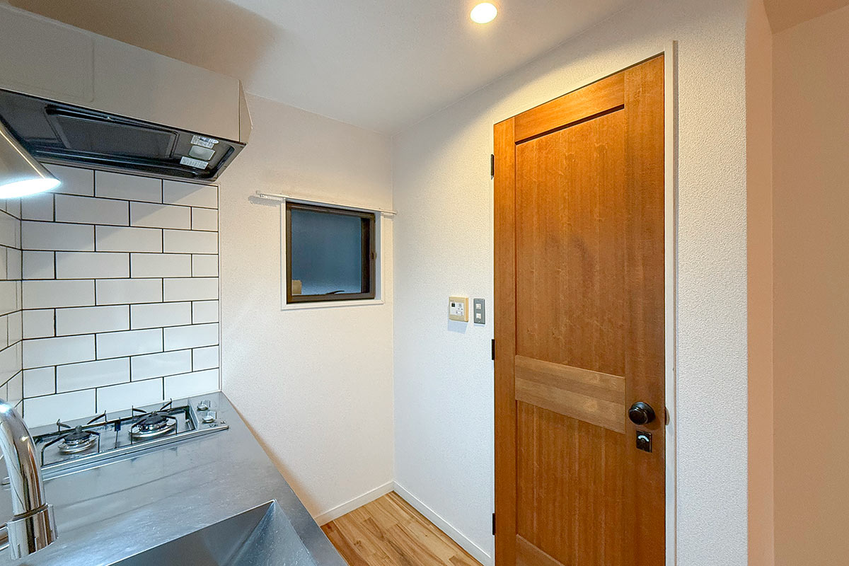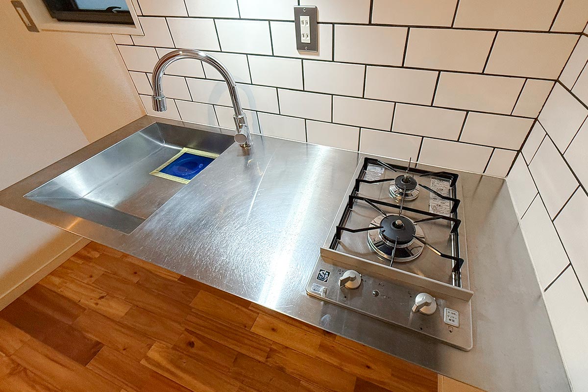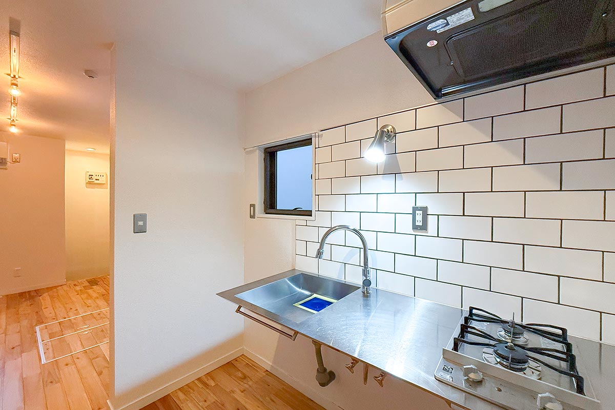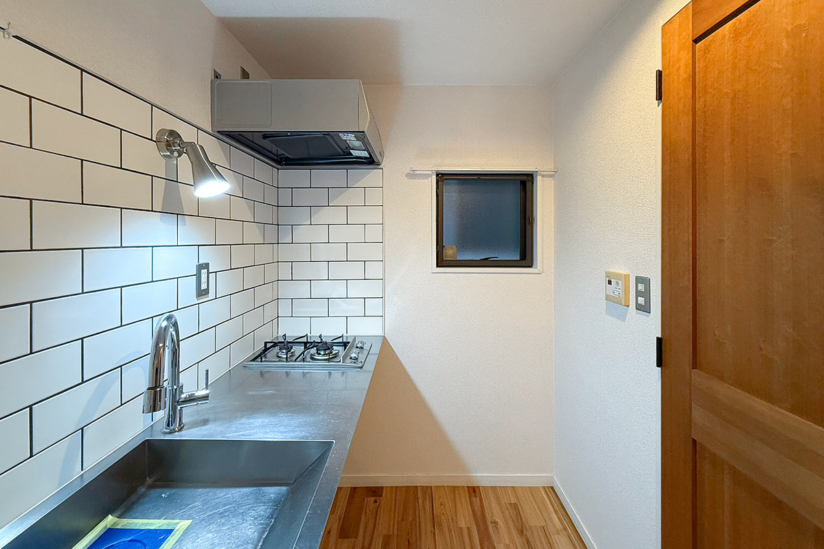 無垢フローリングやタイル壁とステンレスのキッチン。