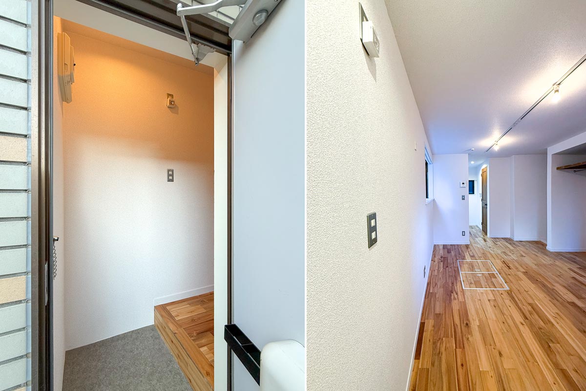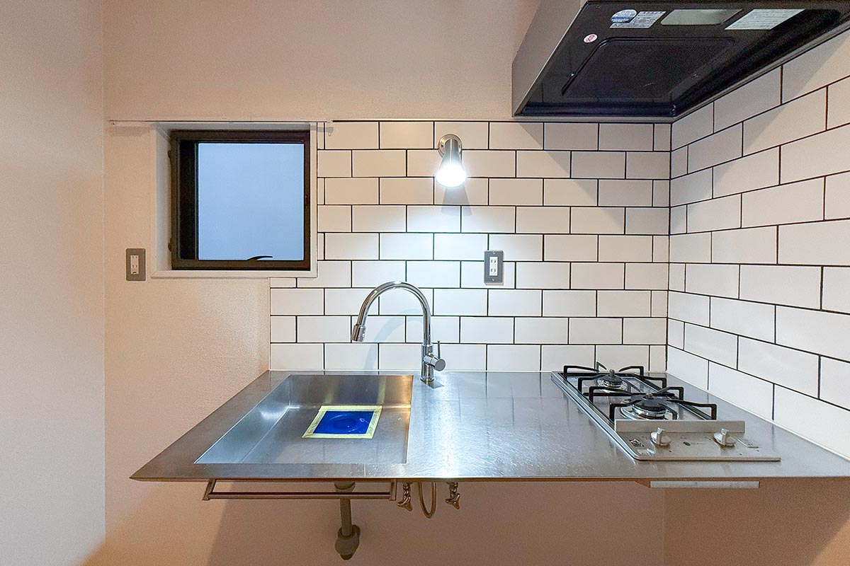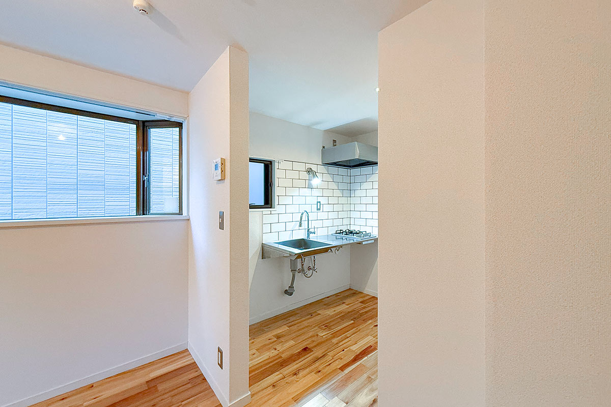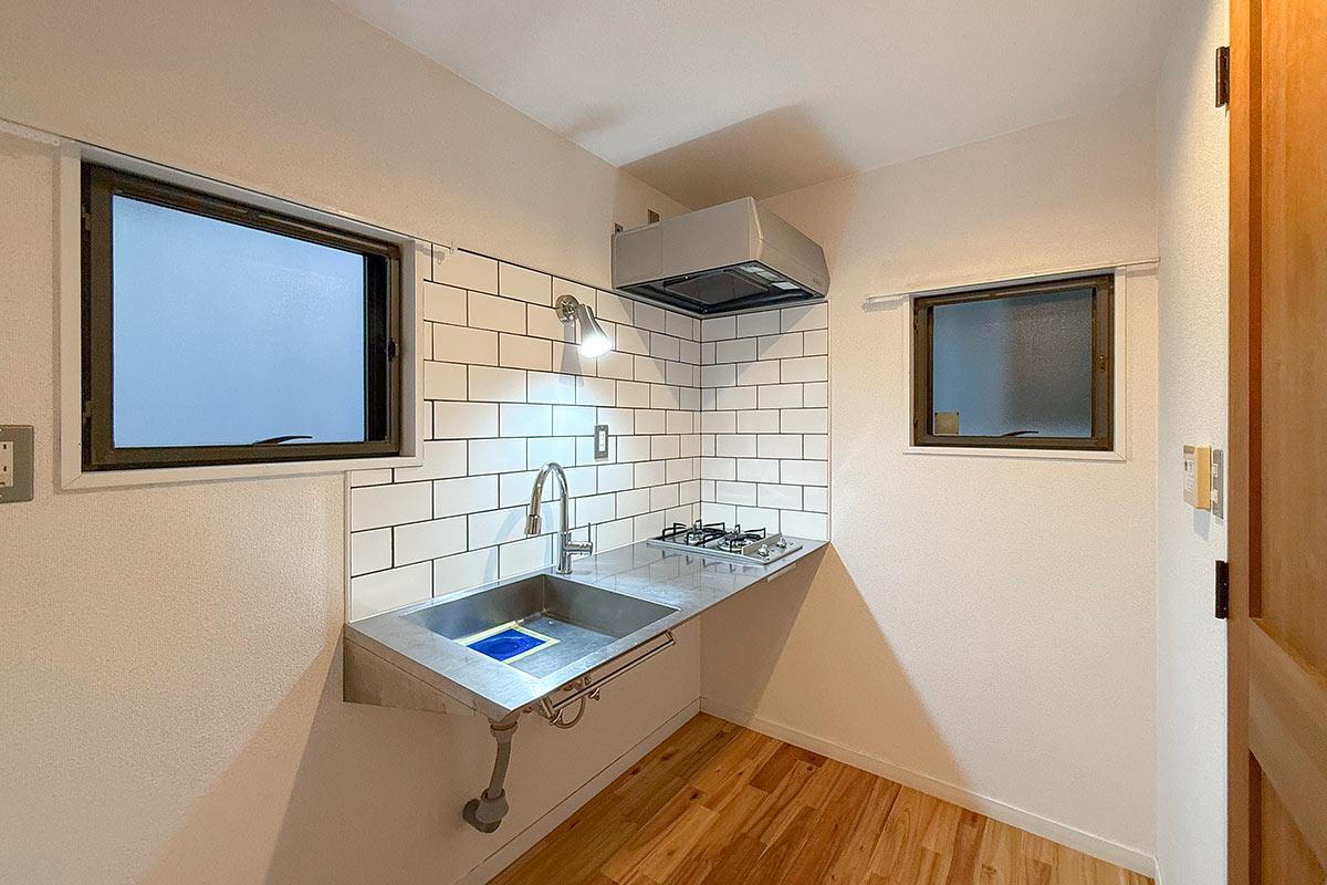 無垢フローリングやタイル壁とステンレスのキッチン。