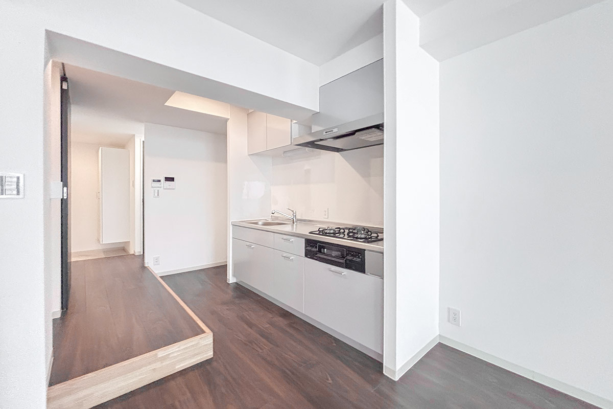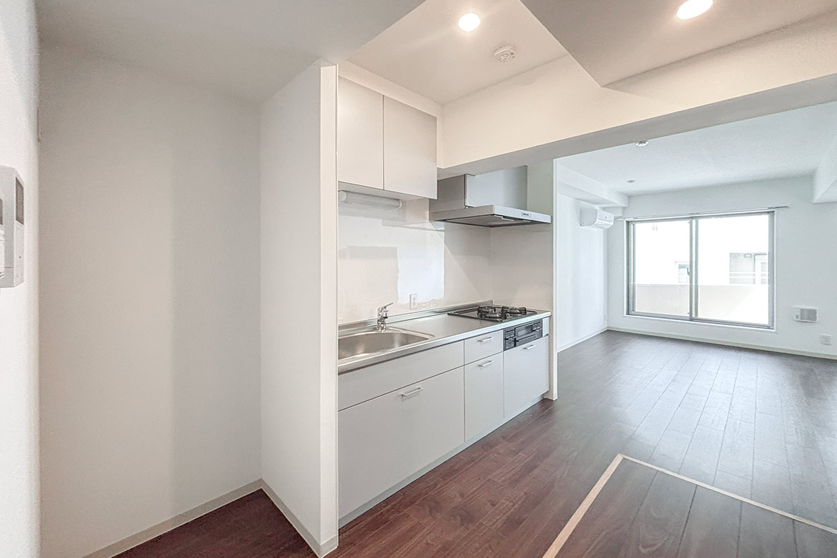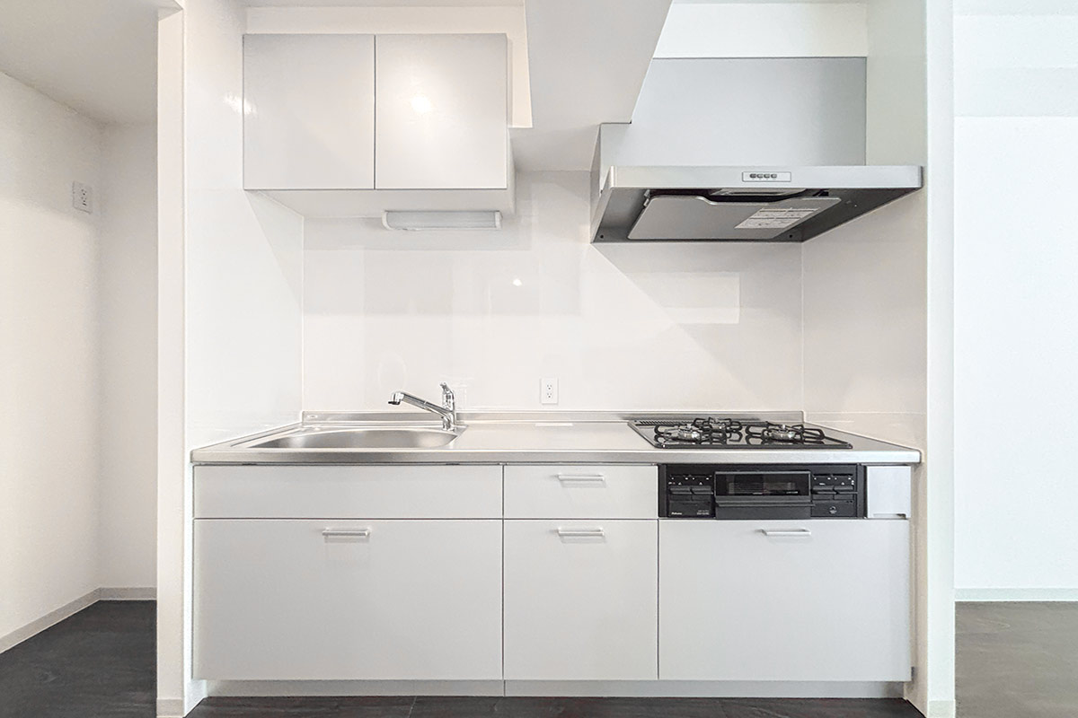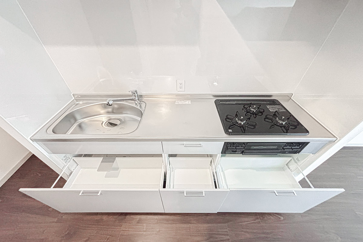 キッチンは3口コンロ、水回りもゆとりを持った配置で暮らしやすい動線でした。