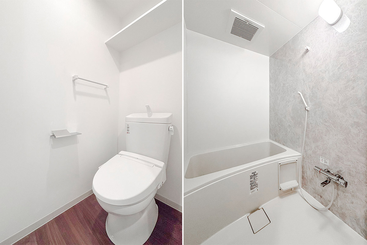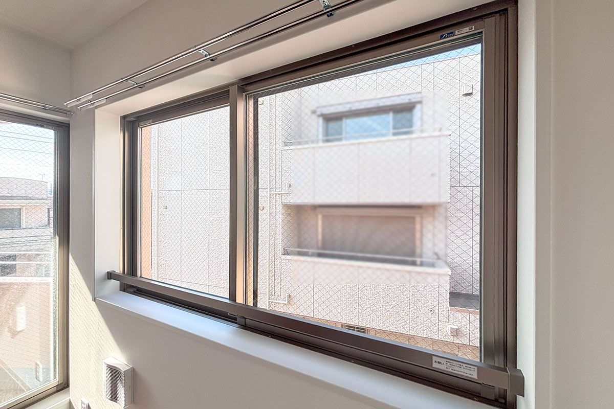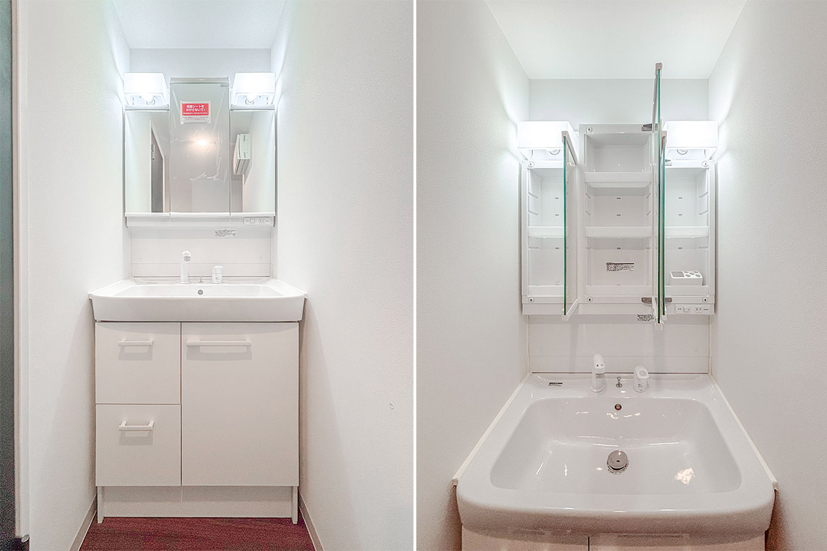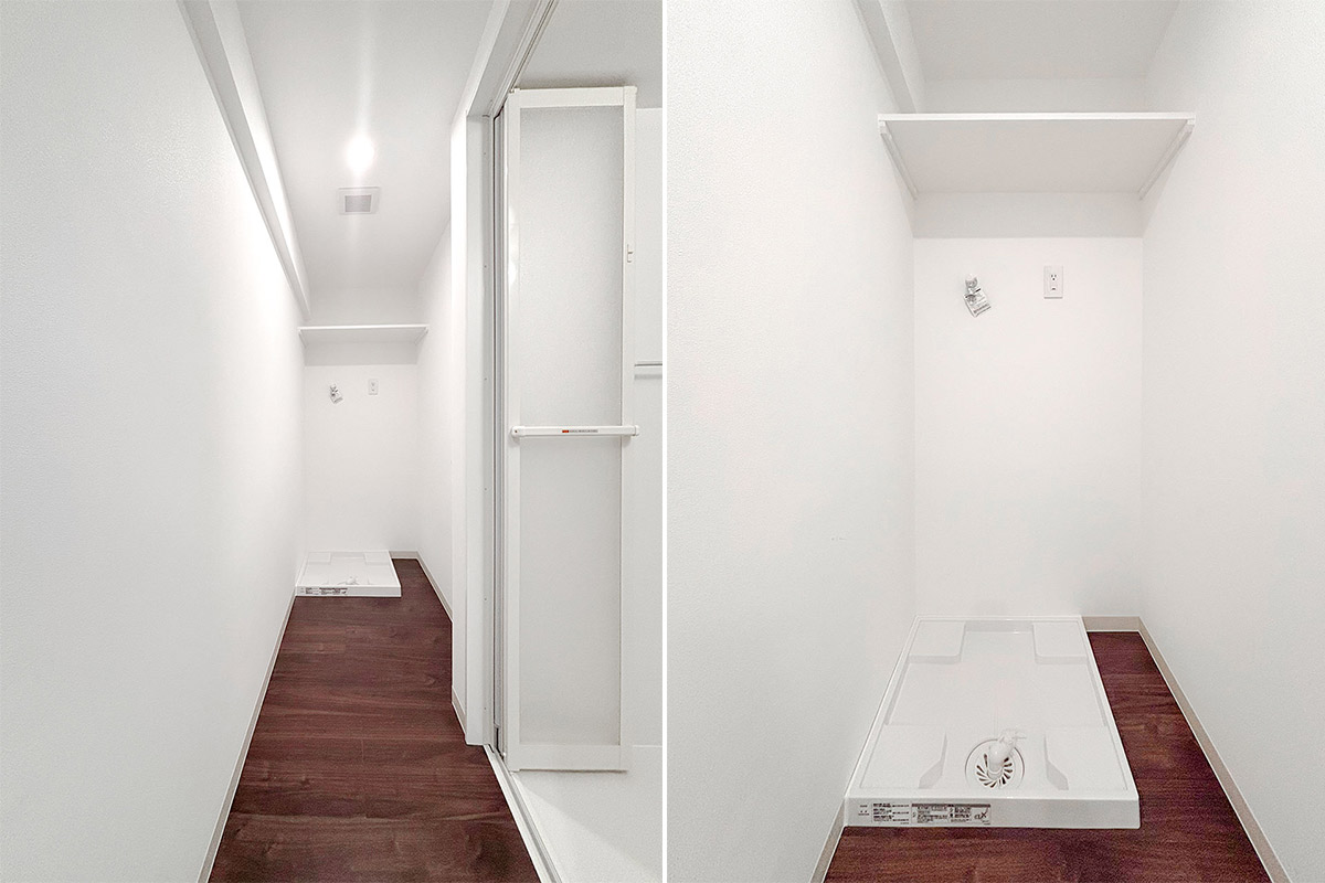 キッチンは3口コンロ、水回りもゆとりを持った配置で暮らしやすい動線でした。