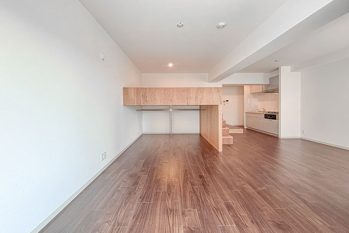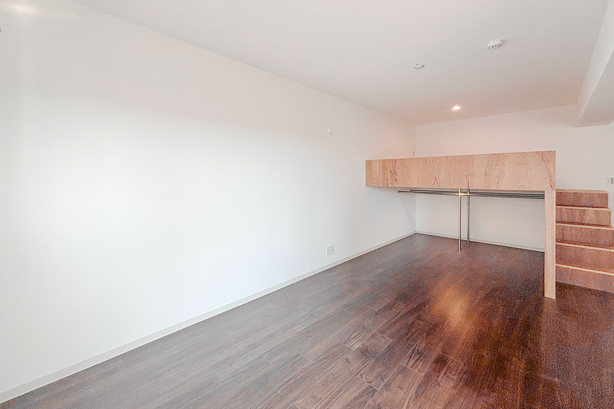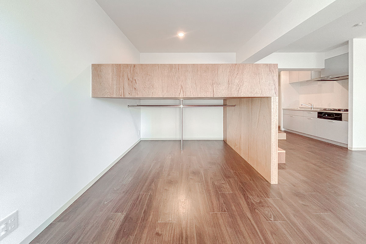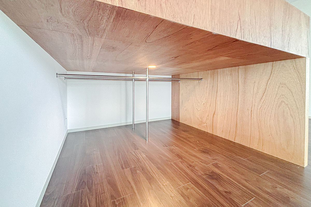 ロフト下にはハンガーパイプの収納スペースがあり、この一角を収納スペースとして使うのもあり!