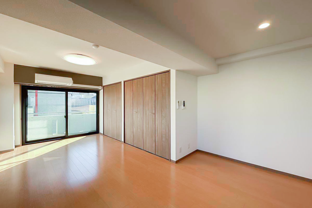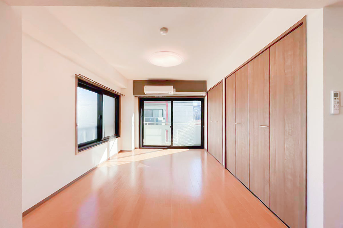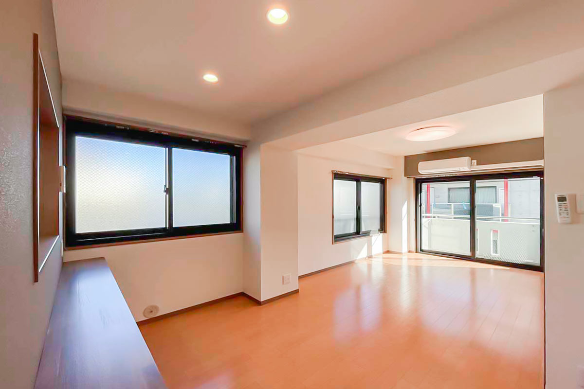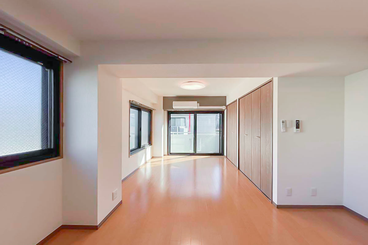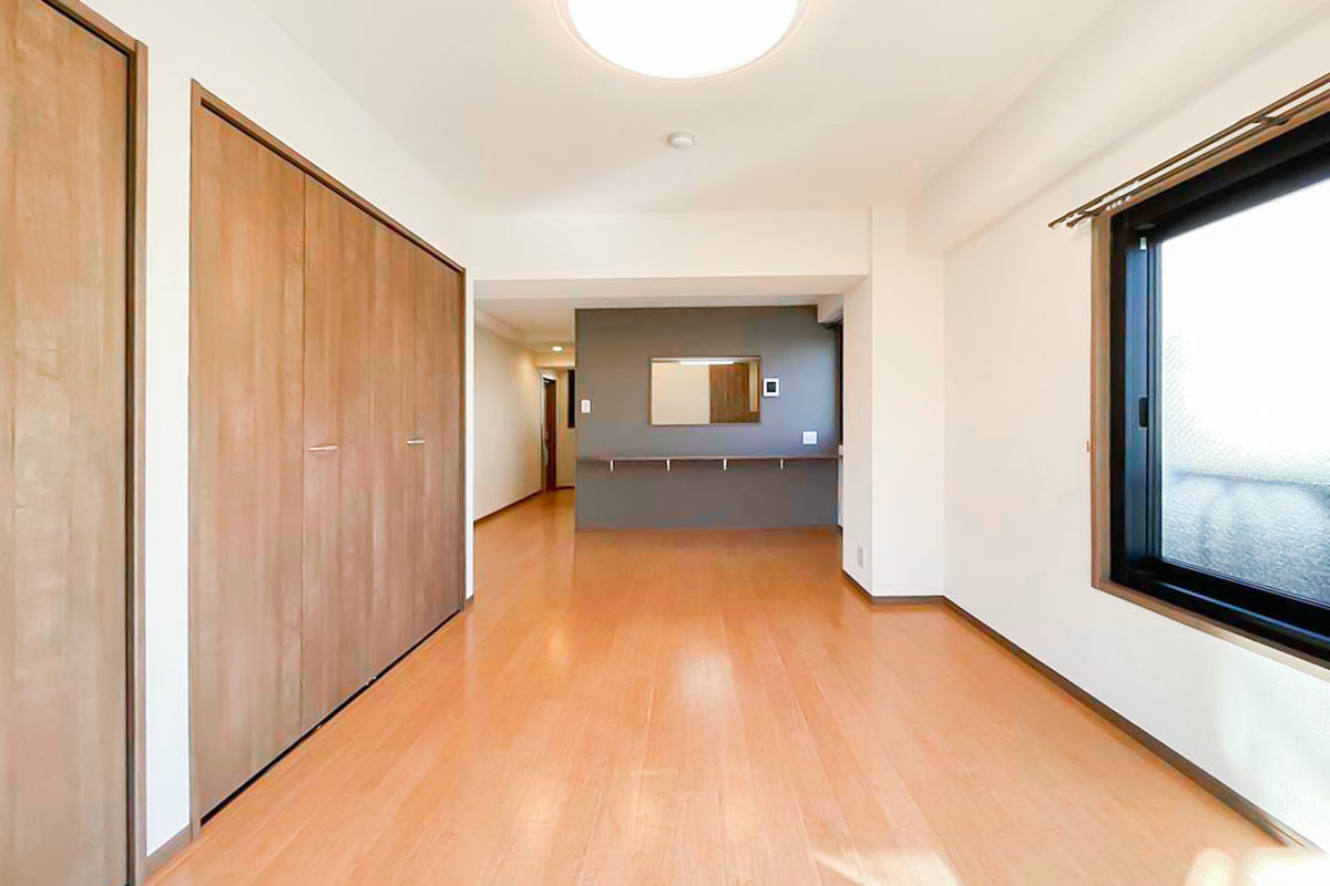 奥行深い形ですが、2面採光のおかげで部屋全体が明るく、さらに南向きで陽当たり良好なお部屋です。
