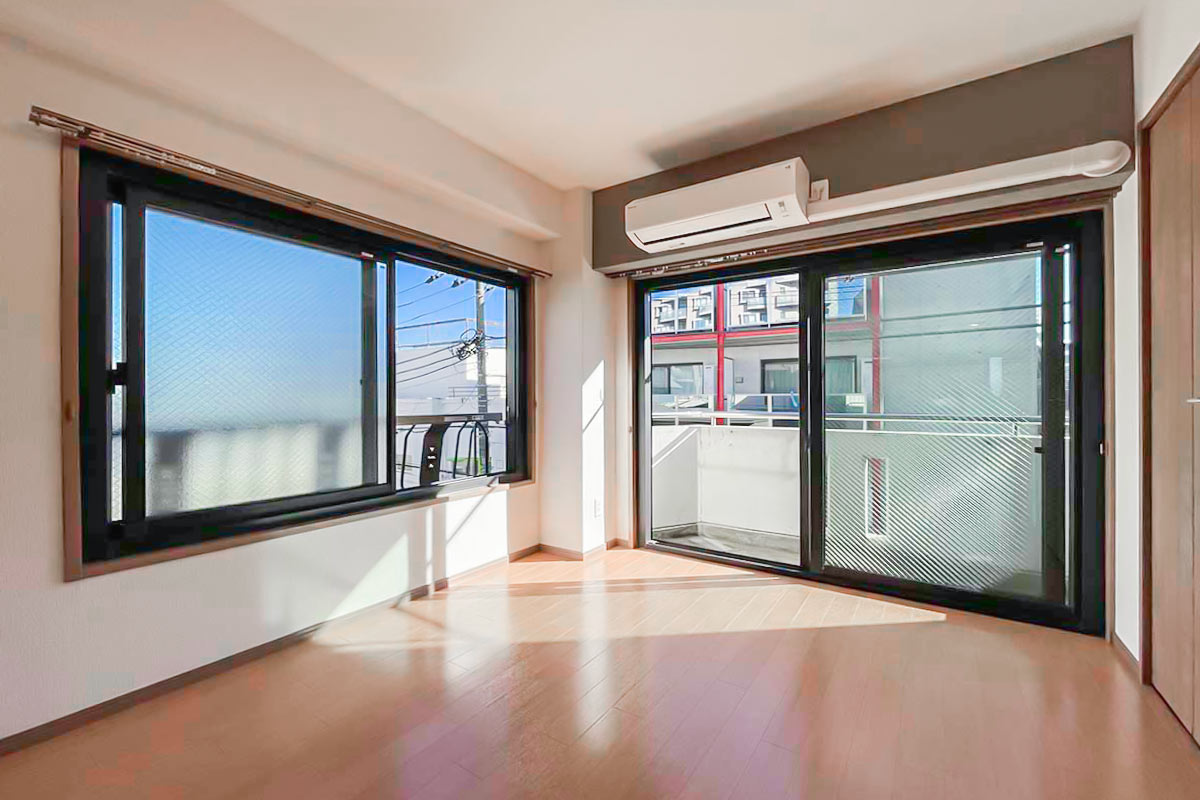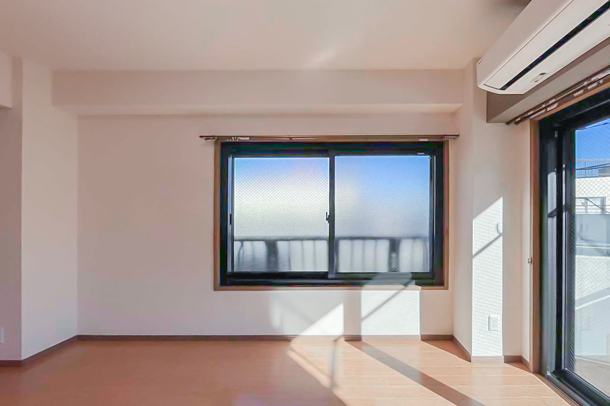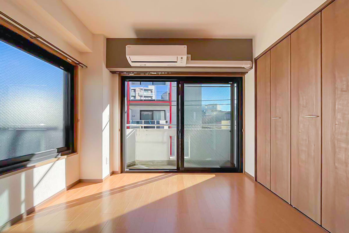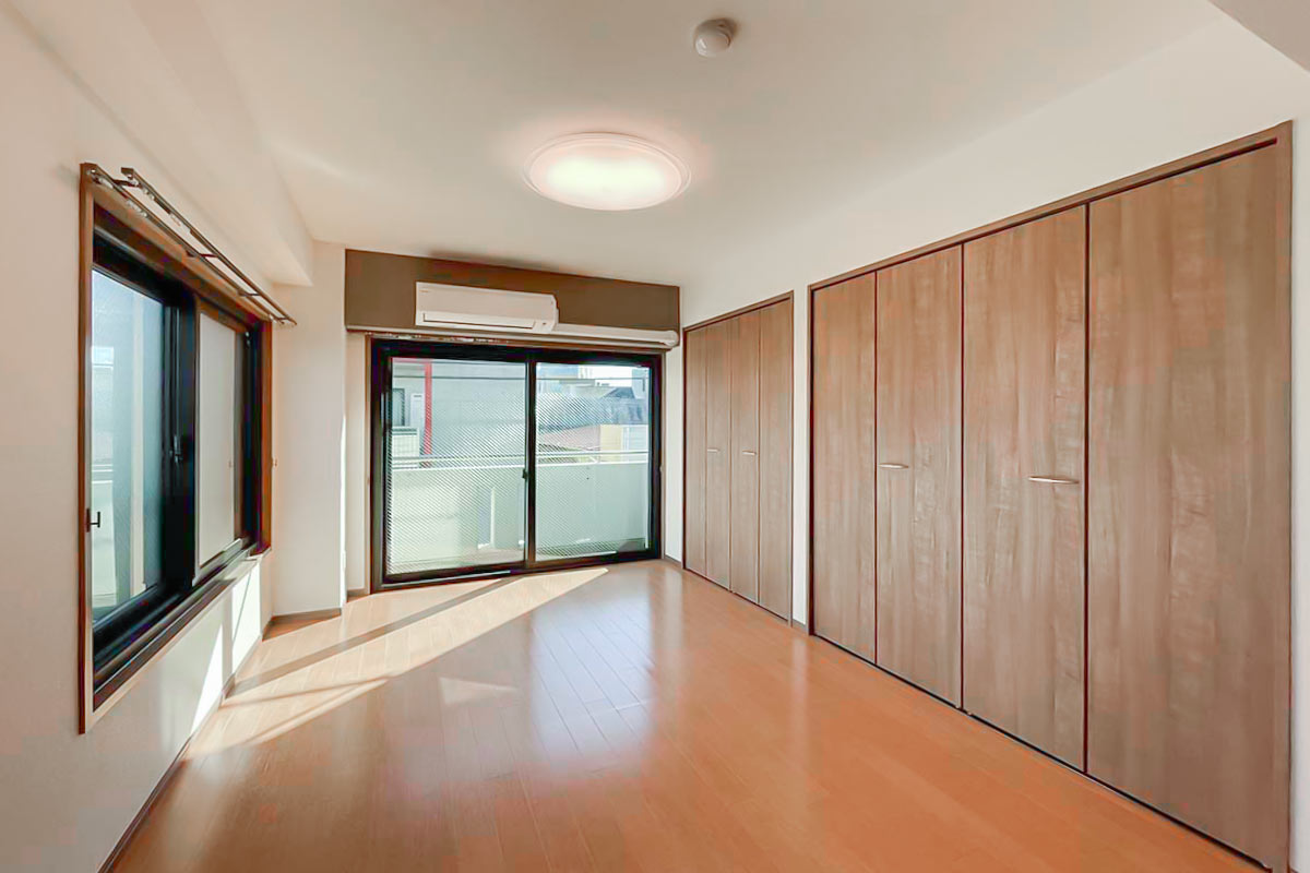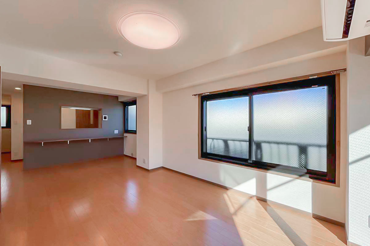 奥行深い形ですが、2面採光のおかげで部屋全体が明るく、さらに南向きで陽当たり良好なお部屋です。