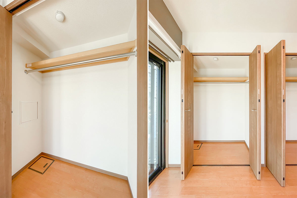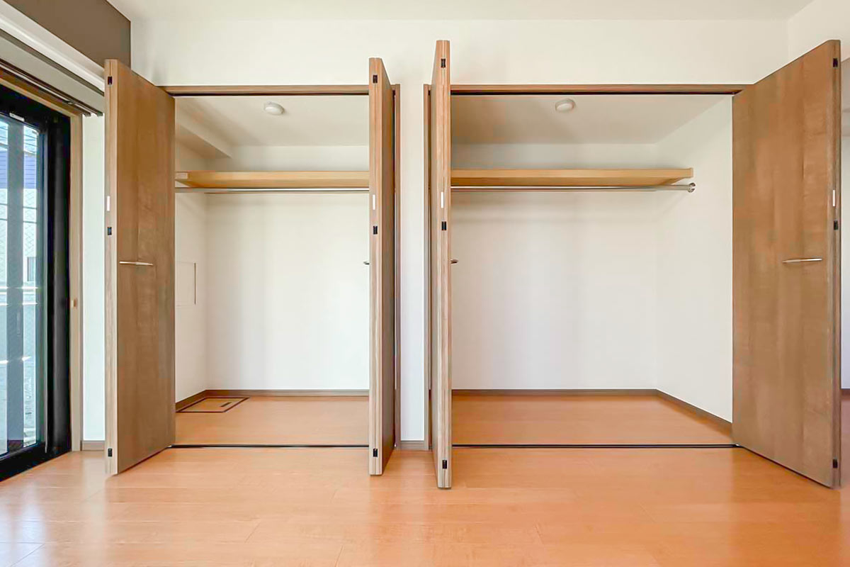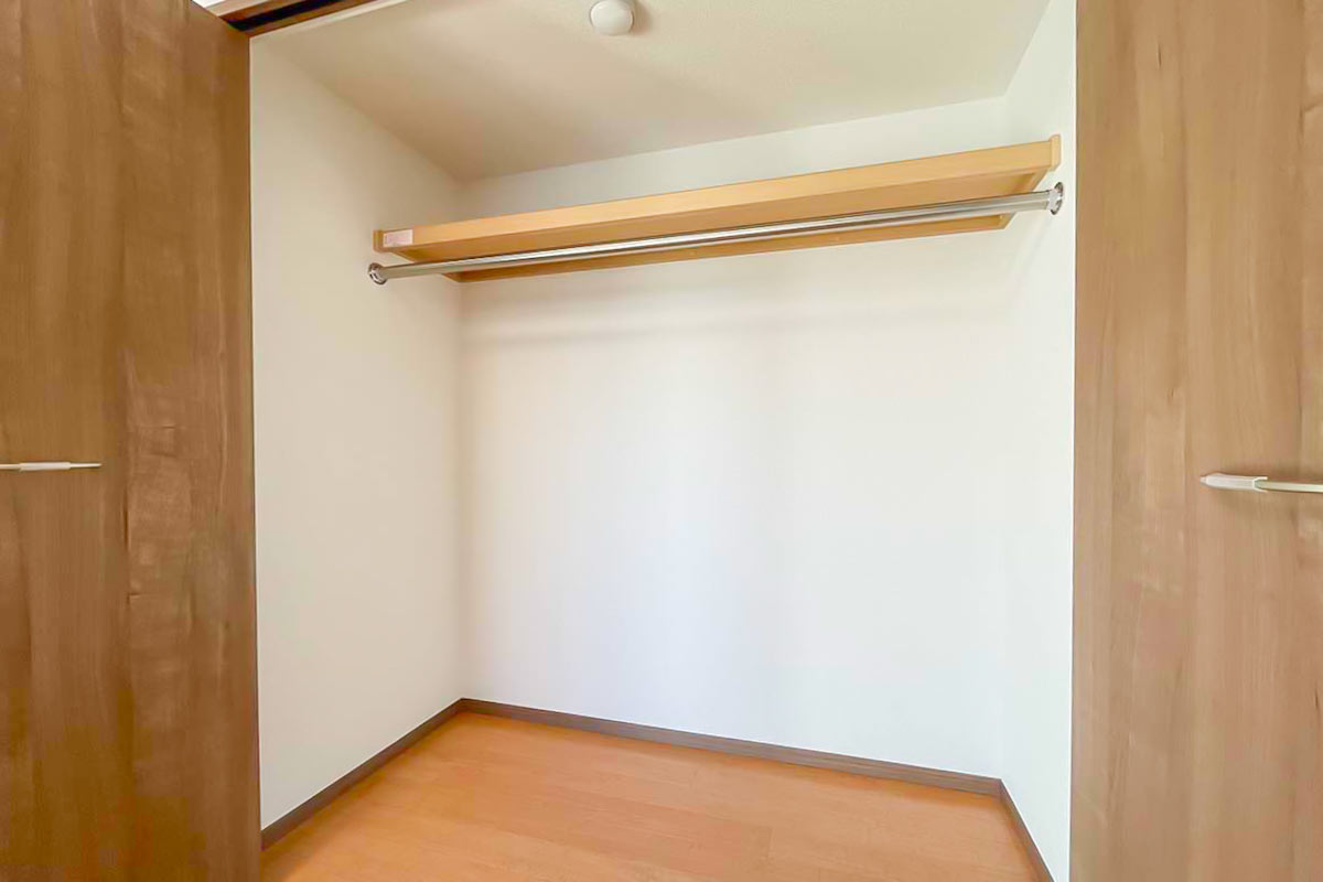 収納は壁一面にたっぷり、ウォークインクローゼットがあるようなボリュームです!