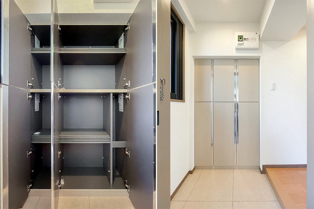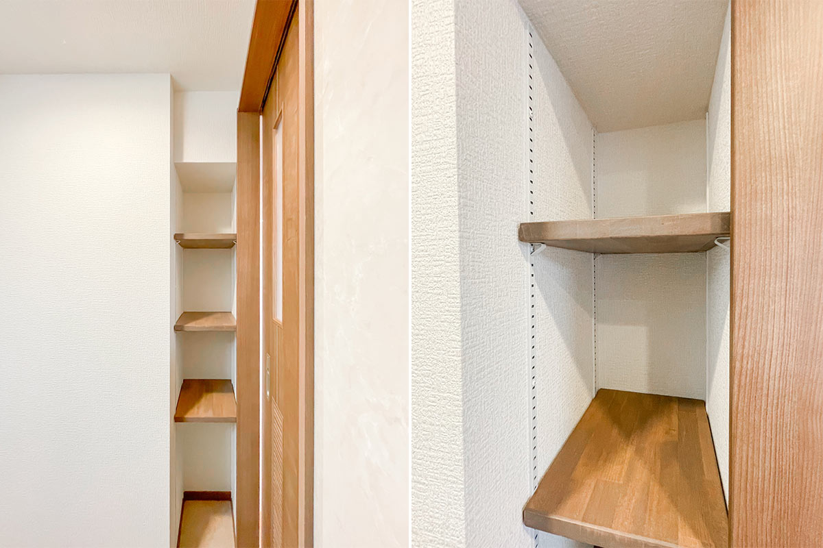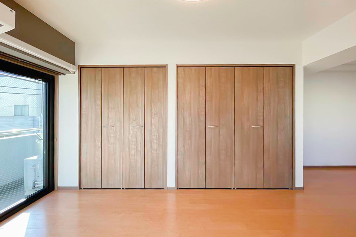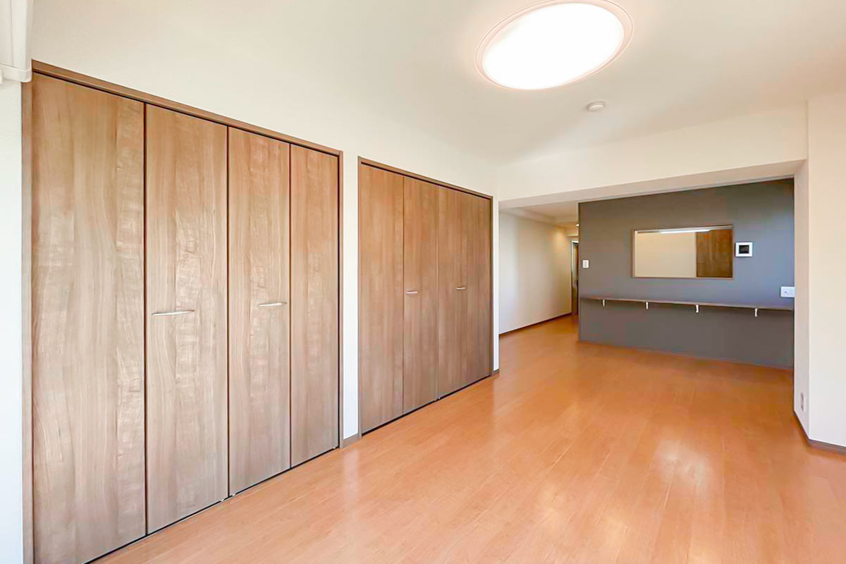 収納は壁一面にたっぷり、ウォークインクローゼットがあるようなボリュームです!