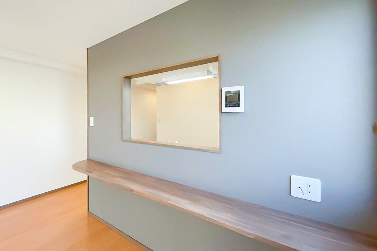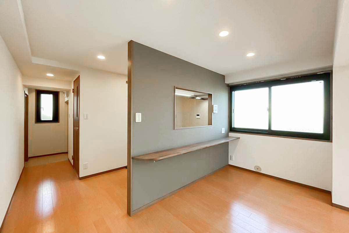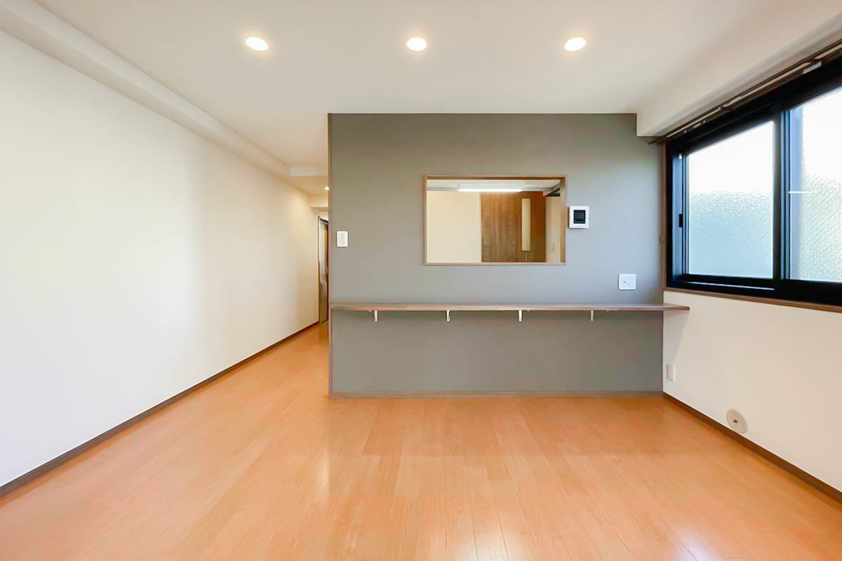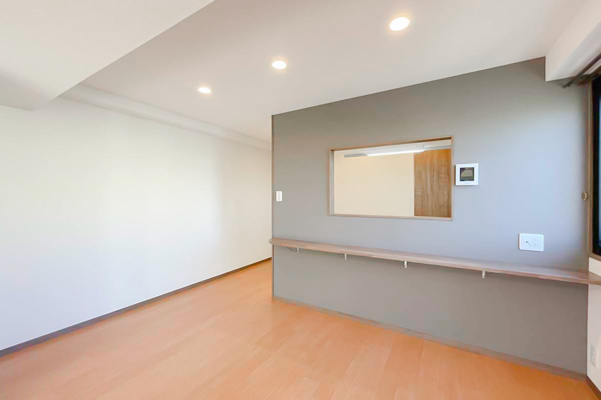 部屋の奥にベッドスペース、手前はキッチンカウンターをダイニングテーブル代わりにして家財は少なめが吉。
