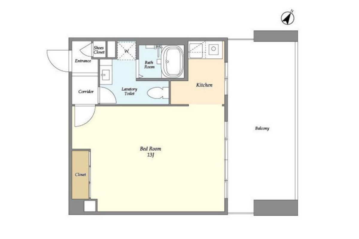 お部屋は4階の角部屋、約13帖のゆったりワンルーム。