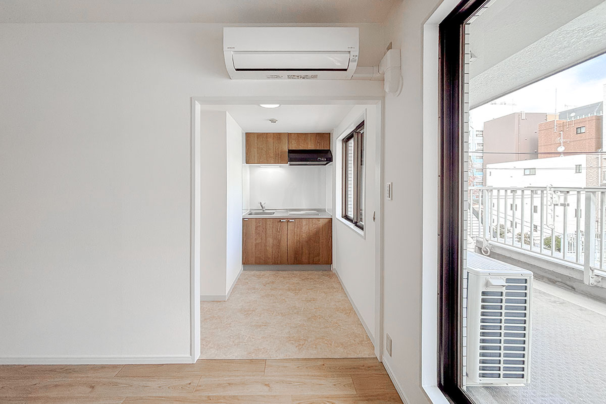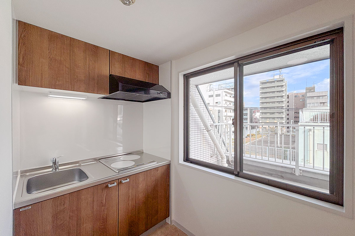 バルコニーに面した大きめな窓から光差し込む明るいキッチンです◎