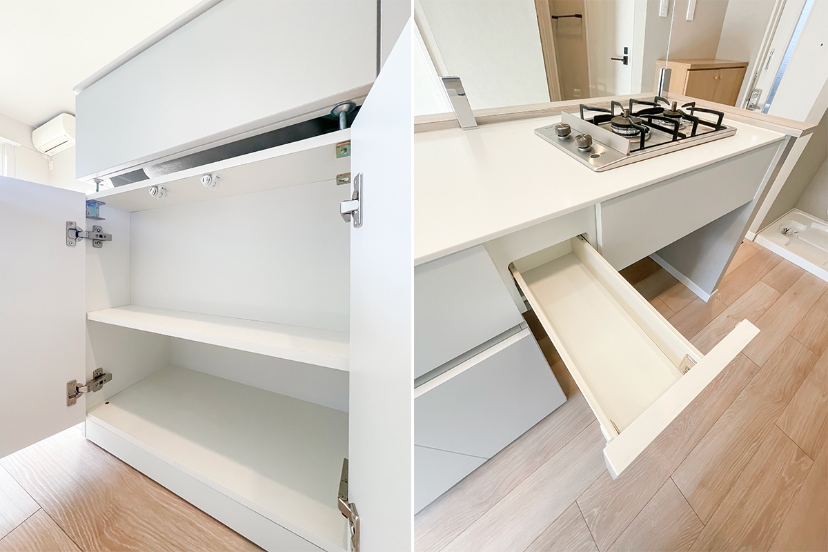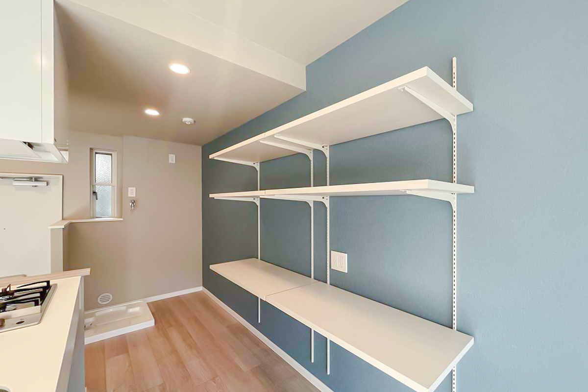 可動式の棚も活用して、素敵にキッチン家電・鍋・お皿等を飾る用に収納しましょう。