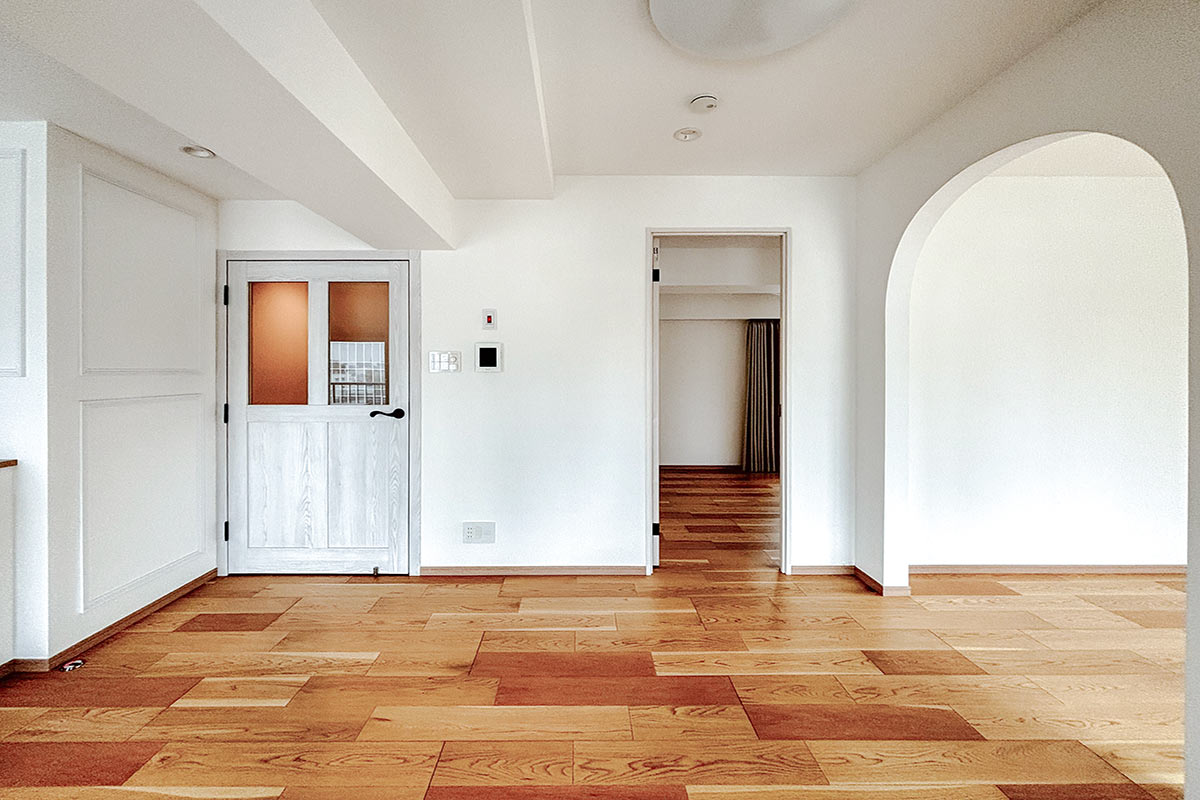 まず目を惹かれるのは、ダイニングキッチンとリビングをつなぐアール壁!