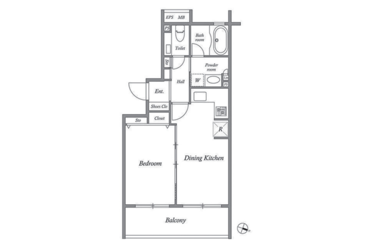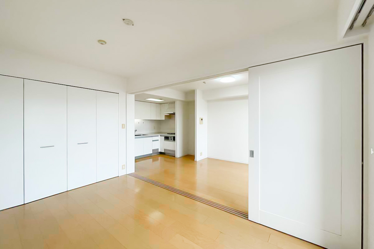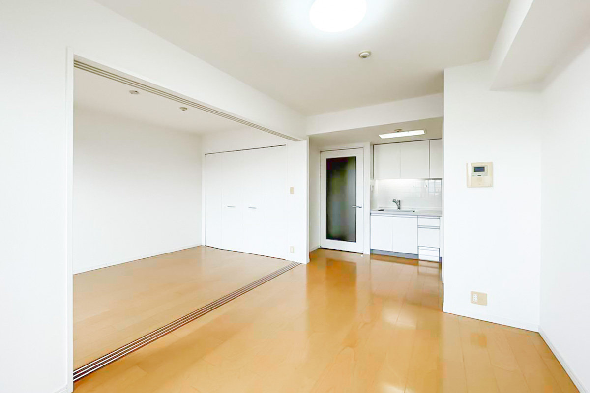 1LDKといってもLDKと洋室を足して15~16帖の空間なので、日中は広いワンルームとして使い、空調を考えて夜だけ寝室を区切るといった使い方になりそうな間取りです。