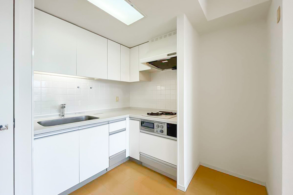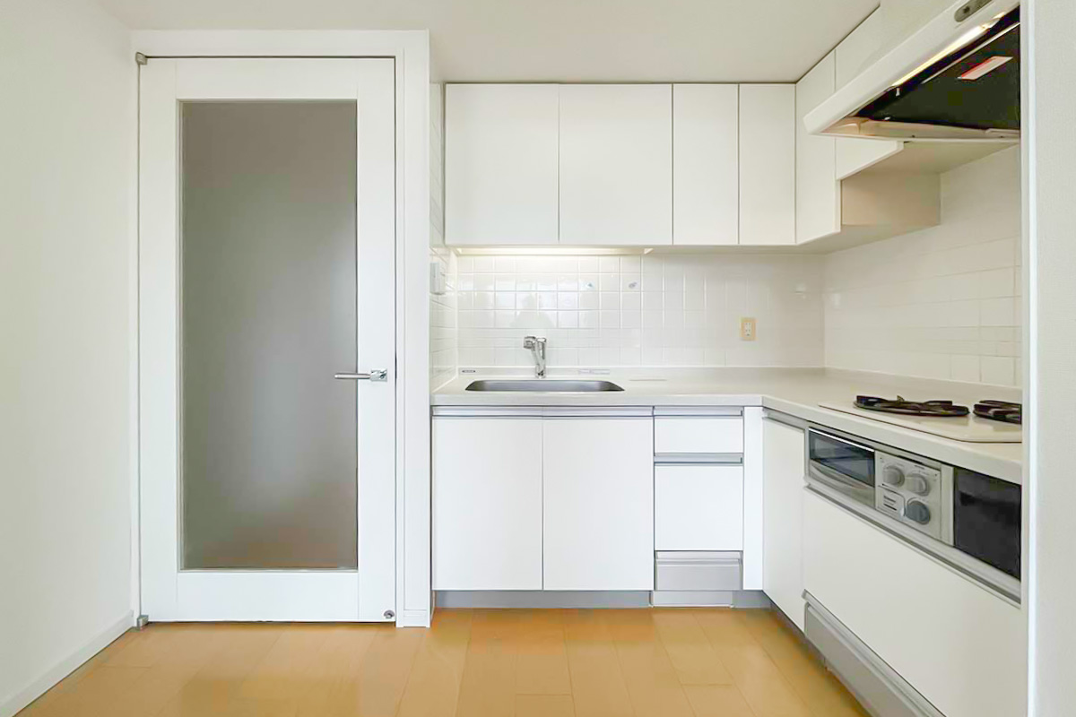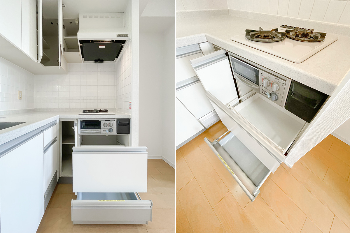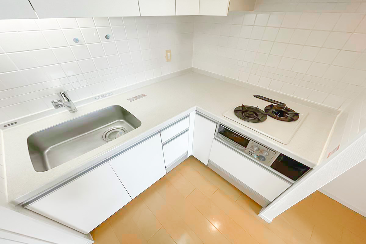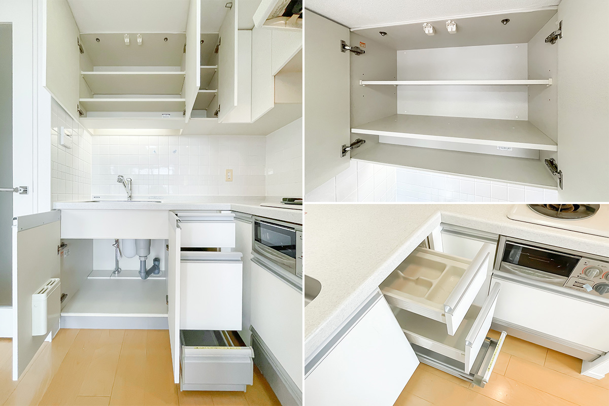 L字キッチンでスペース広く、収納もたっぷり。自炊派には嬉しいですね。