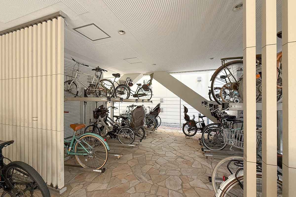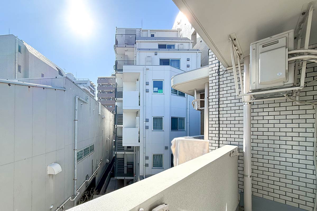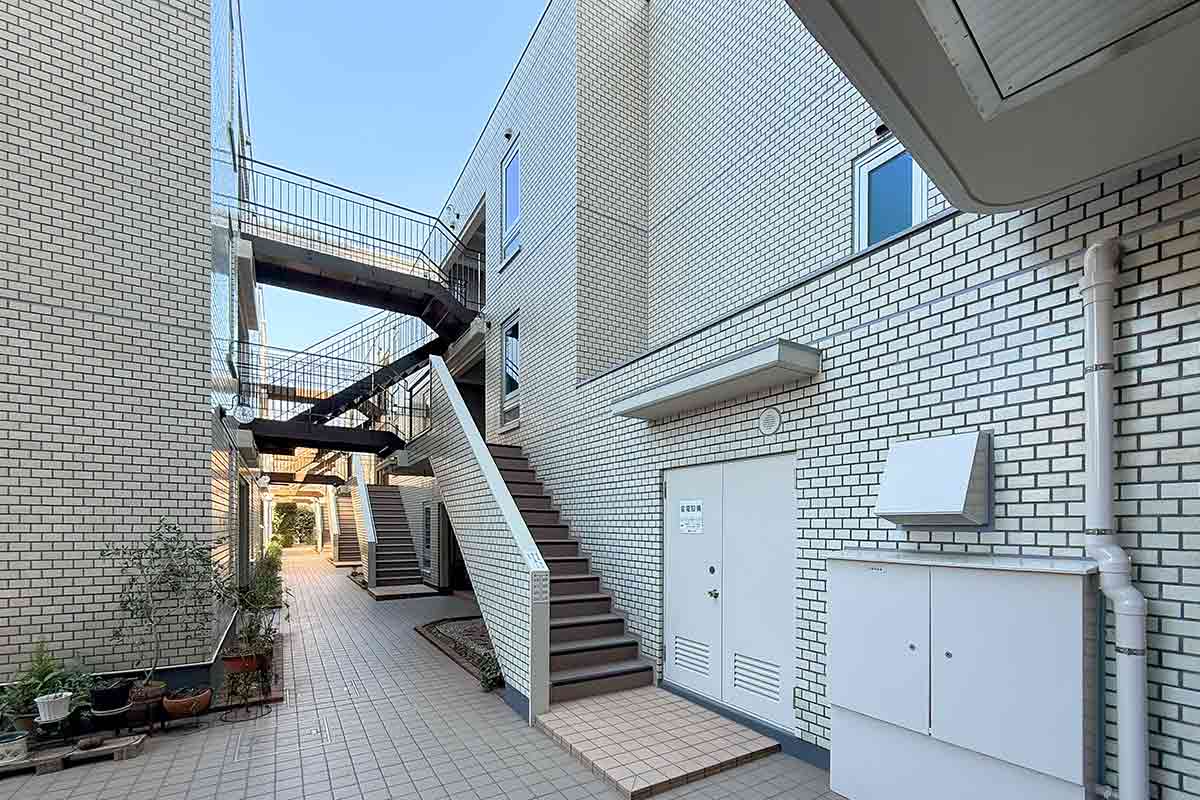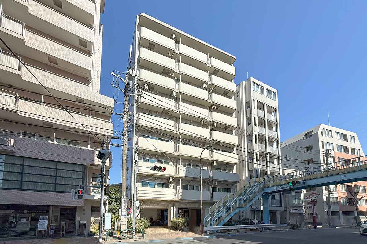 賑わい感じる世田谷通りのアーケード街を抜け、住宅が増えてきた先にある白いタイル壁のマンション。