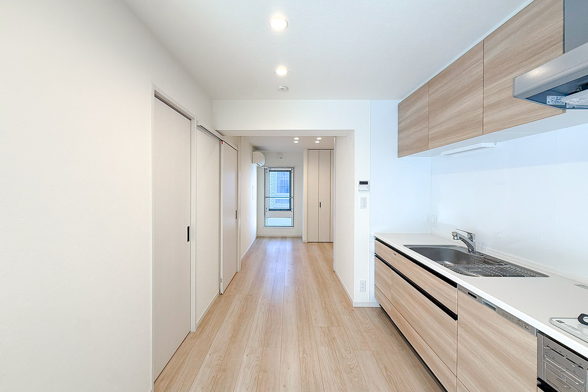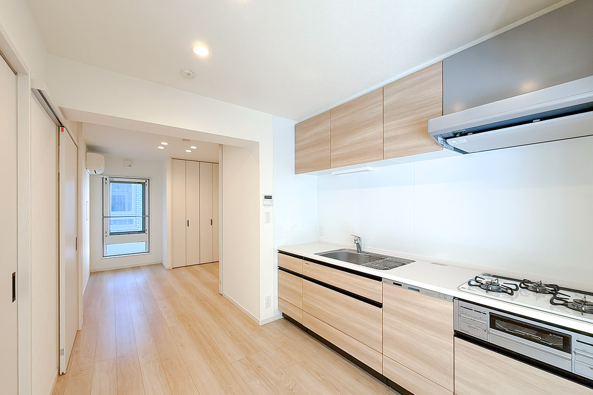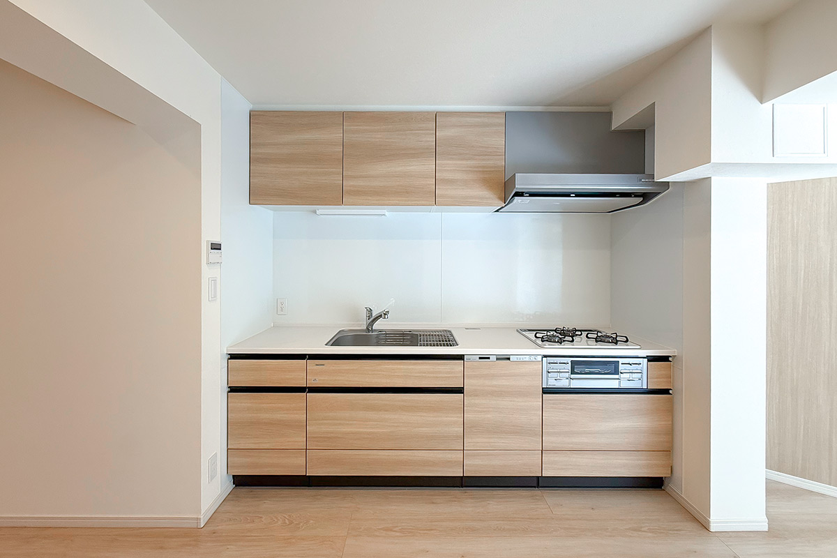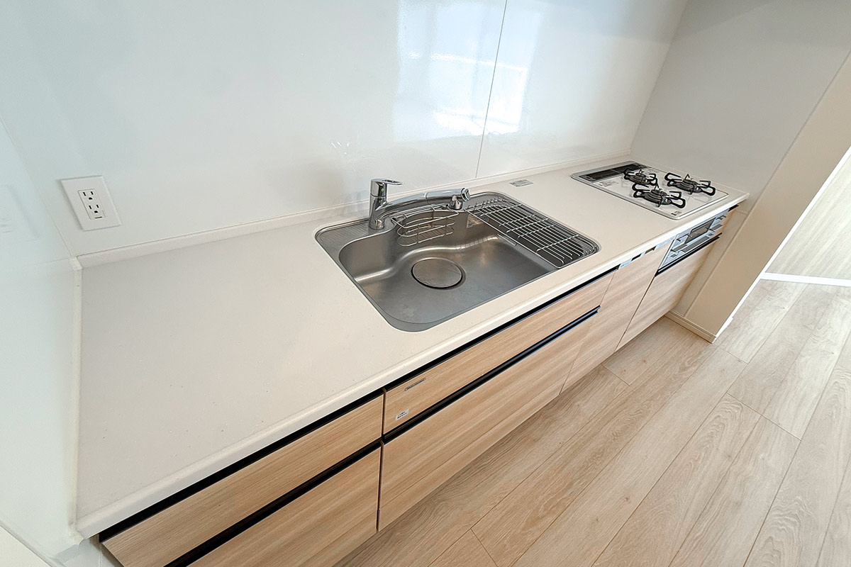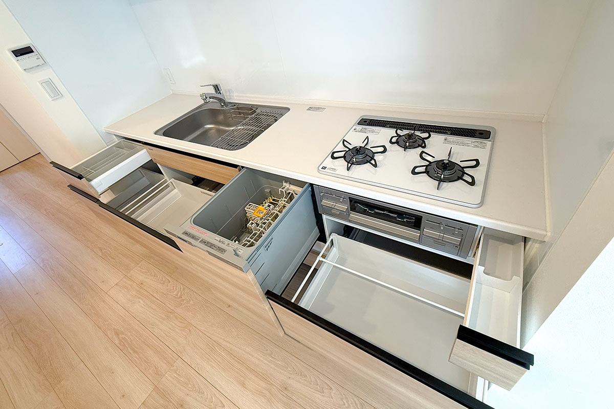 キッチンはグリル付き3口ガスコンロに食洗機も付いていて、作業スペースもゆとりがあり自炊派さんに嬉しい充実度◎