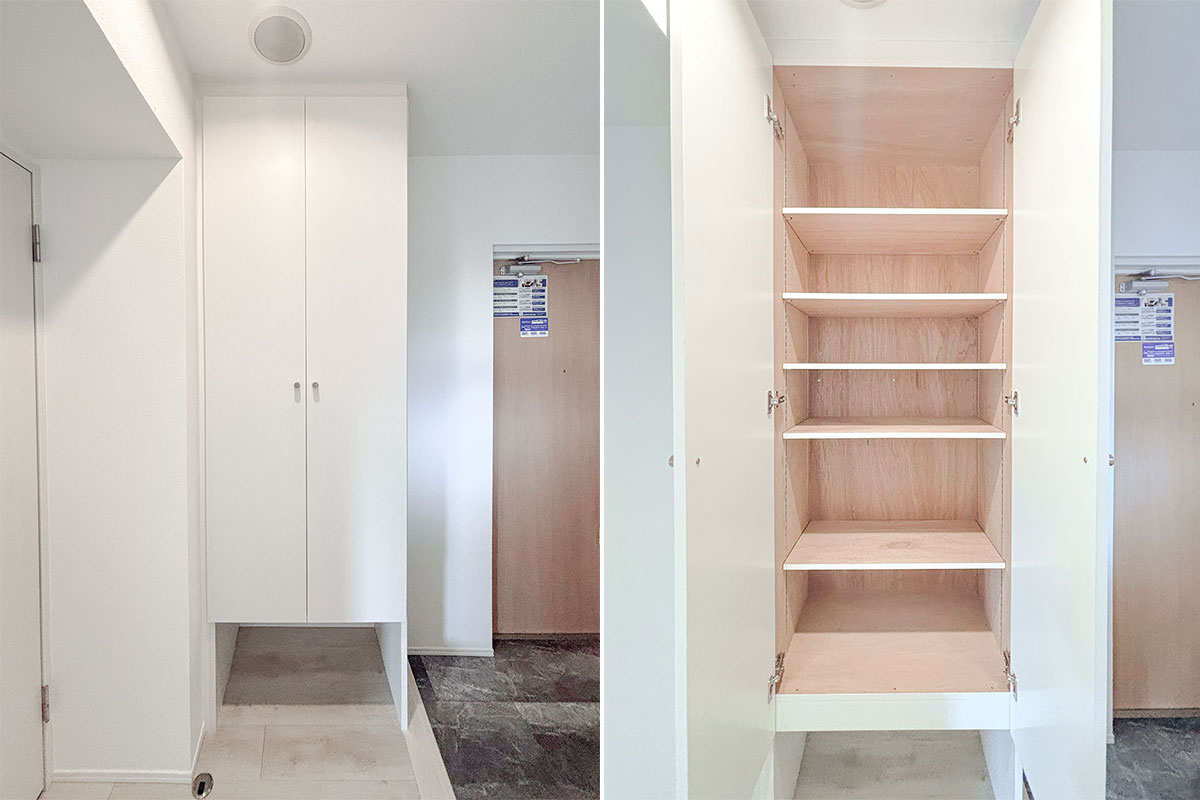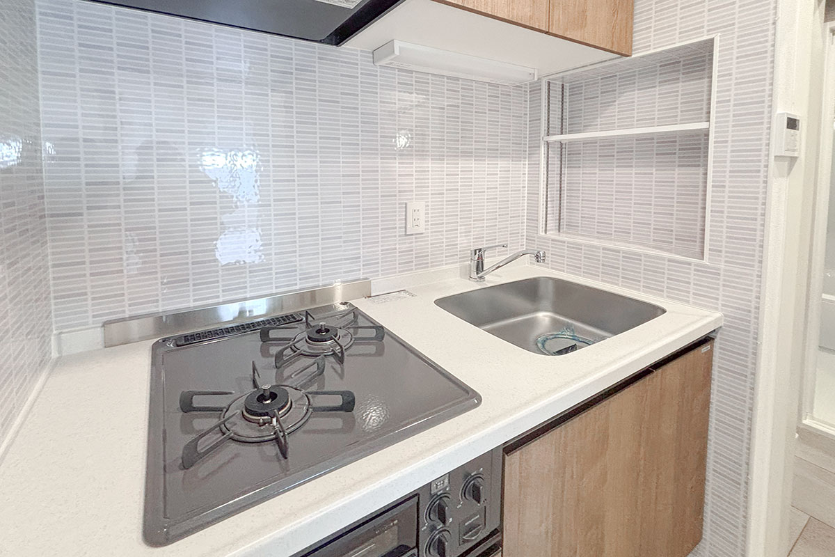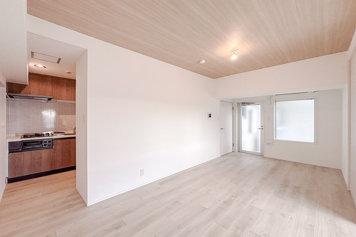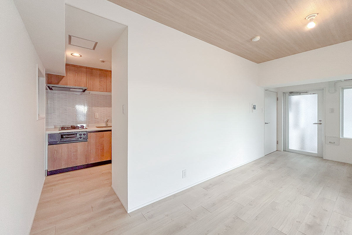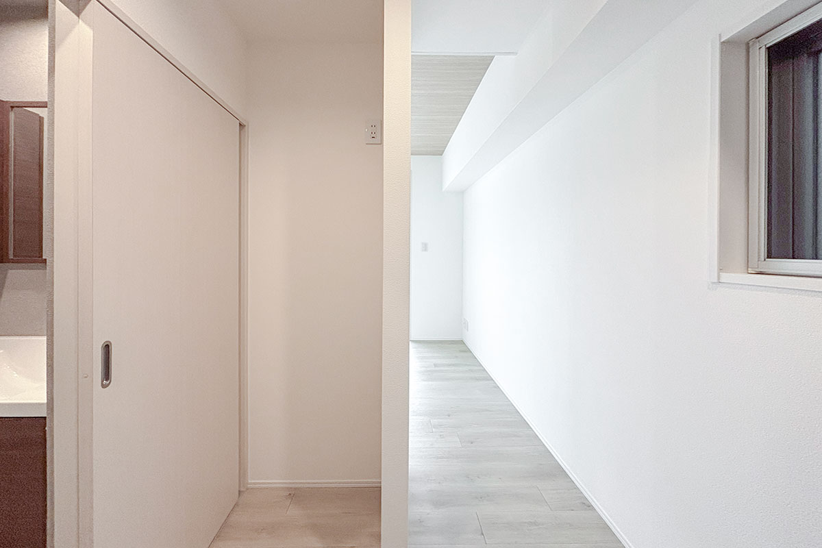 キッチン奥にバスルームなどの水回り空間が続いています。