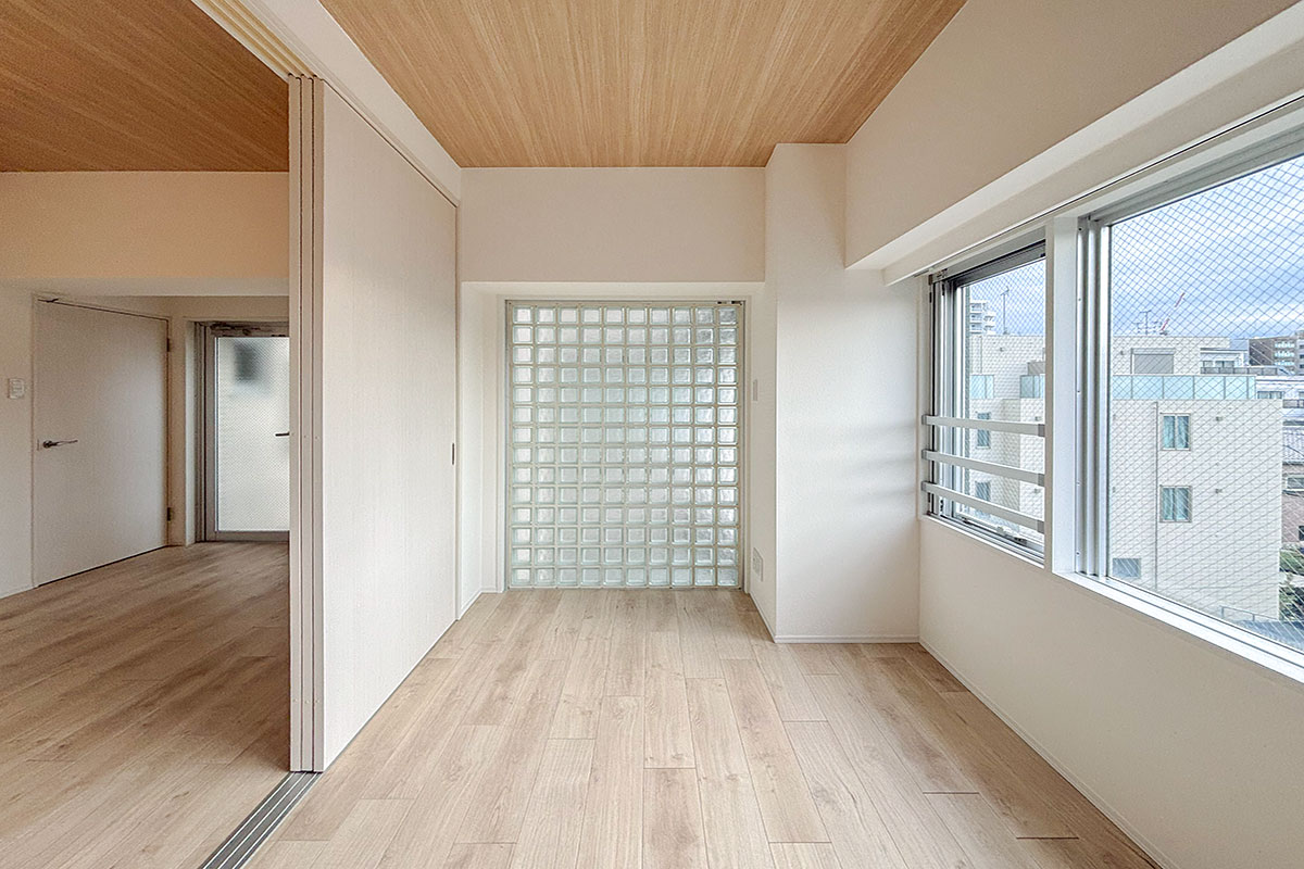 大きな窓とガラスブロックからの採光で明るい室内です。
