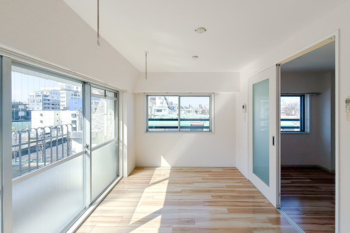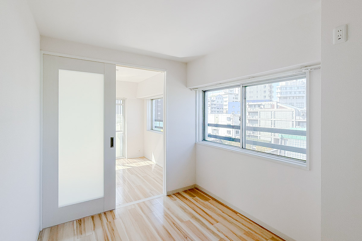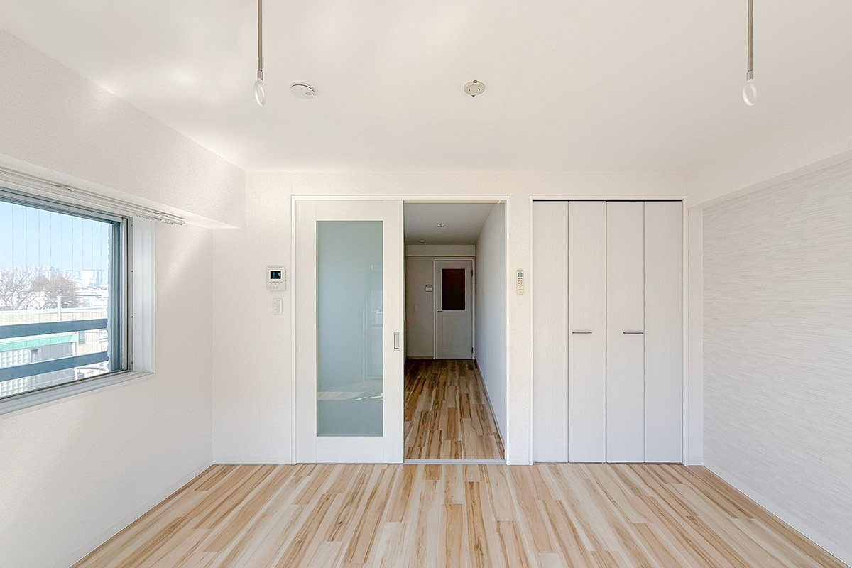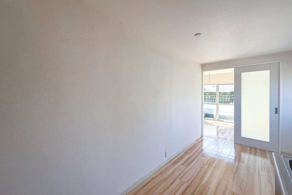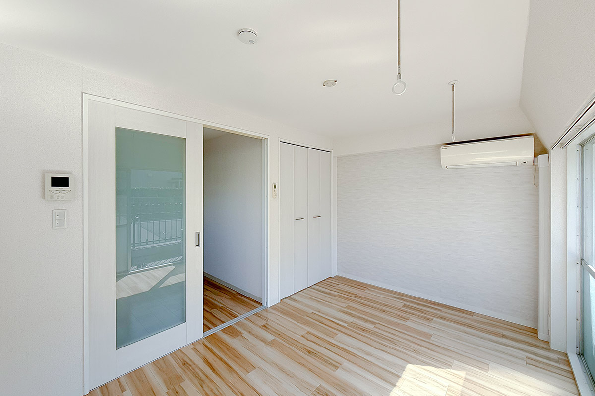 室内はナチュラルな質感の床材と淡いクロス、お部屋を隔てるガラス扉が爽やかな雰囲気。