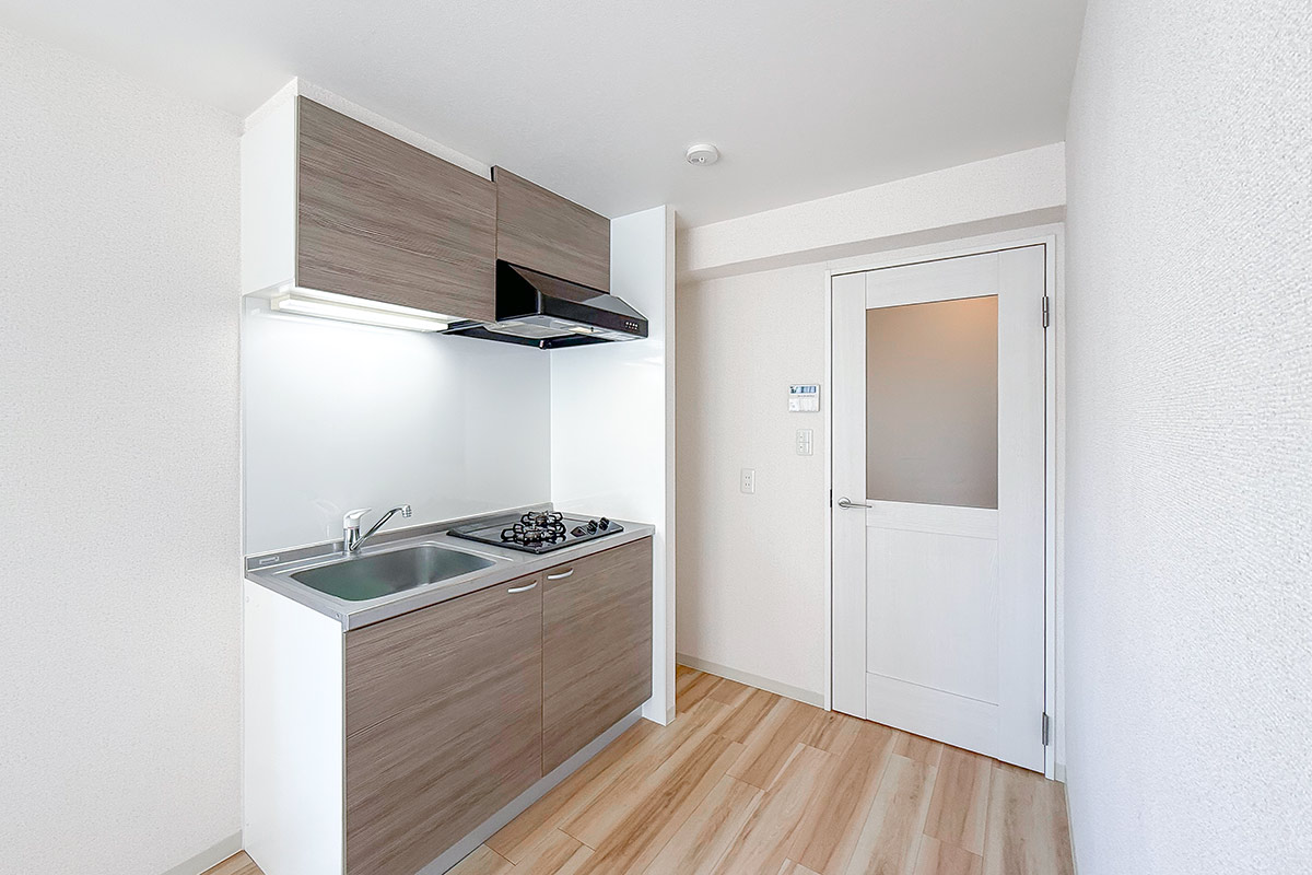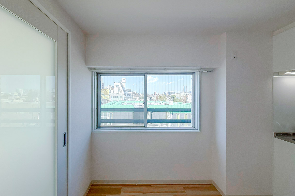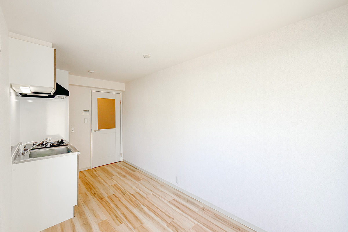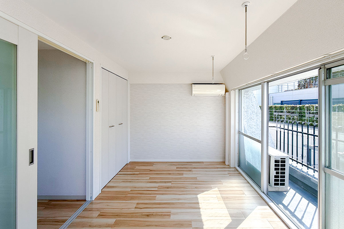 室内はナチュラルな質感の床材と淡いクロス、お部屋を隔てるガラス扉が爽やかな雰囲気。