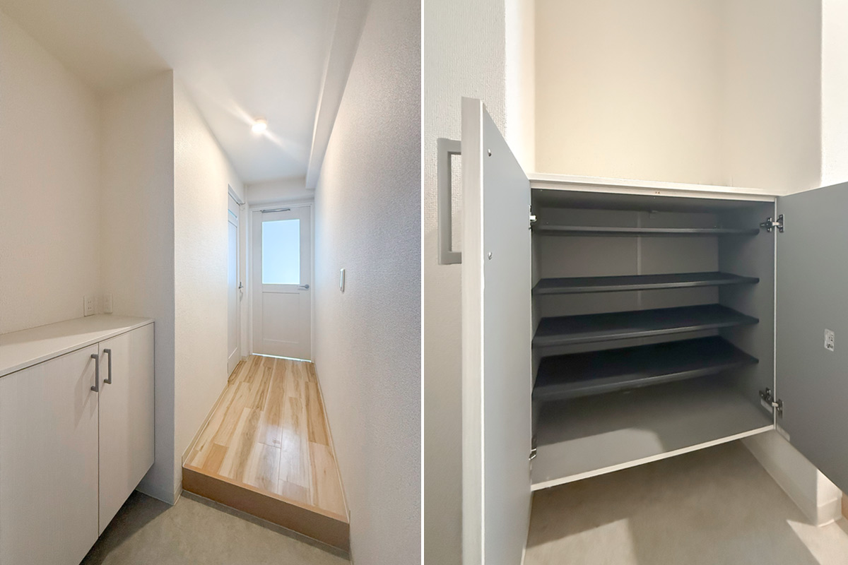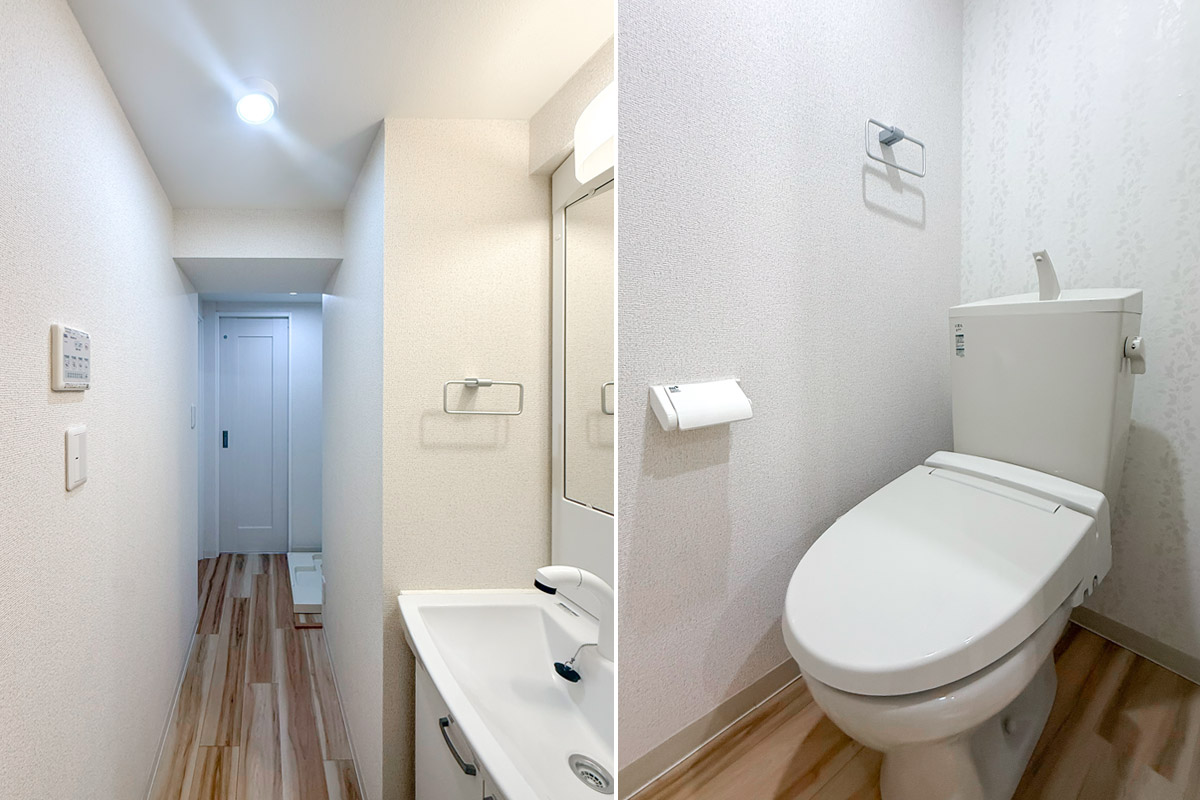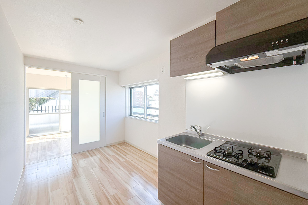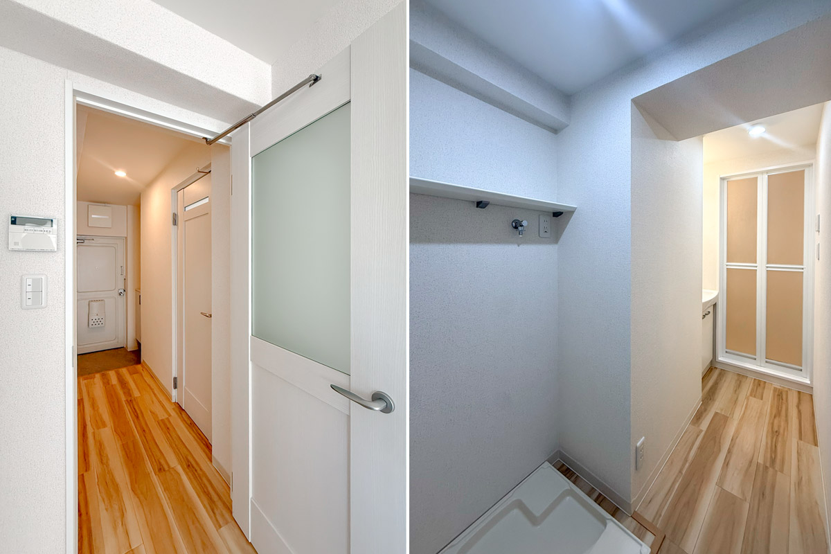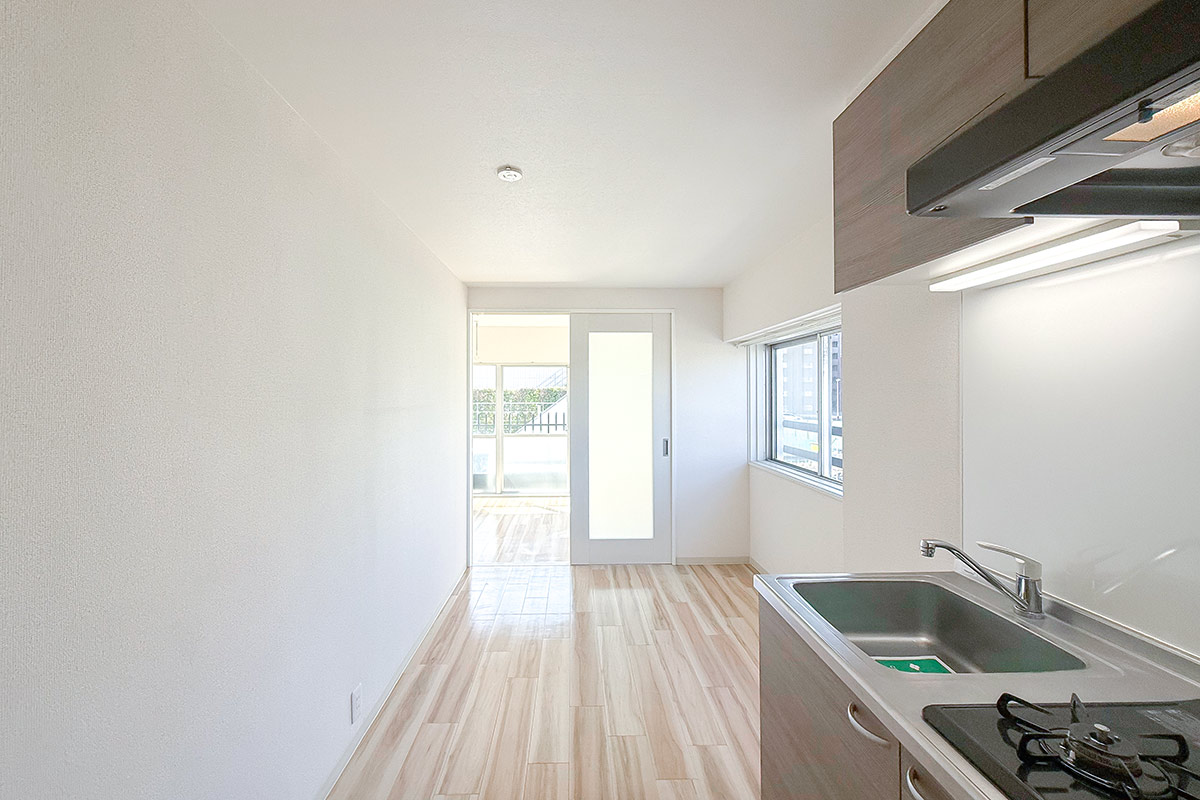 室内はナチュラルな質感の床材と淡いクロス、お部屋を隔てるガラス扉が爽やかな雰囲気。