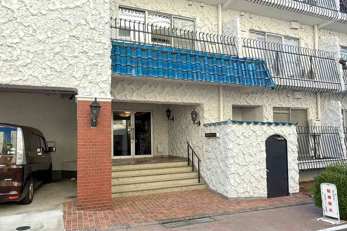 青い瓦屋根に白いスタッコ壁の塗り壁、アイアンフレームがシンボルの秀和レジデンス。