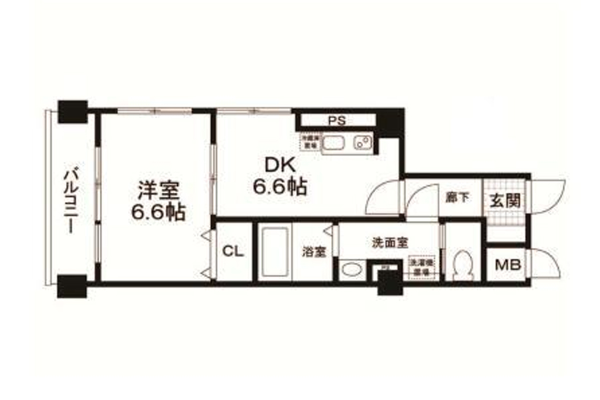 ダイニングと洋室、どちらも6.6帖のシンプルな間取り。